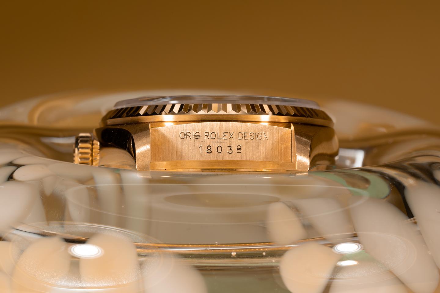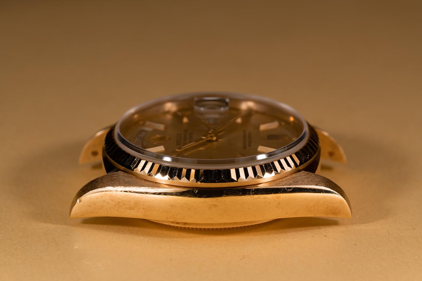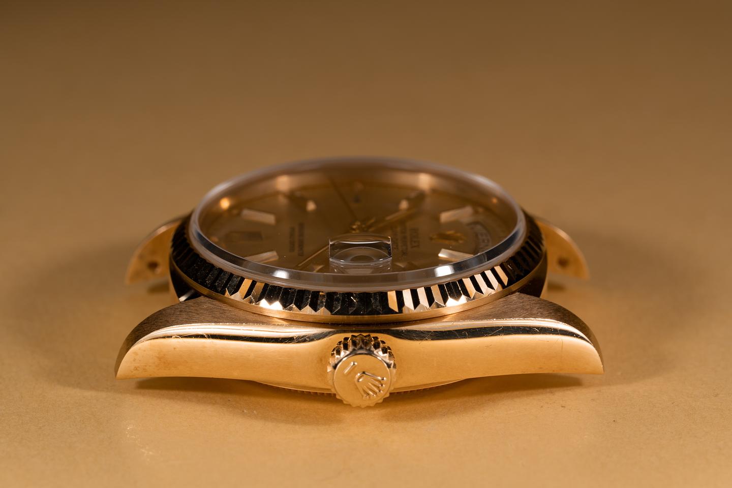 Case: The thick and even 18k yellow gold case appears to be unpolished showing some light wear for its age. The sharp 18k fluted bezel is also in excellent condition showing only light wear for its age.