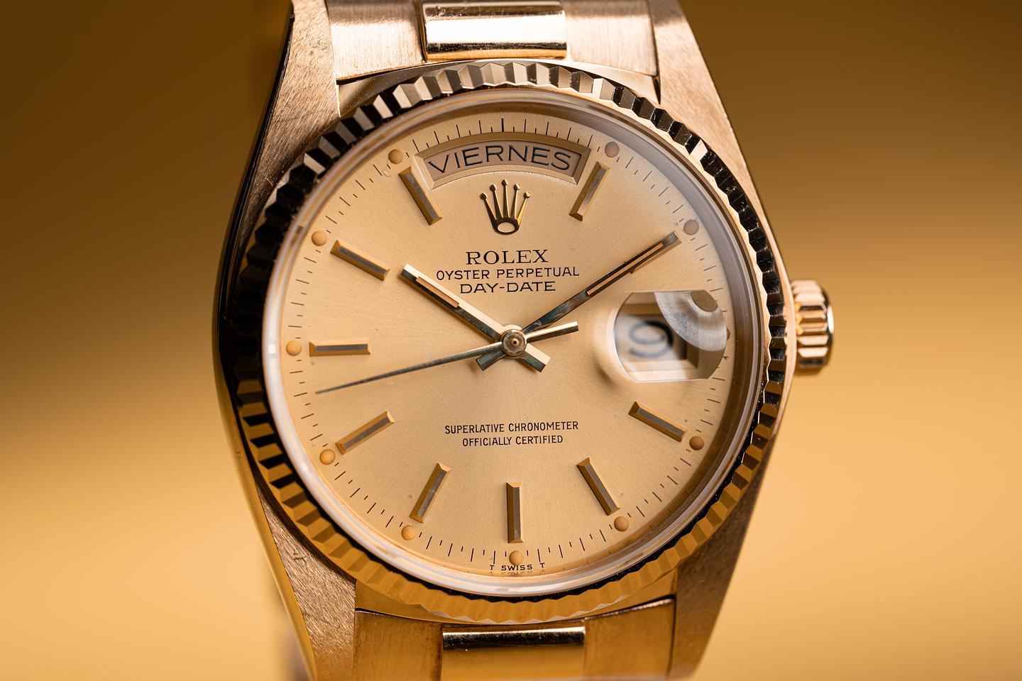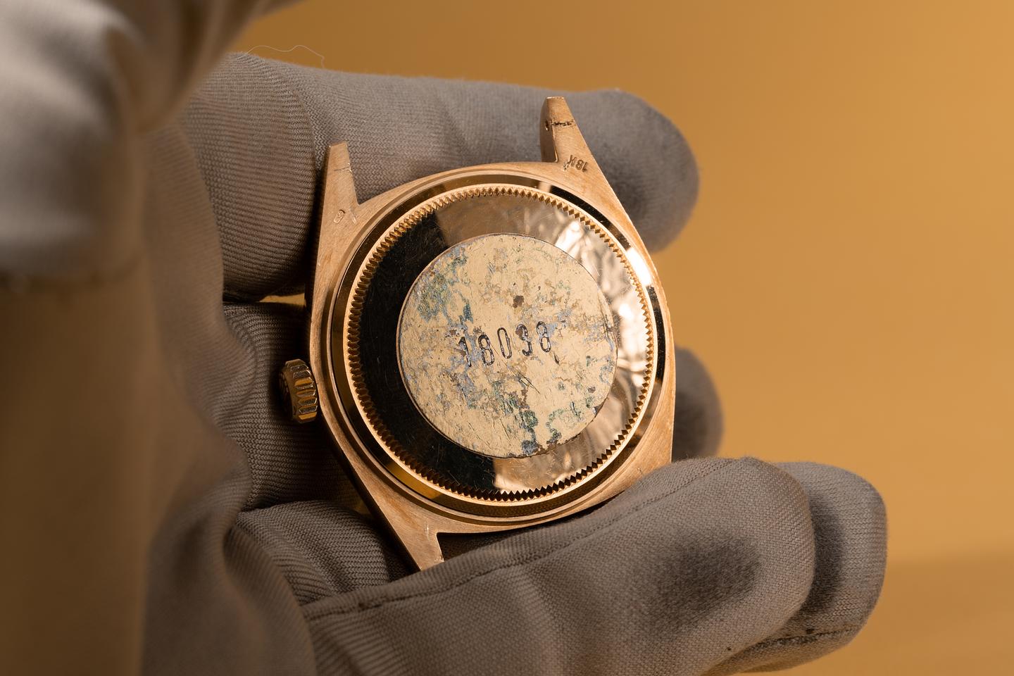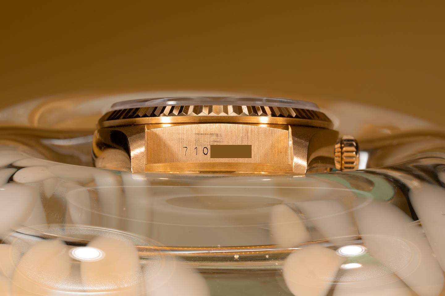 Case: The thick and even 18k yellow gold case appears to be unpolished showing some light wear for its age. The sharp 18k fluted bezel is also in excellent condition showing only light wear for its age.