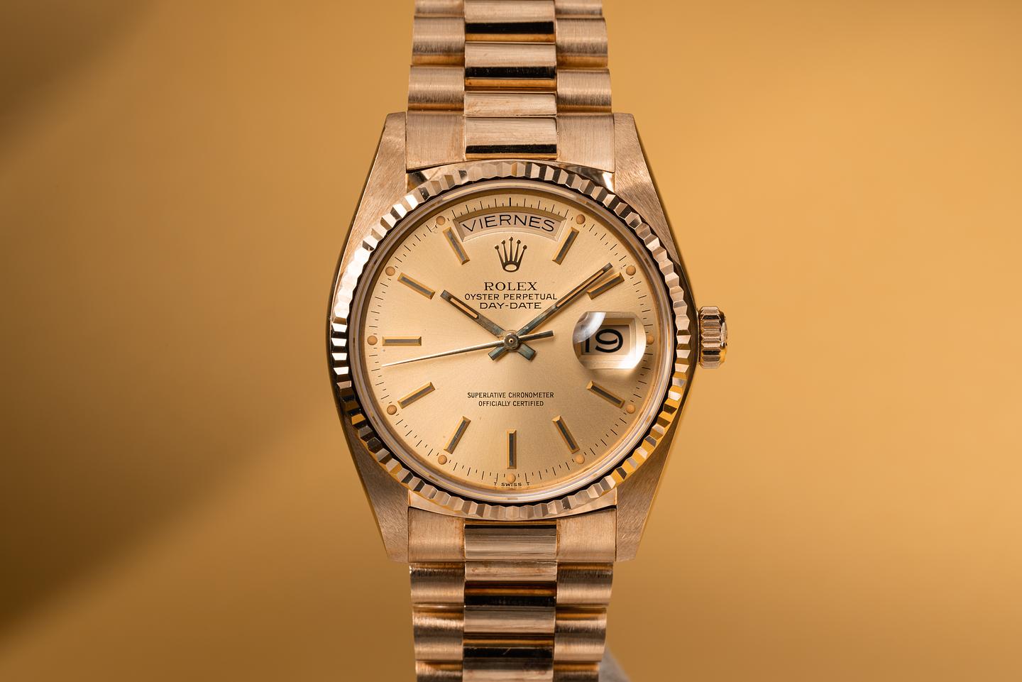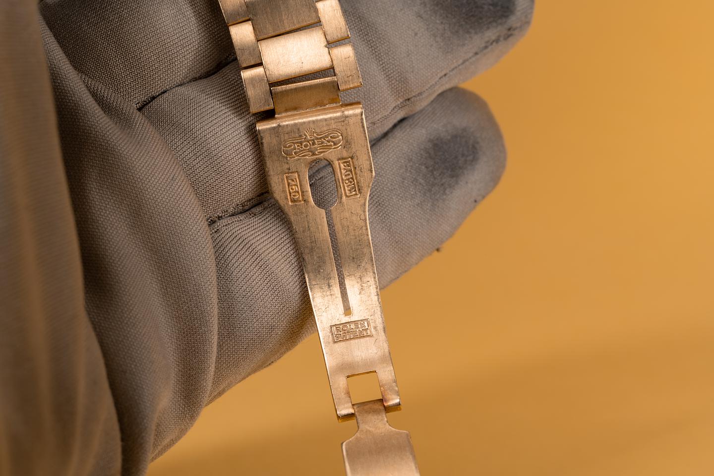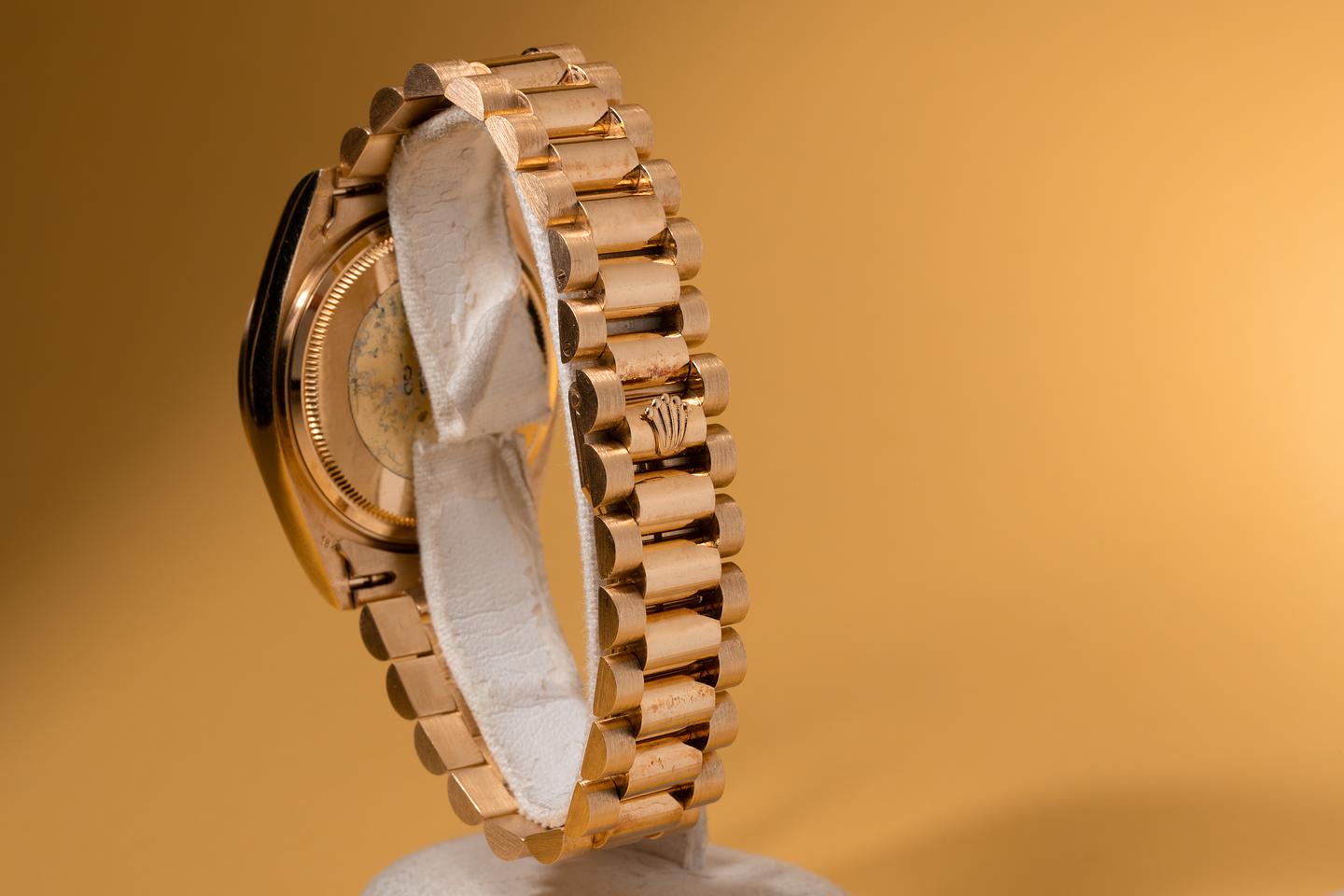 Bracelet: The 21 link 18k yellow gold president bracelet is excellent showing only very light stretch for its age.