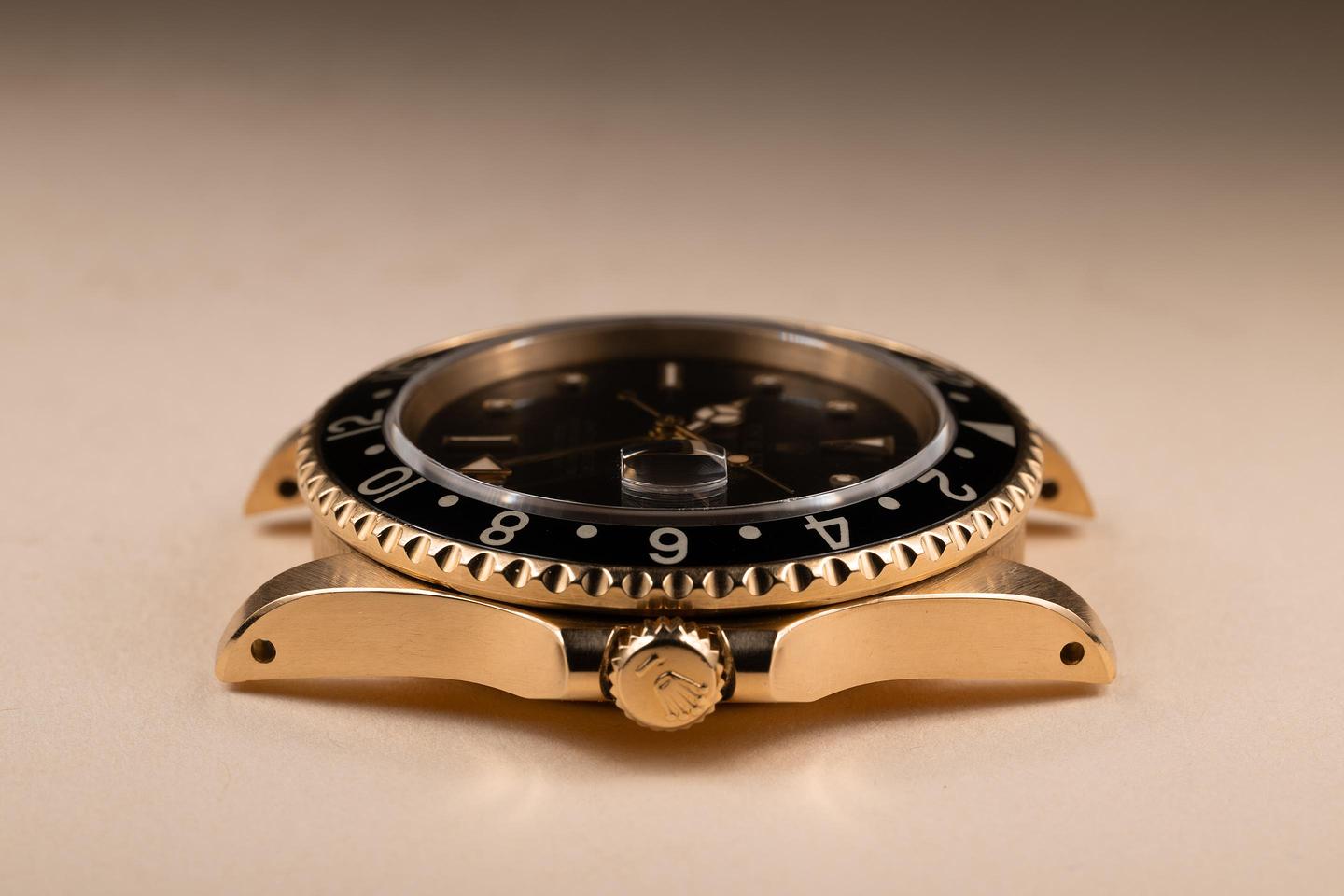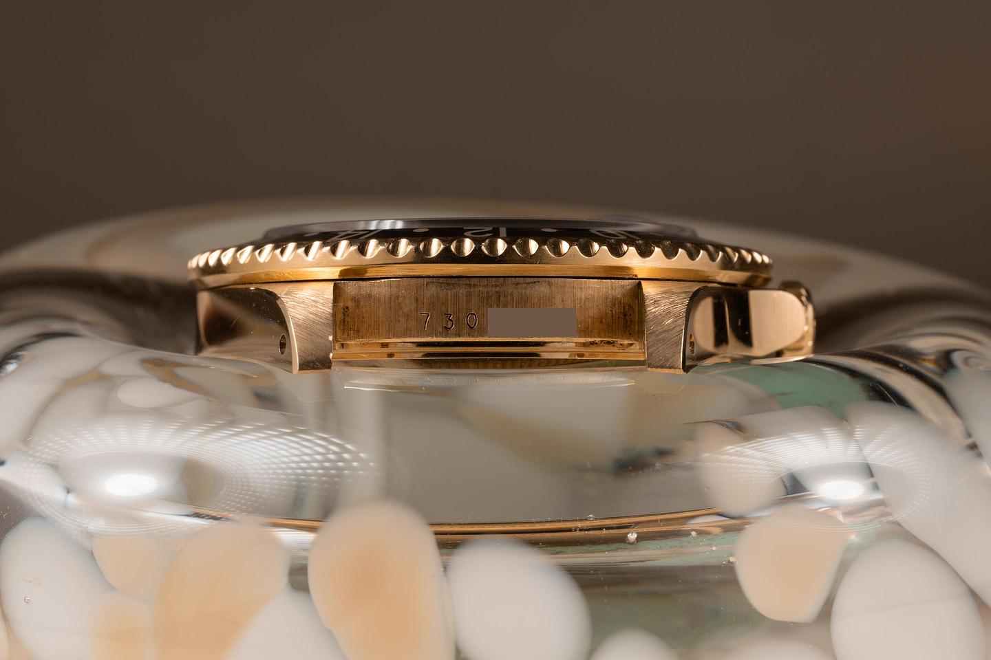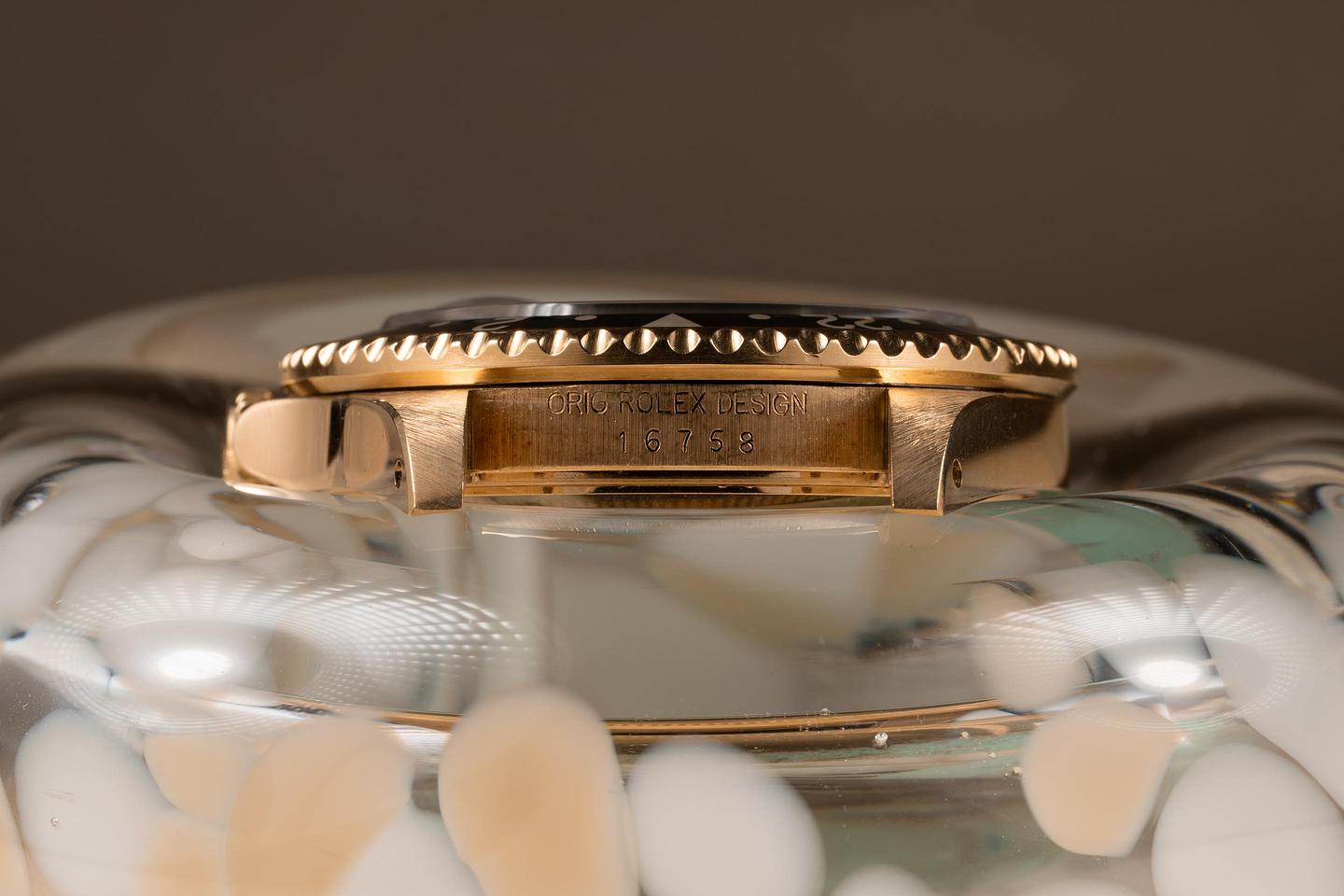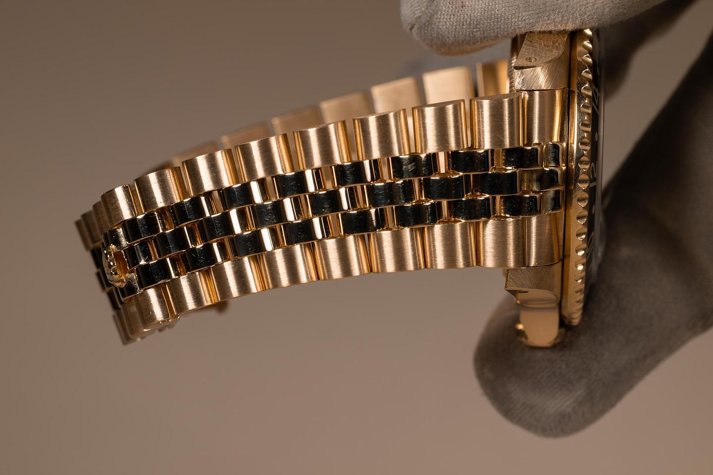 Case: The thick and even 18K yellow gold case is excellent, showing sharp prominent bevels and only very light wear from use. The black bezel insert is also in excellent condition, showing only very light wear from use.