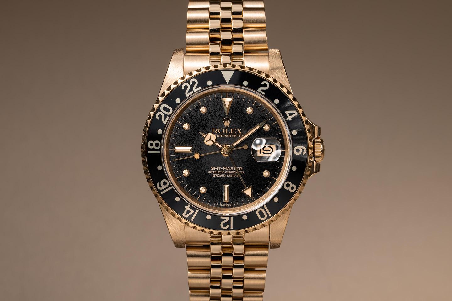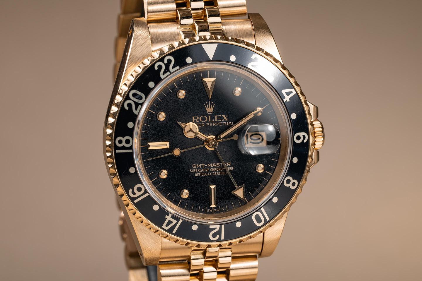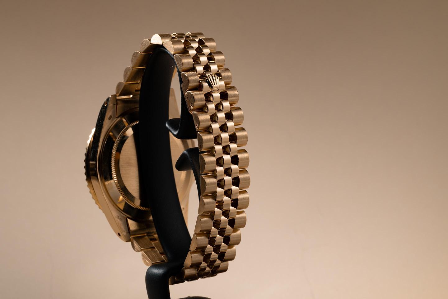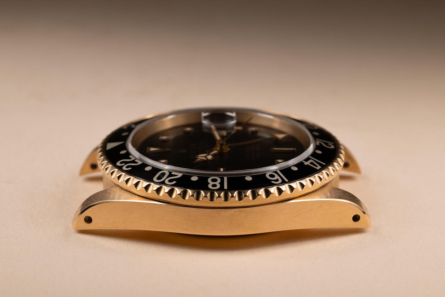 Case: The thick and even 18K yellow gold case is excellent, showing sharp prominent bevels and only very light wear from use. The black bezel insert is also in excellent condition, showing only very light wear from use.