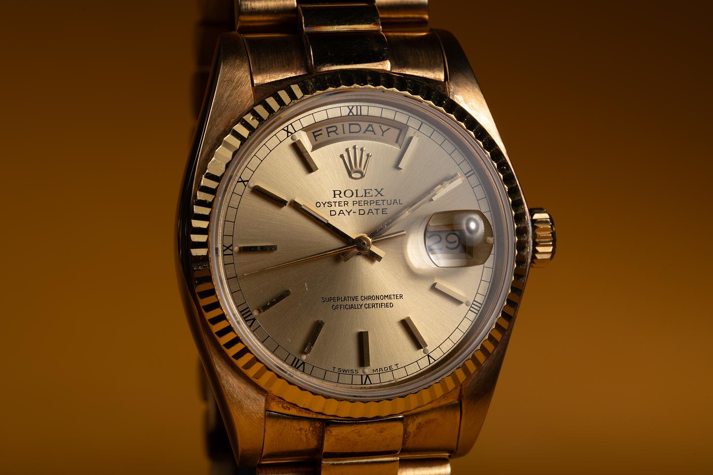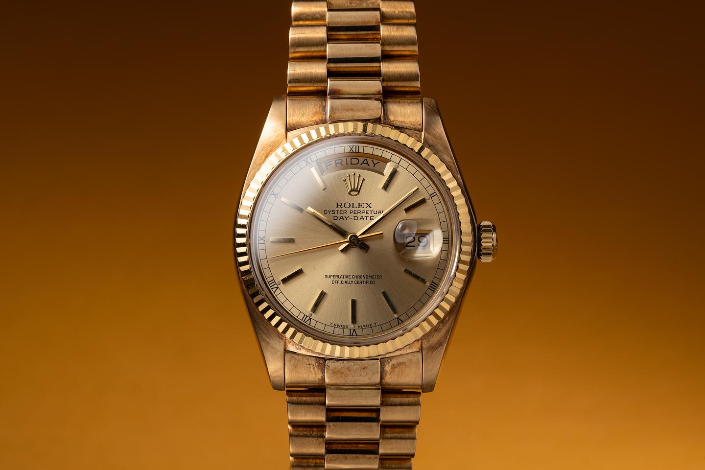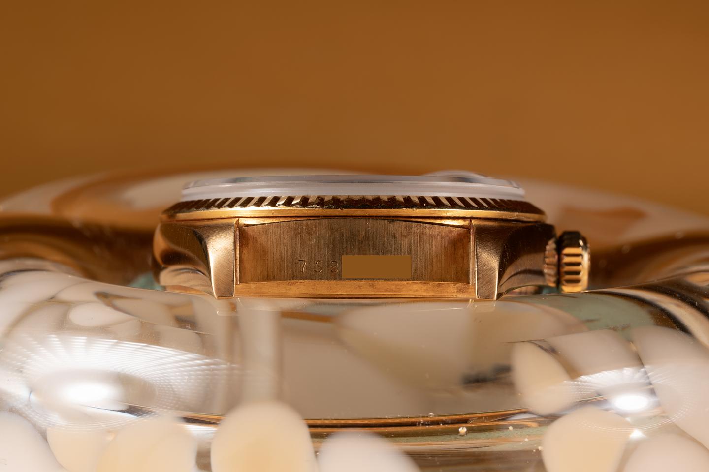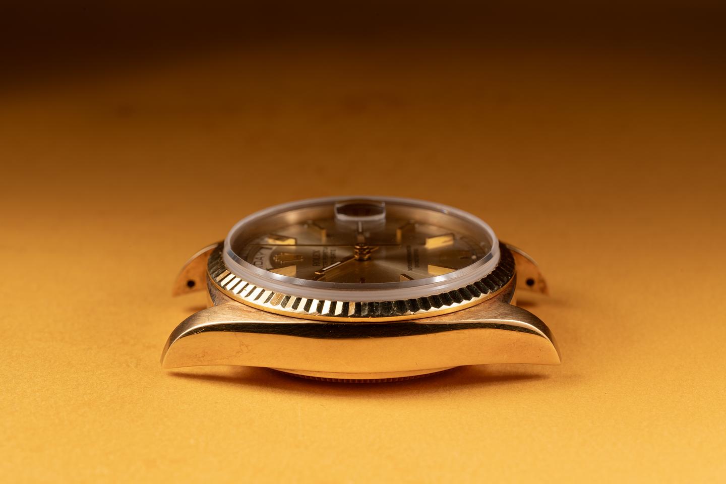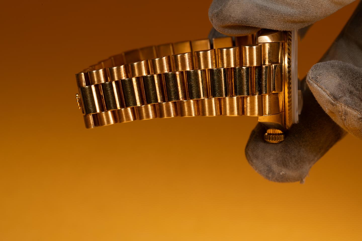 Bracelet: The 23 link 18k yellow gold President bracelet is excellent showing a rosy purple patina and only very light stretch.