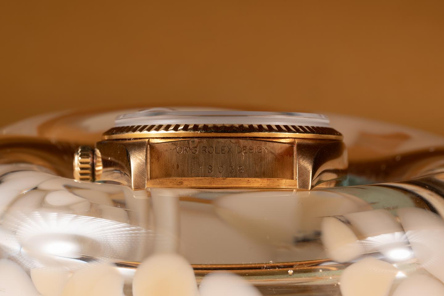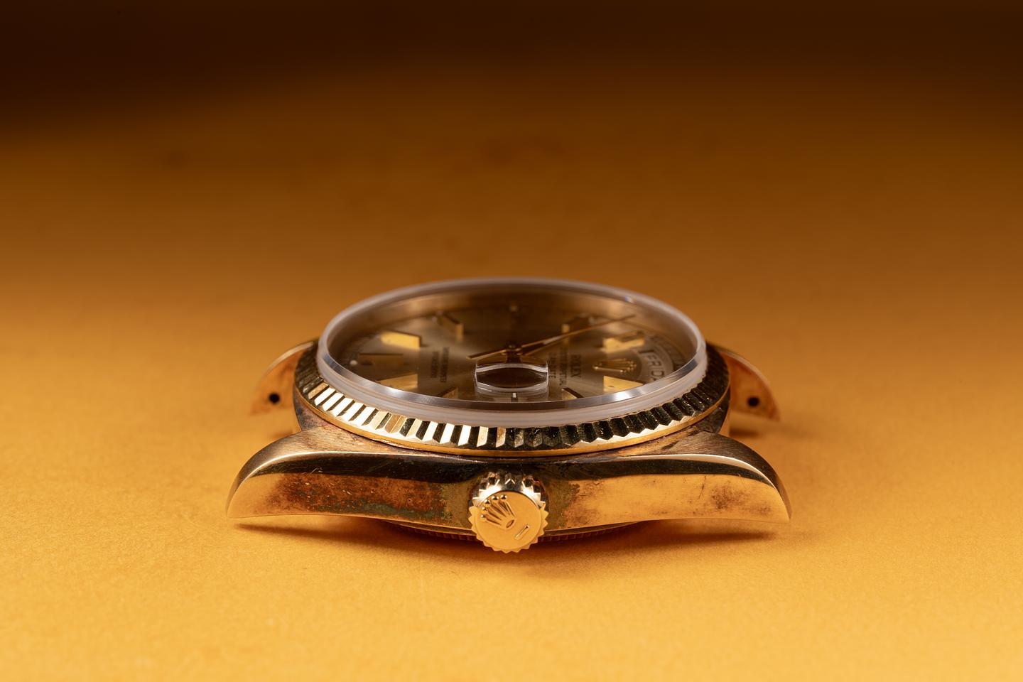 Case: The thick 18k yellow gold case is excellent showing some vibrant rosy purple patina form age and only light wear. The 18k yellow gold fluted bezel is also in excellent condition showing a warm rosy patina.