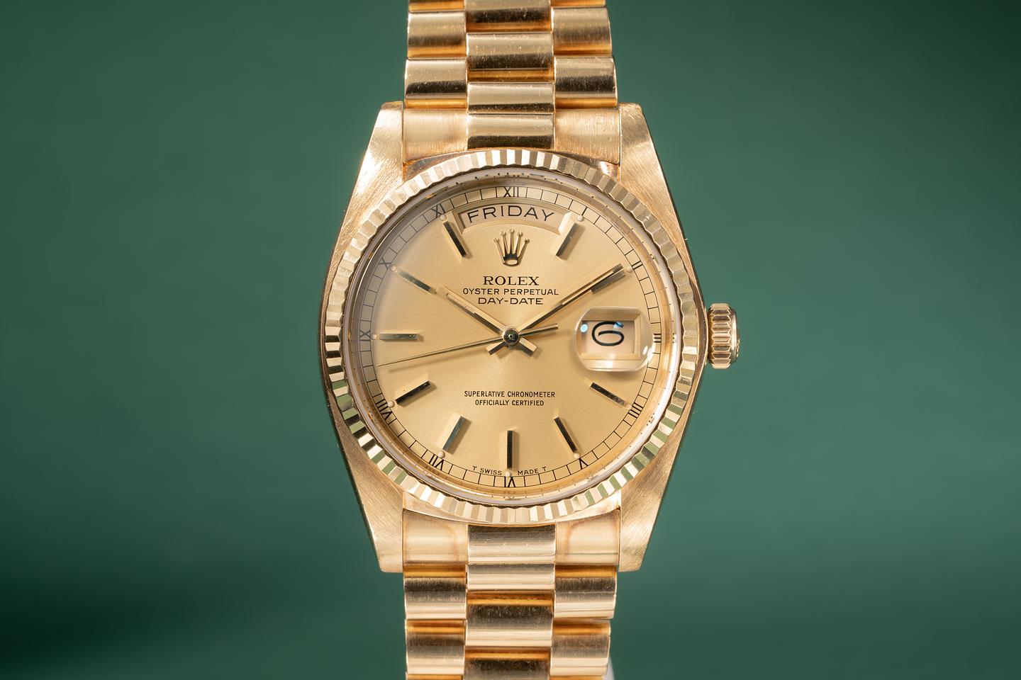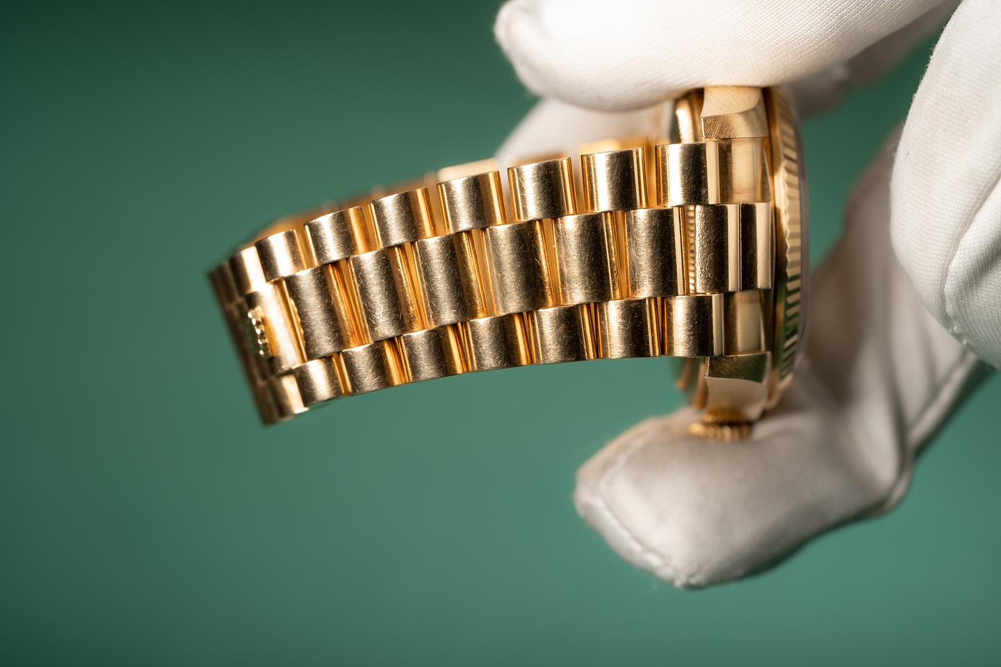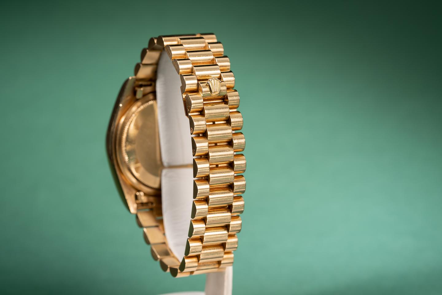 Bracelet: The 20 link 18k yellow gold president bracelet is excellent showing average stretch for its age.