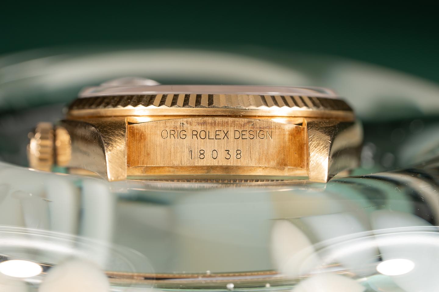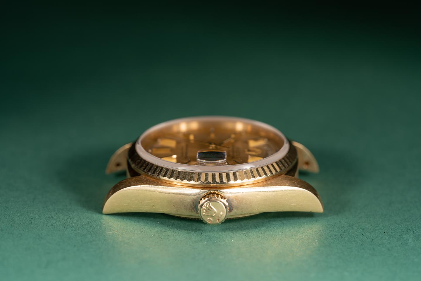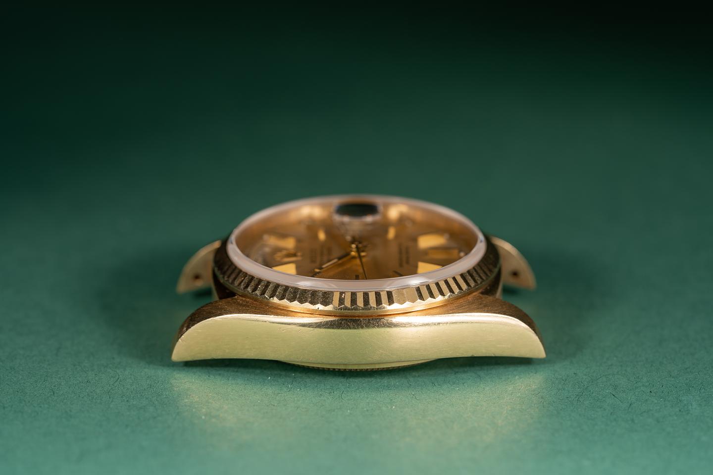 Case: The thick and even 18k yellow gold case is excellent and shows light wear for its age. The sharp 18k yellow gold fluted bezel is also excellent showing only light wear. There is a light rosy patina on the case and bezel.