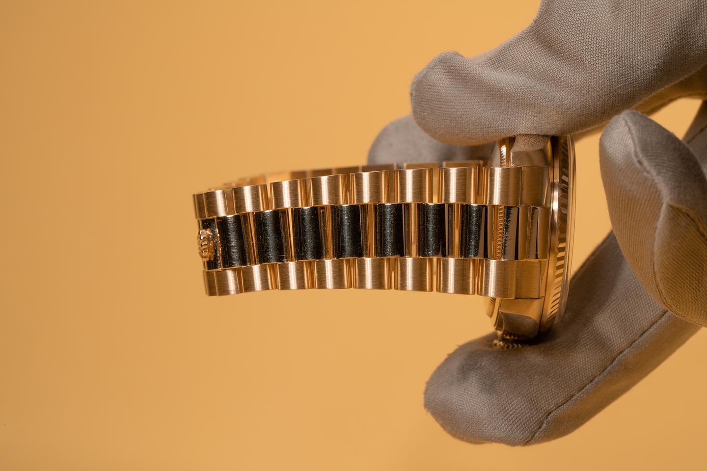 Bracelet: The 22 link 18k yellow gold president bracelet is excellent showing only very light stretch for its age. The clasp is stamped with a 1984 date code.