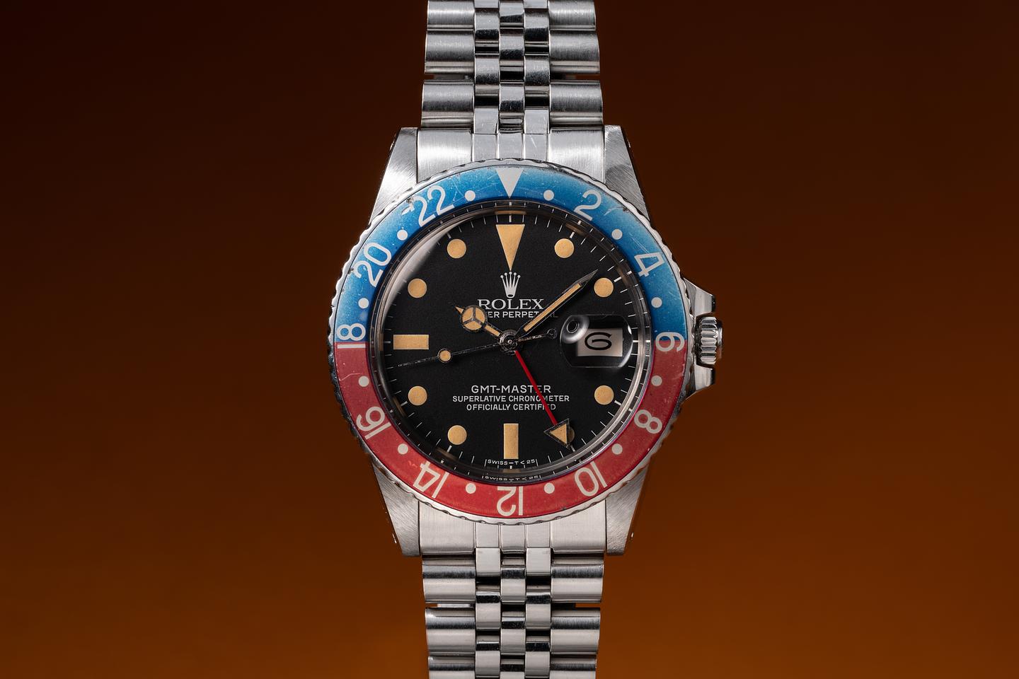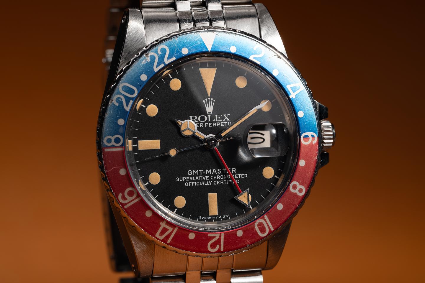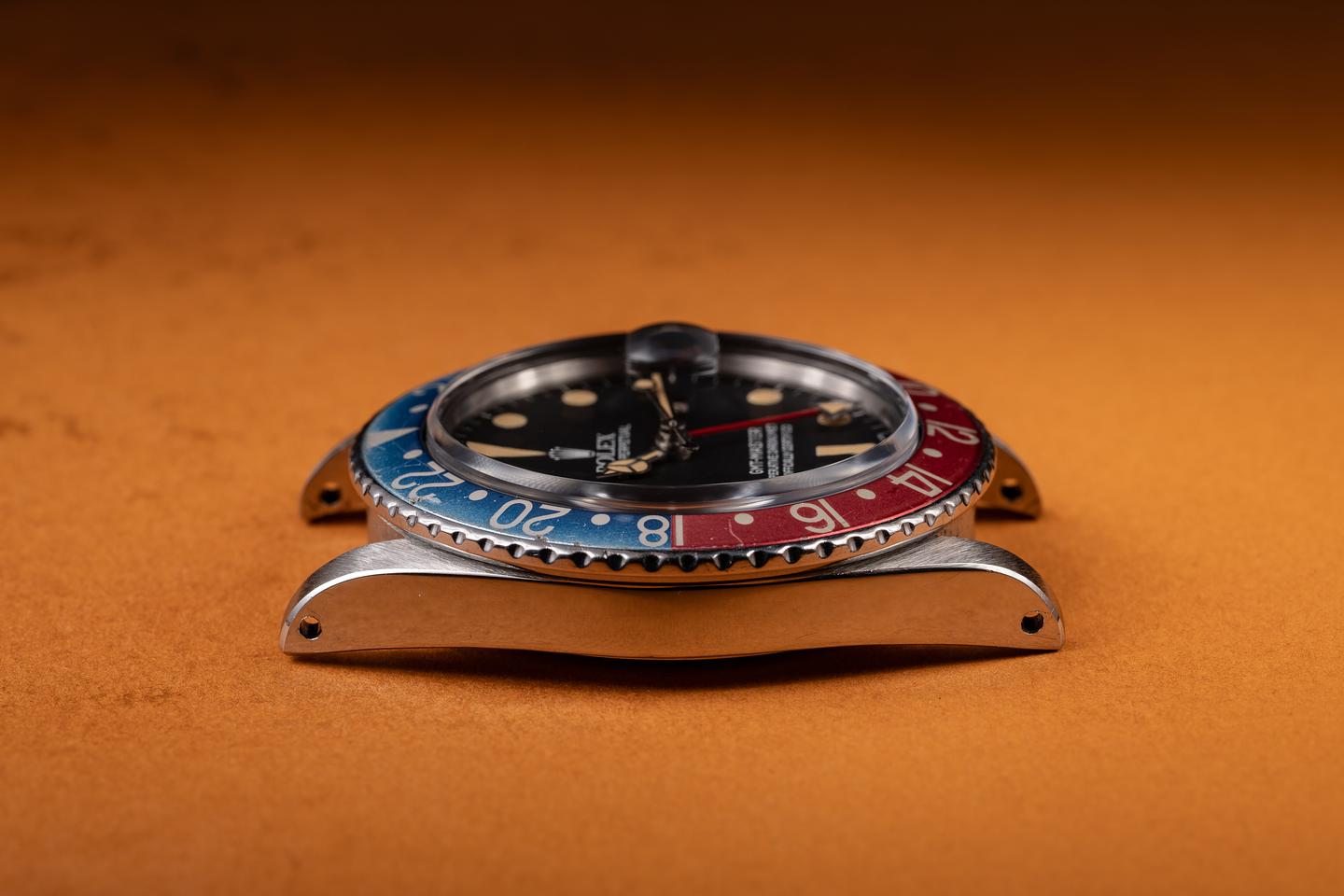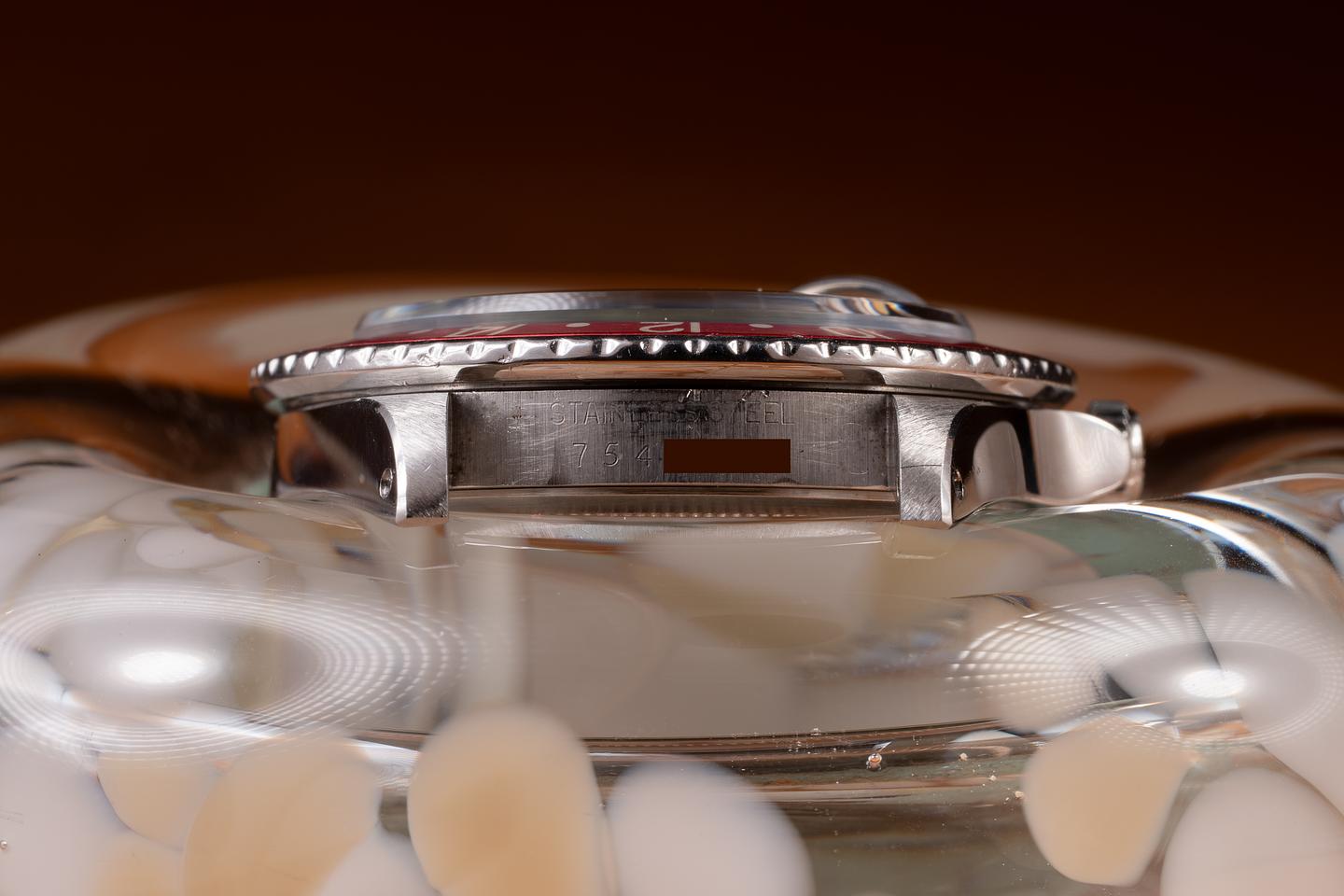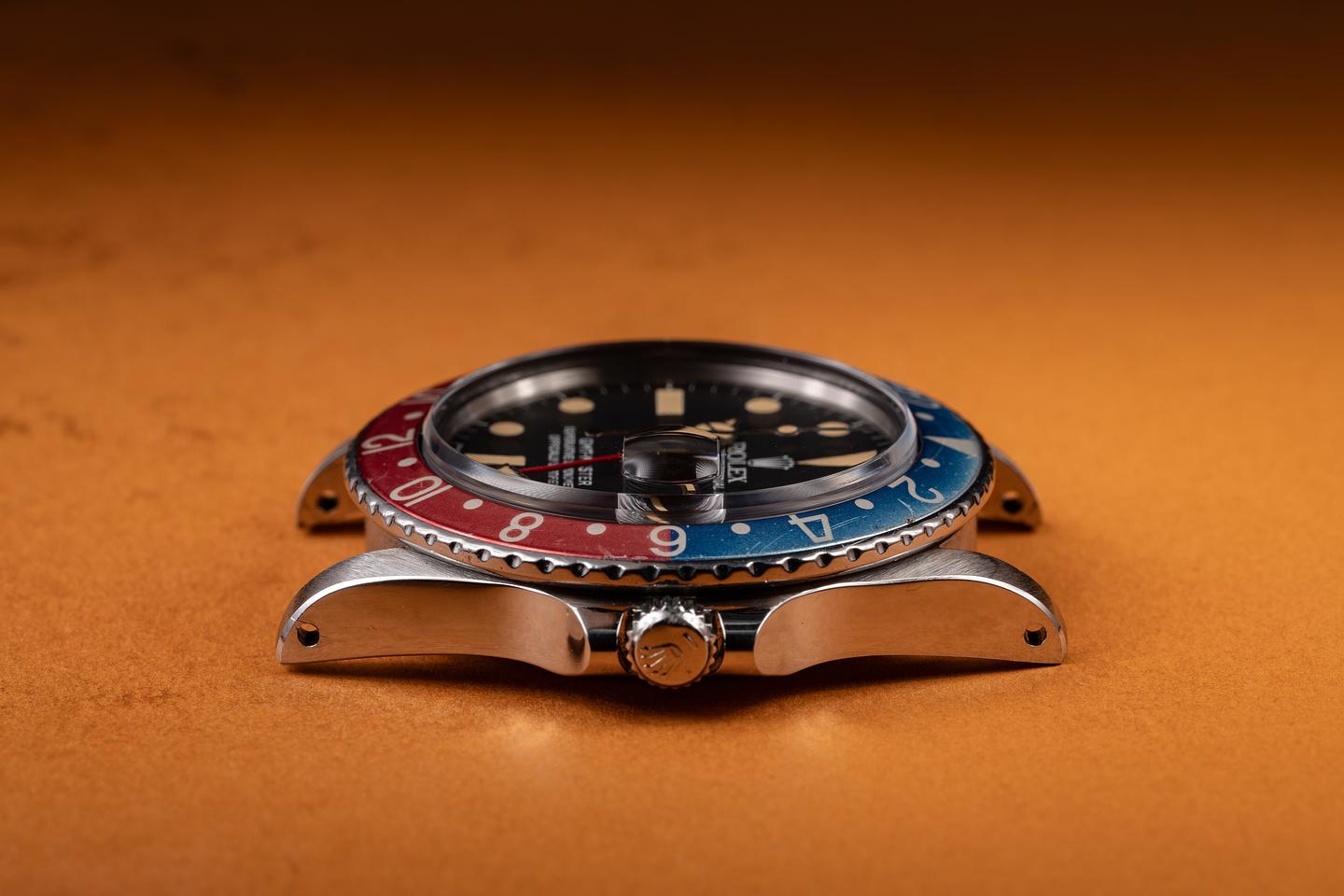 Case: The recently polished case is excellent, showing sharp, prominent bevels and only light wear from use. The blue and red "Pepsi" bezel is also in excellent condition, showing fading to both portions of the insert.
