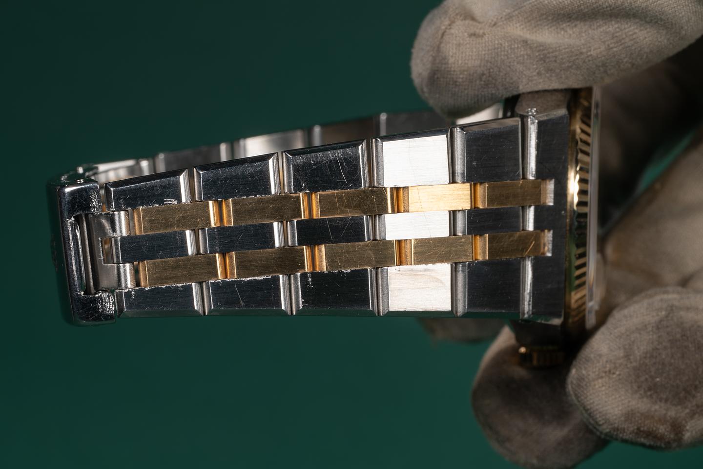 Case: The case is excellent, showing prominent beveling and some light wear from use. The 18K yellow gold fluted bezel is also in excellent condition, showing some light wear from use.