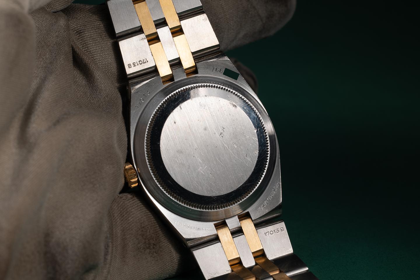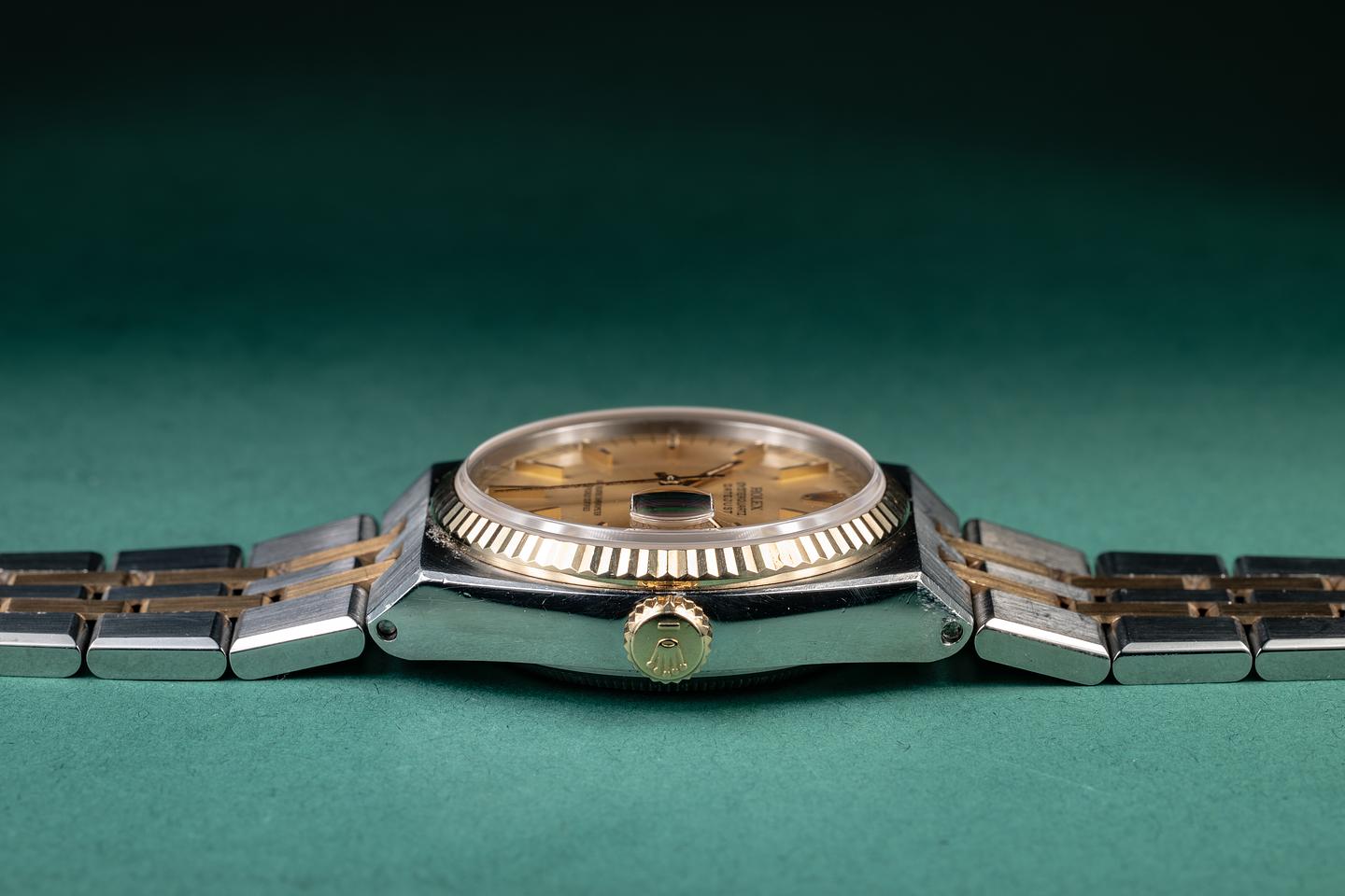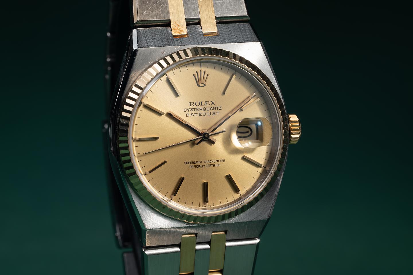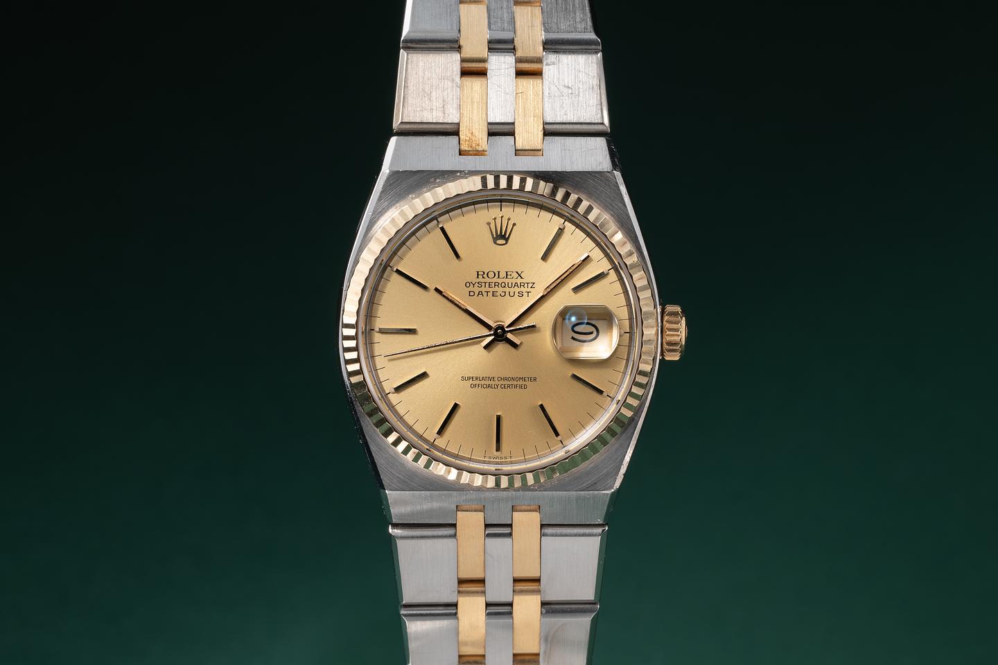 Bracelet: The 12-link two-tone OysterQuartz bracelet is excellent, showing only light stretch for its age. The clasp is stamped with a matching 1983 date code.