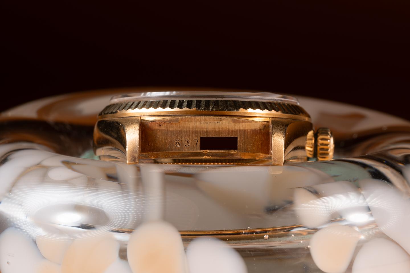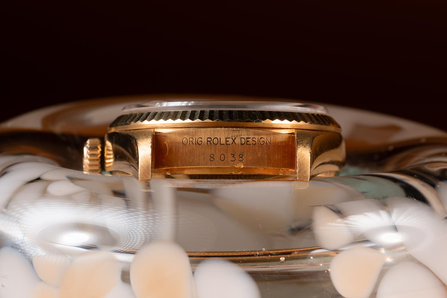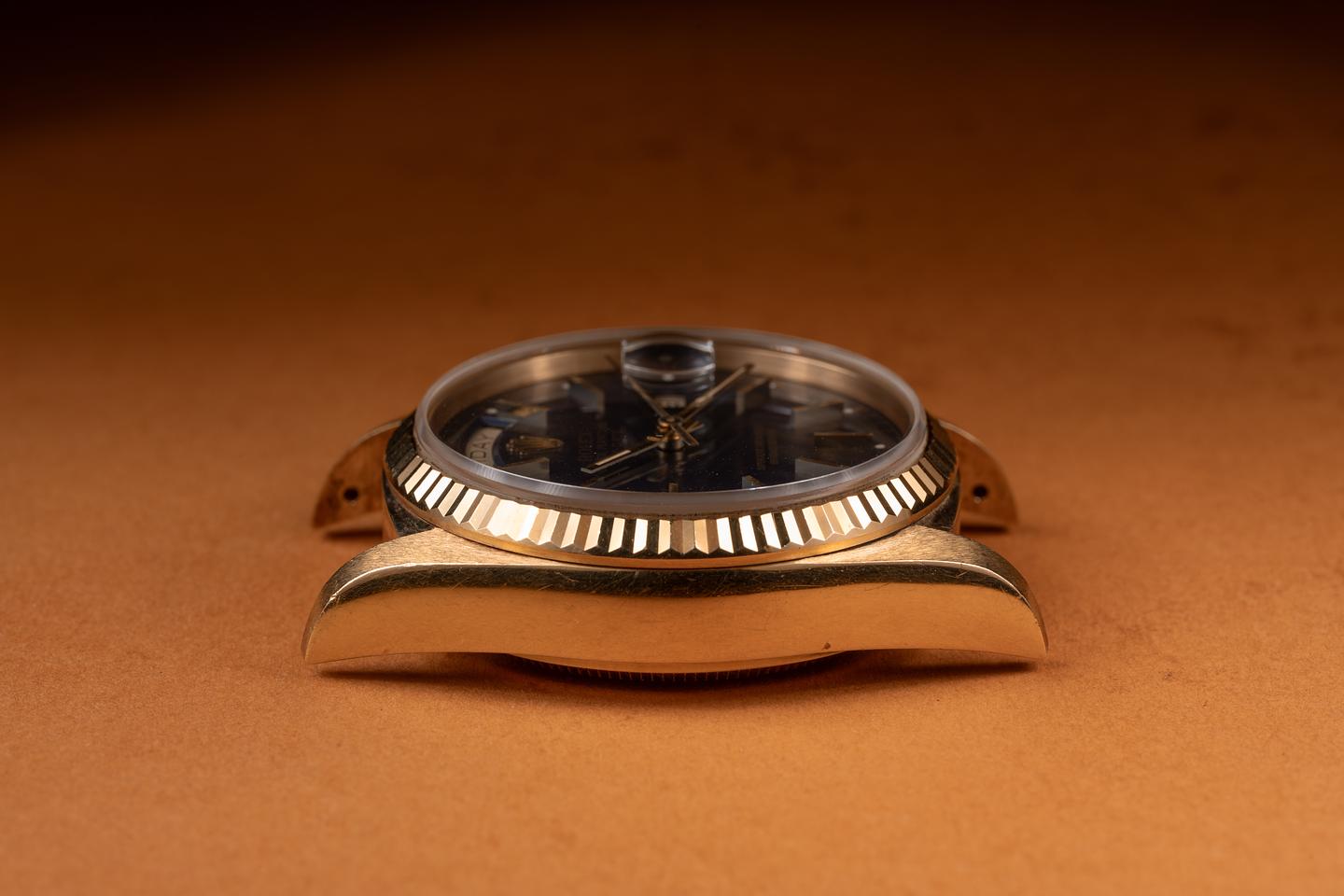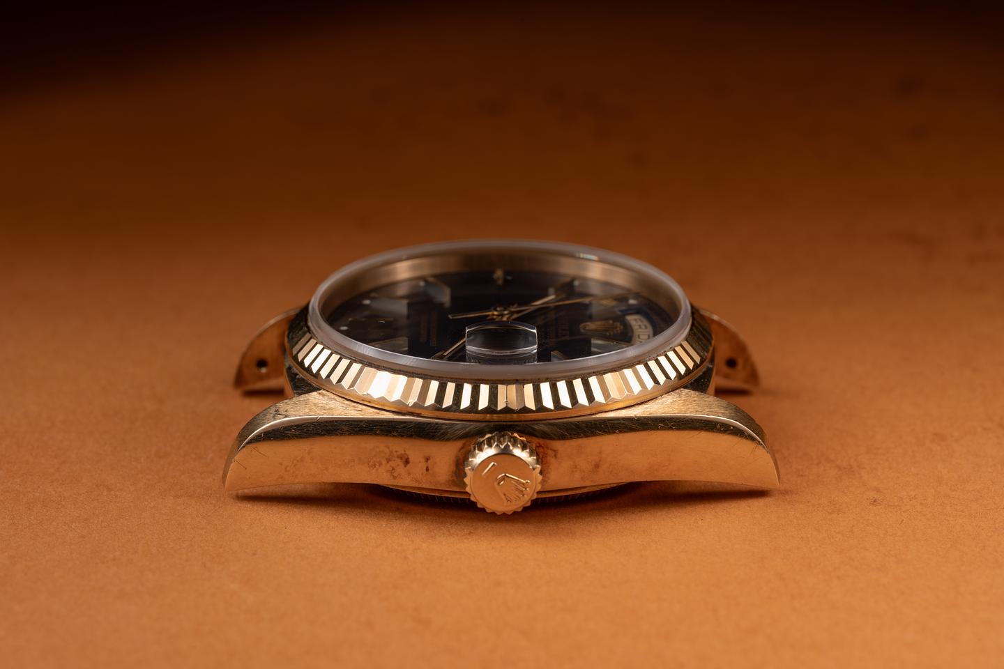 Case: The sharp 36mm case is excellent showing a warm rosy patina and only light wear from use. The 18K yellow gold fluted bezel is also in excellent condition showing a warm rosy patina and only light wear form use.