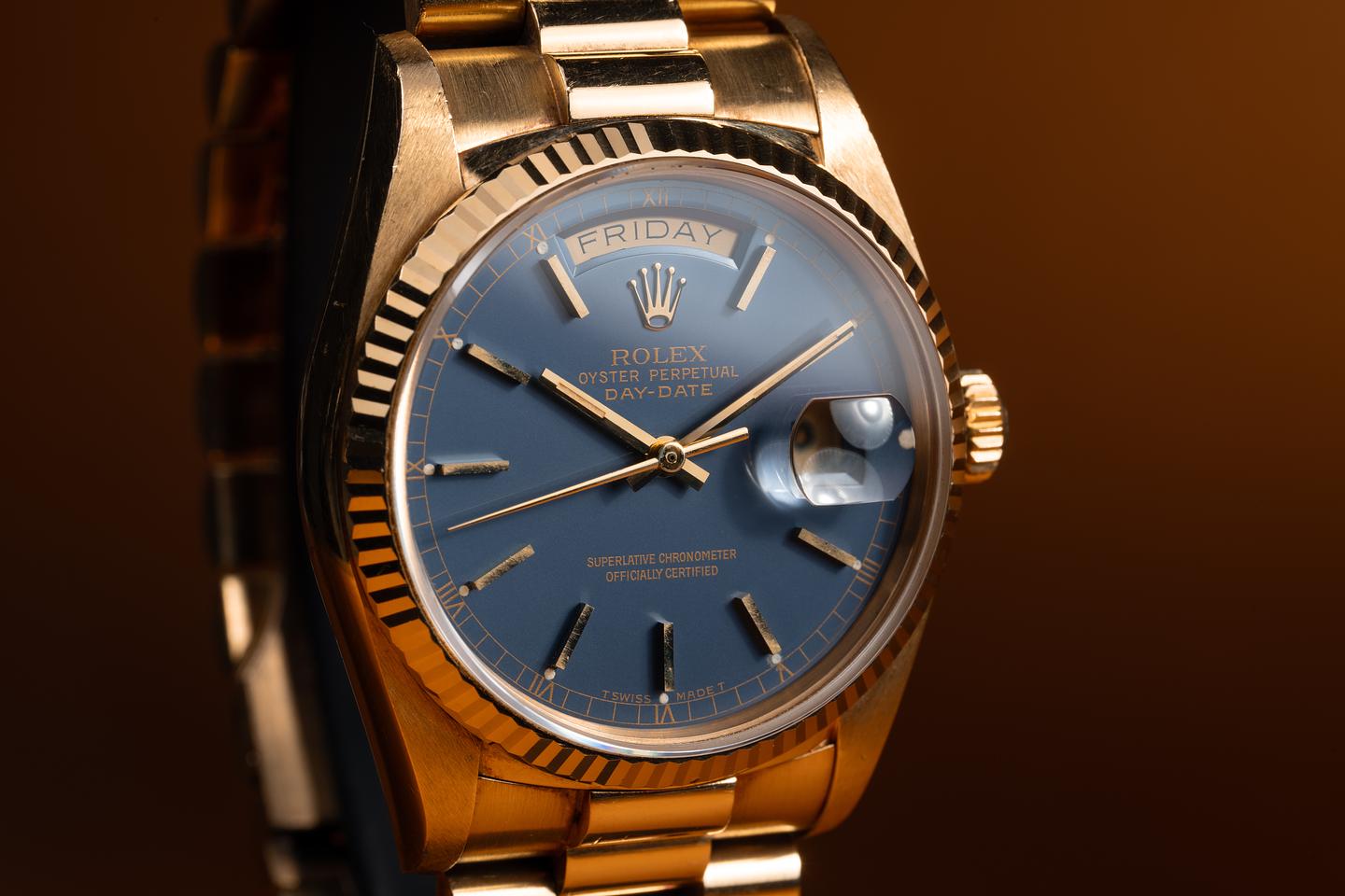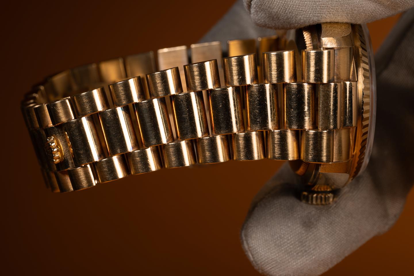 Bracelet: The 22 link 18K yellow gold President bracelet is excellent showing only very light stretch and a warm rosy patina. The clasp is stamped with a matching 1984 date code. The bracelet will fit up to a 17.2cm. / 6.77" wrist.