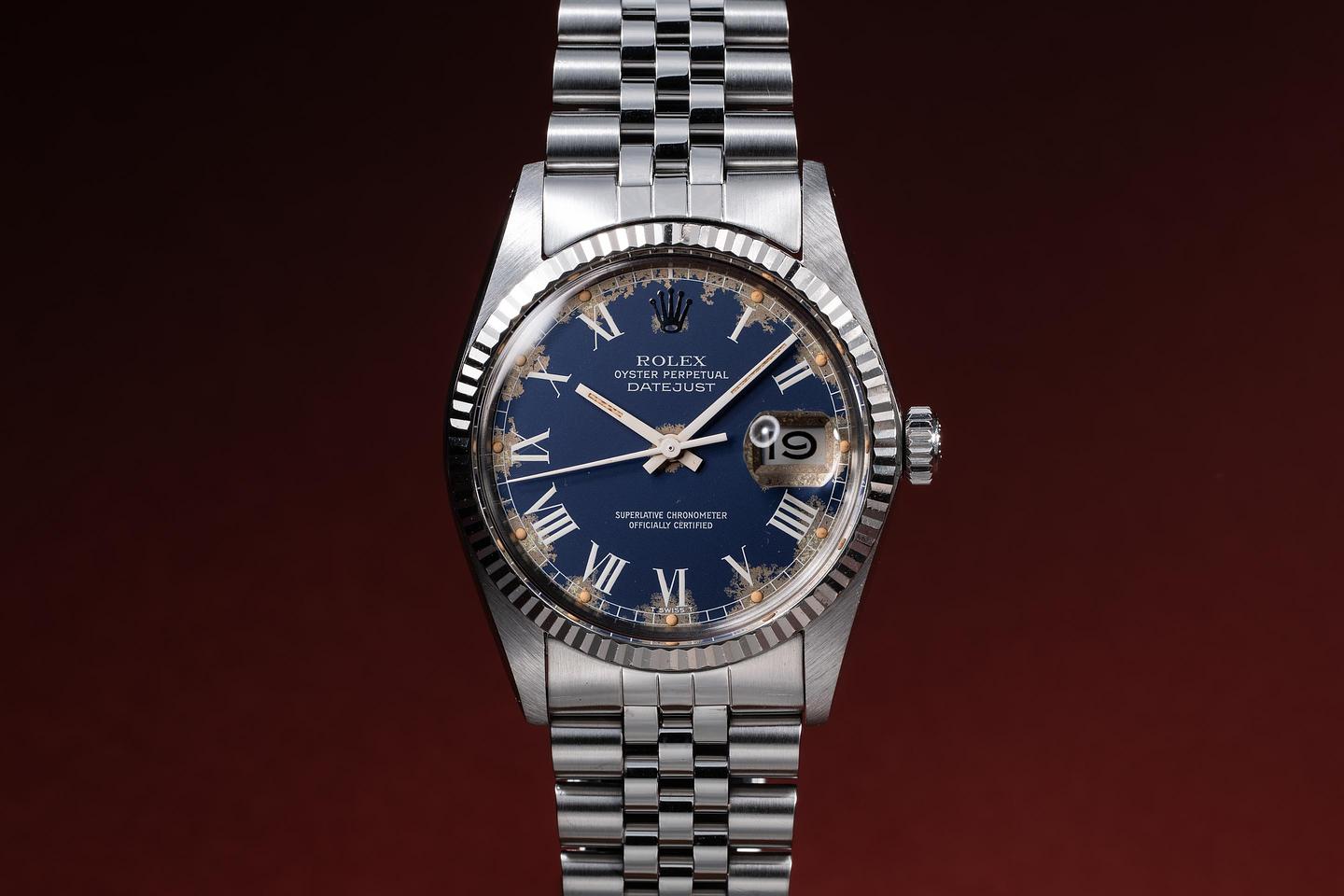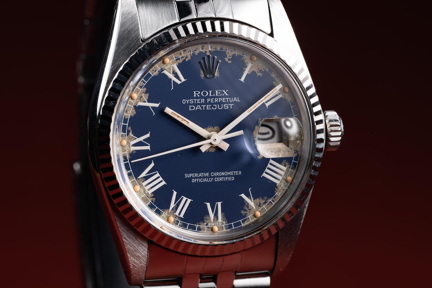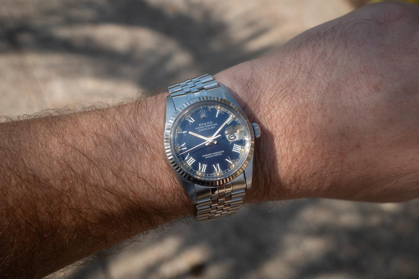 Dial: The blue "Big Numeral" Roman Numeral dial is excellent, showing gold tropical patina radiating from around the lume plots, the edge of the dial, and the centerpost.