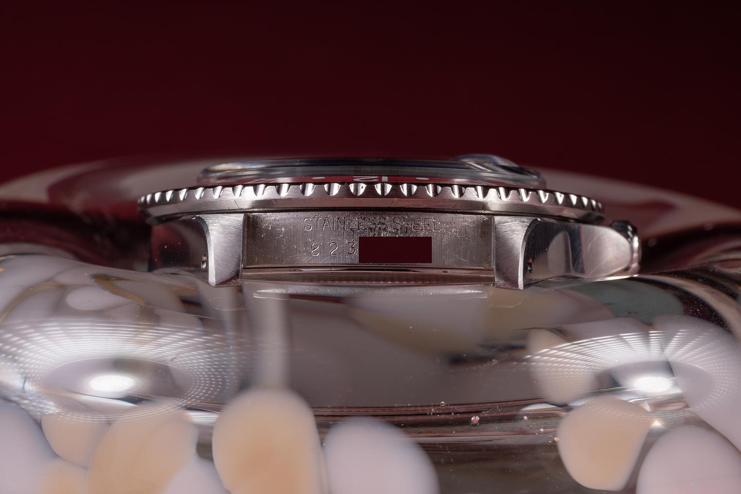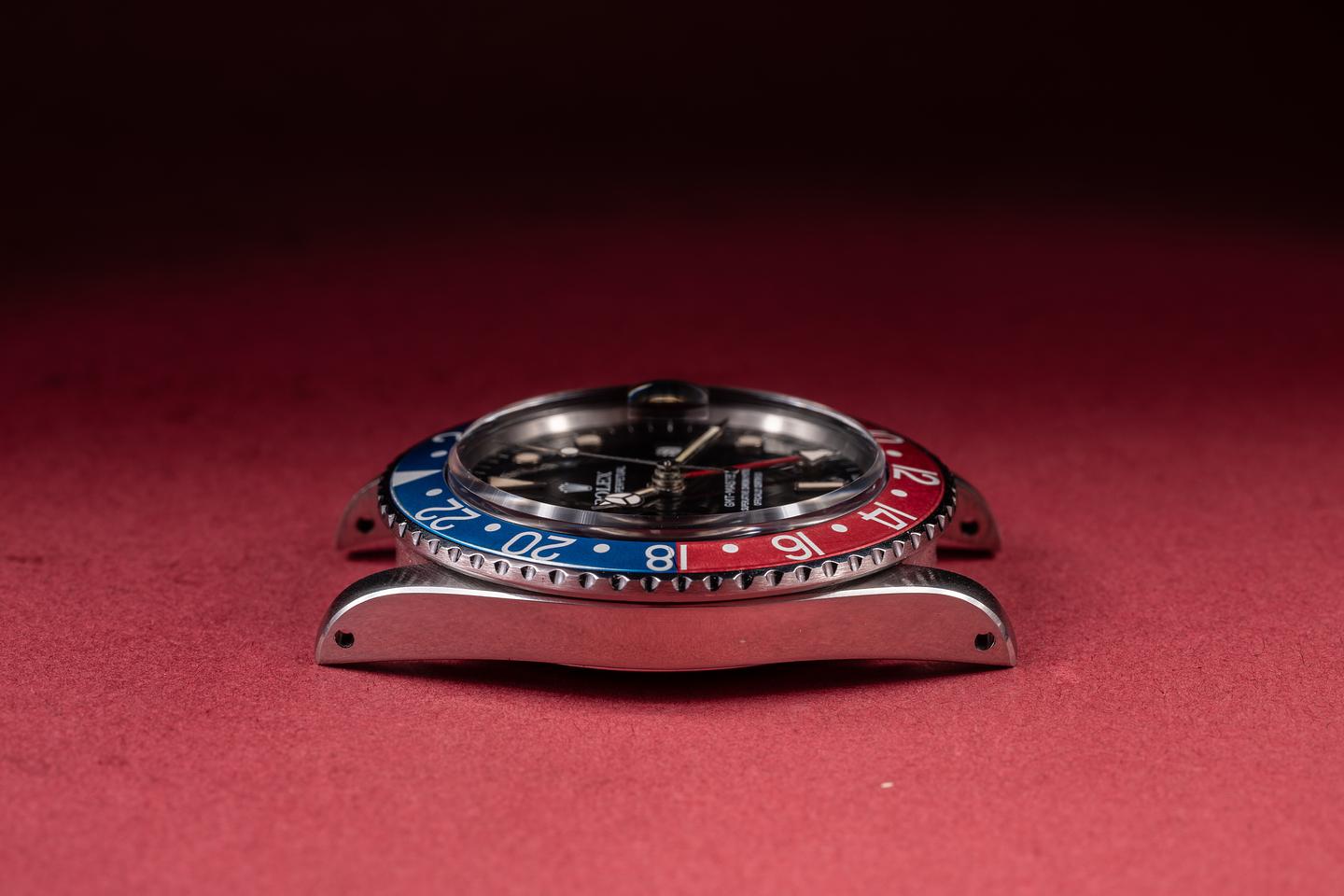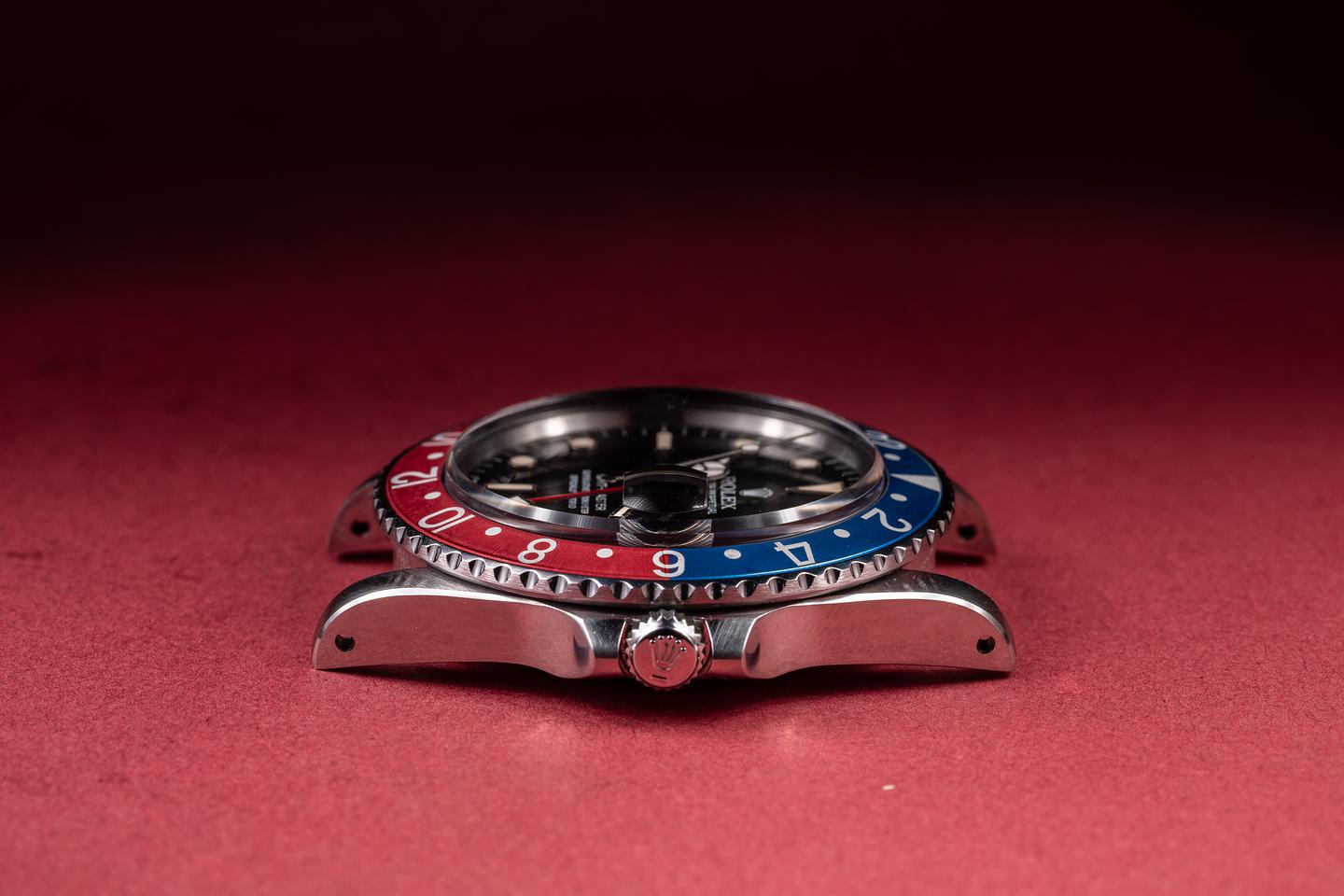 Case: The recently polished case is excellent, showing sharp, prominent bevels and only very light wear. The blue and red "Pepsi" bezel insert is also in excellent condition, showing some light fading to both portions of the insert.