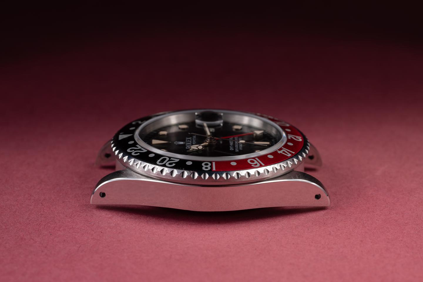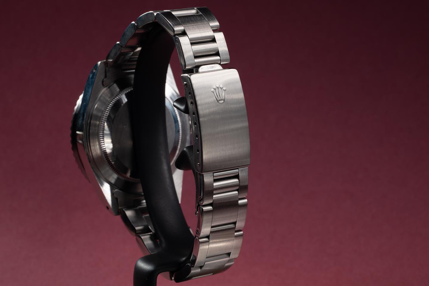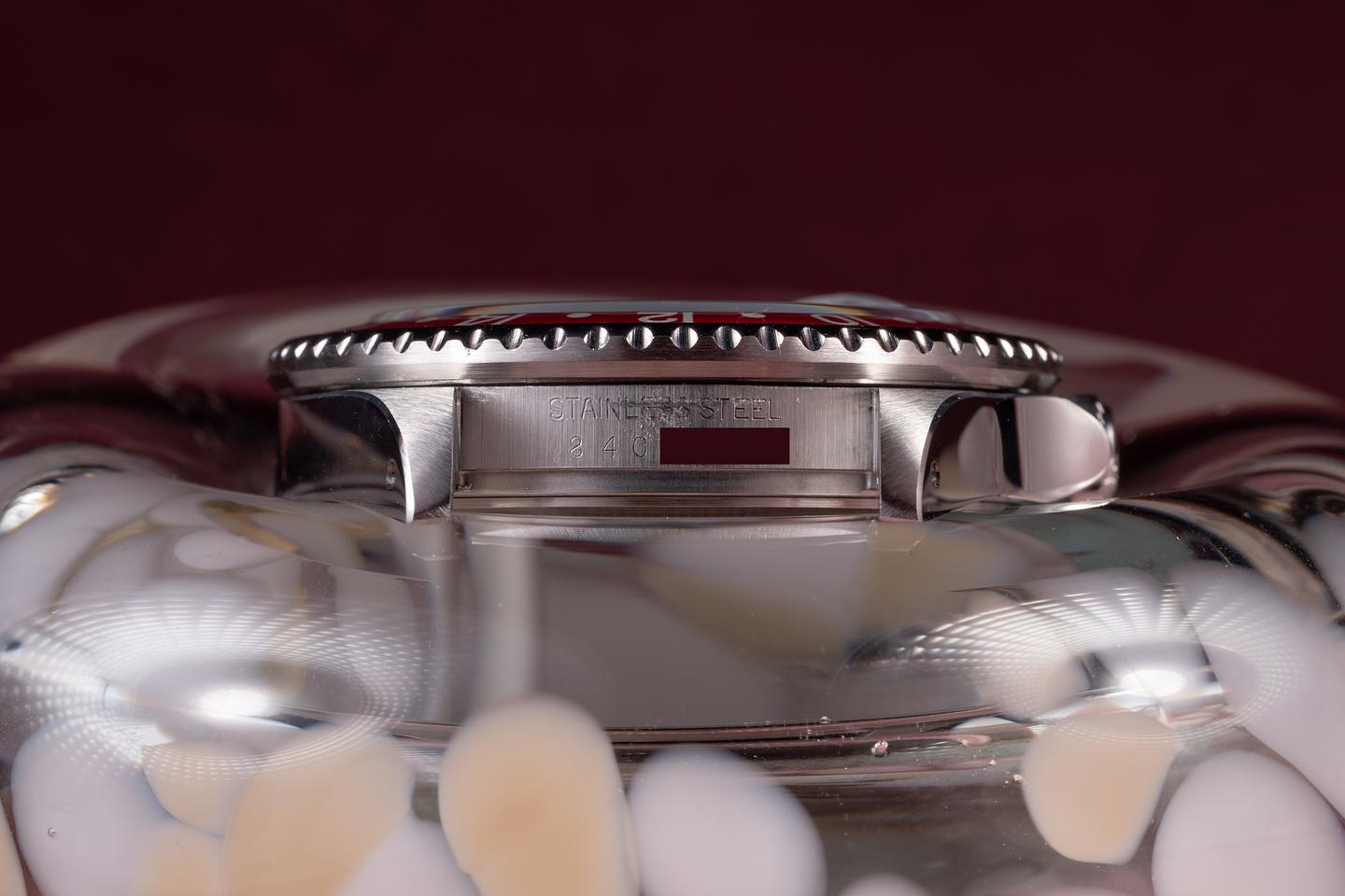 Case: The recently polished case is excellent, showing sharp, prominent bevels and only light wear from use. The black and red bezel insert is also in excellent condition, showing only very light wear from use.