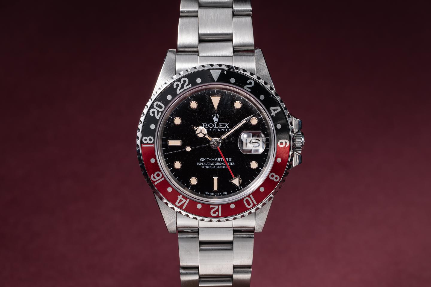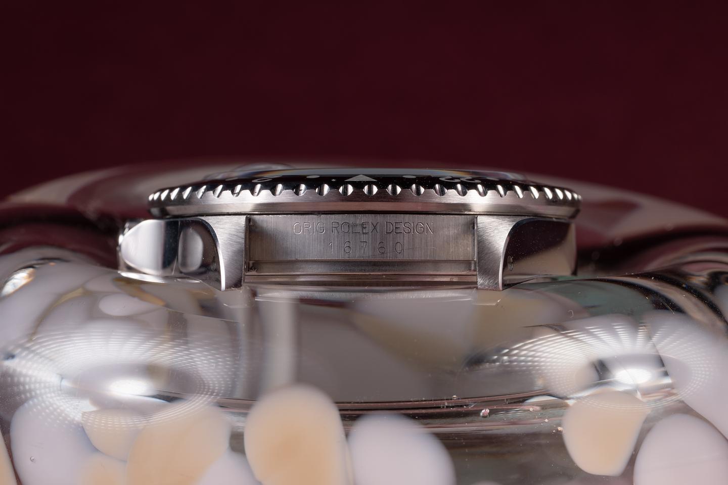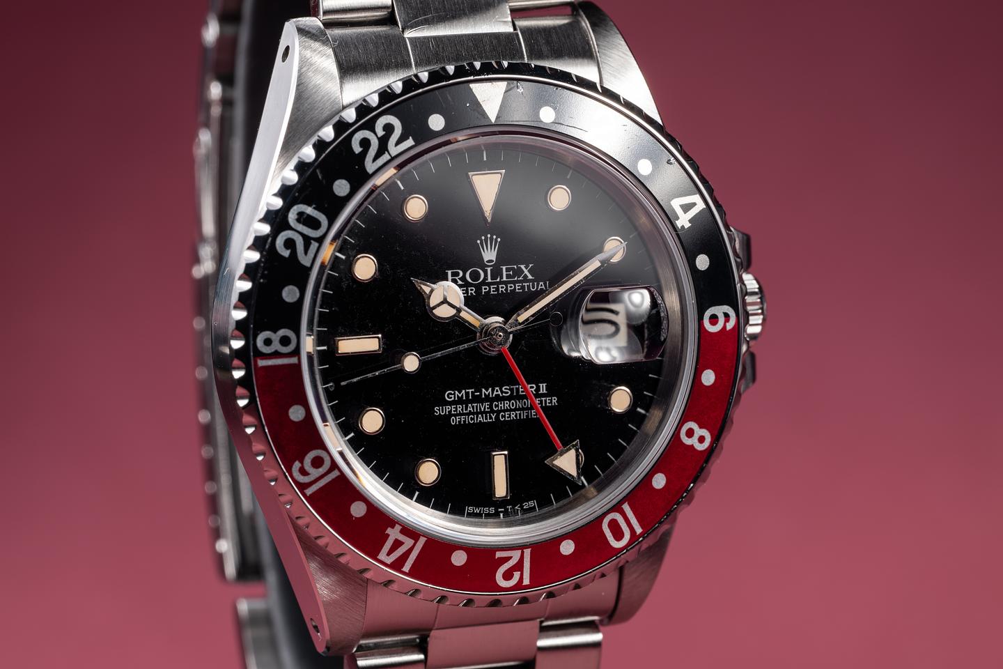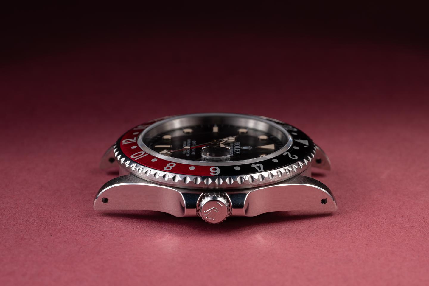 Case: The recently polished case is excellent, showing sharp, prominent bevels and only light wear from use. The black and red bezel insert is also in excellent condition, showing only very light wear from use.