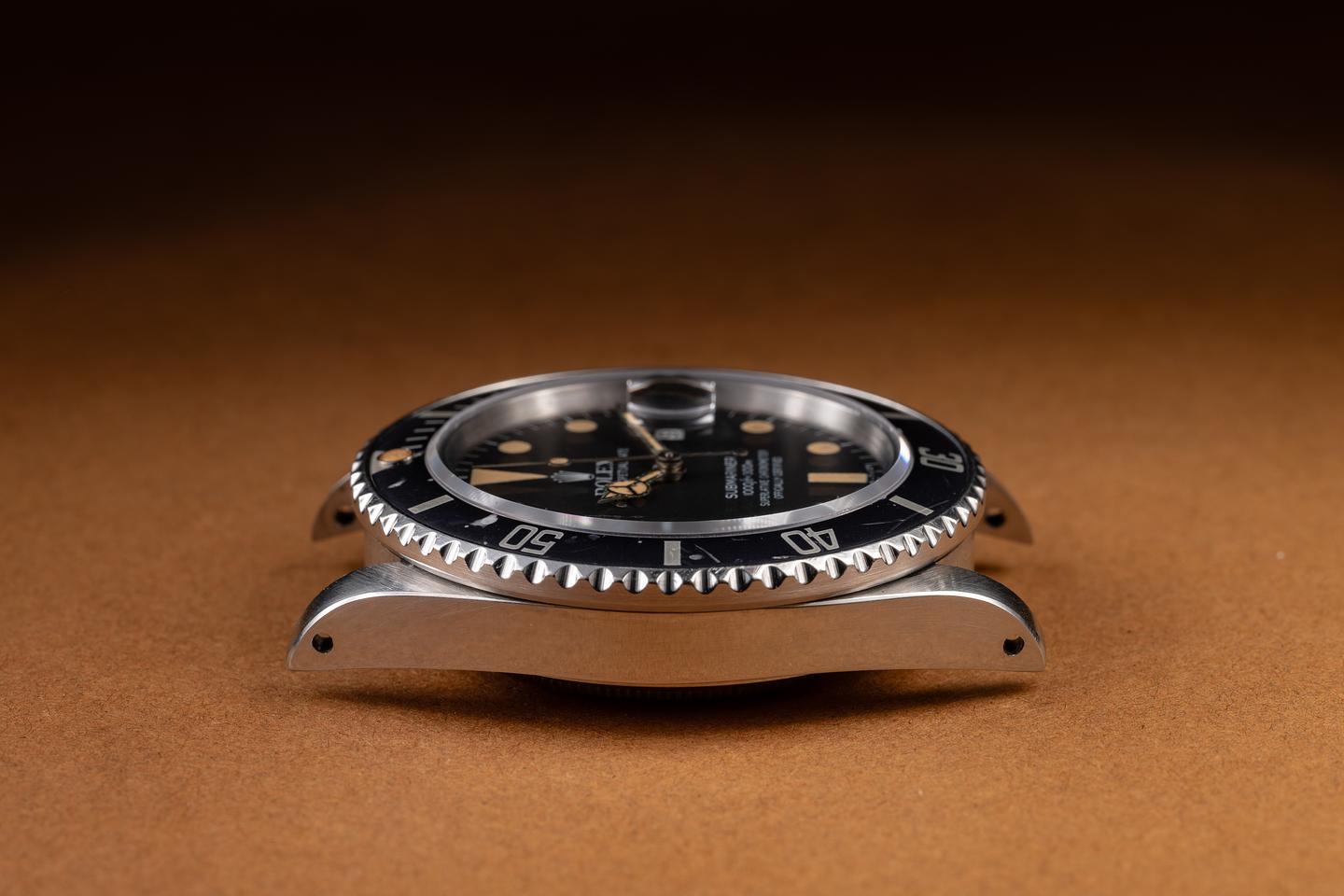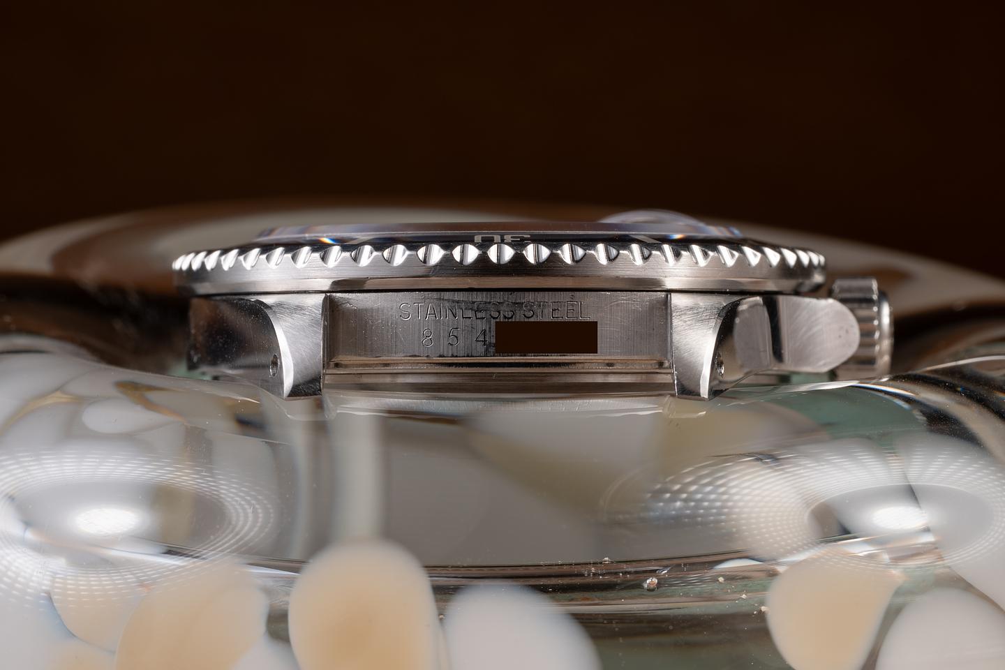 Case: The previously polished case is excellent, showing sharp, prominent bevels and some light wear from use. The bezel insert is also in excellent condition and has aged to a dark silver/blue, showing some light wear from use.
