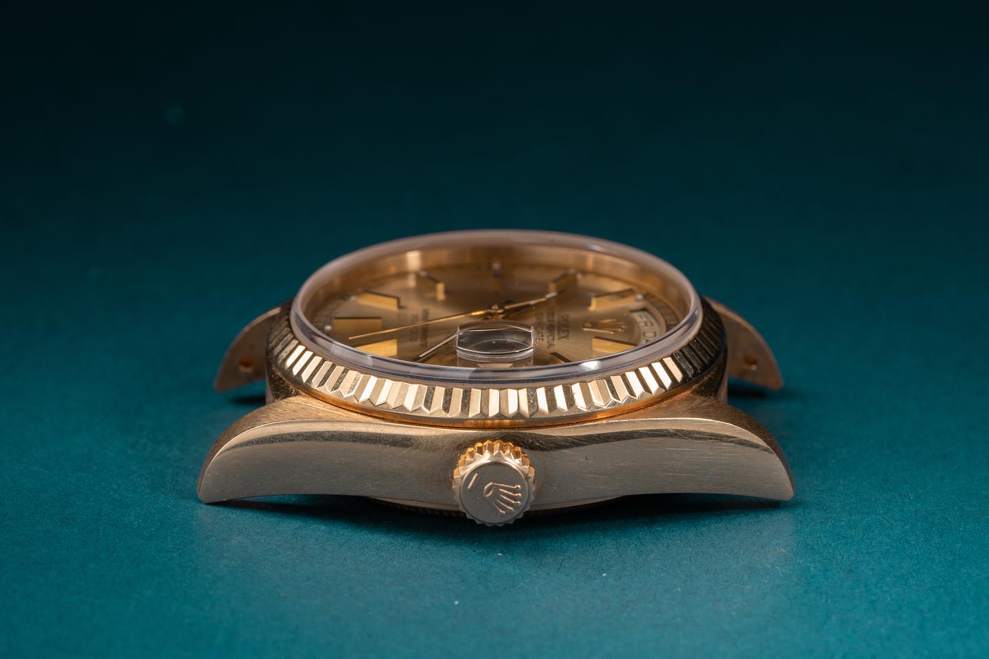 Case: The 18k yellow gold case is excellent showing only light wear from use. The sharp 18k yellow gold fluted bezel is also in excellent condition showing only light wear from use.