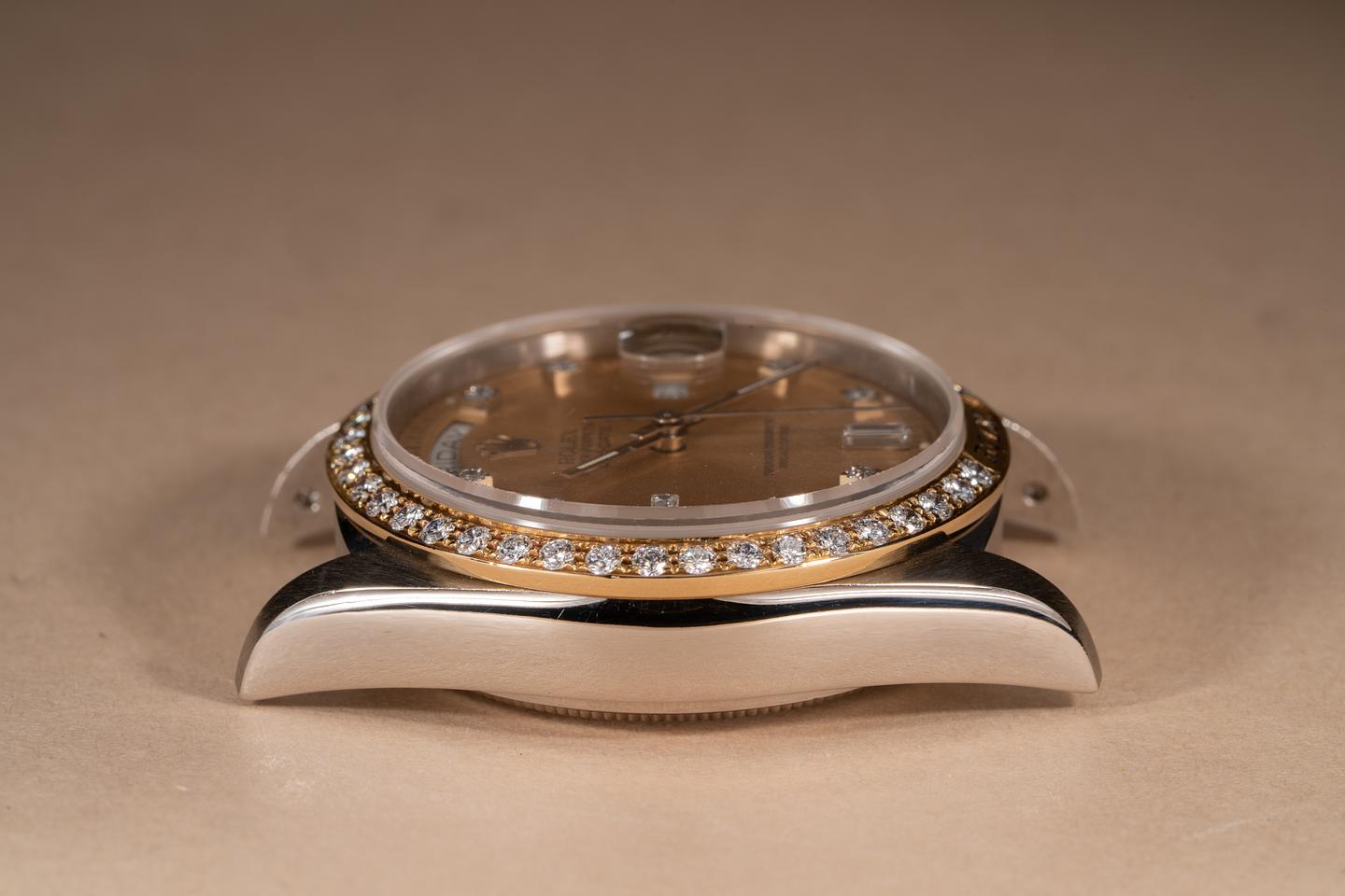 Case: The thick and even 18k white gold case is excellent showing only very light wear from use. The factory rarely seen Cartouche 18k yellow gold and diamond bezel is also in excellent condition showing only very light wear from use.