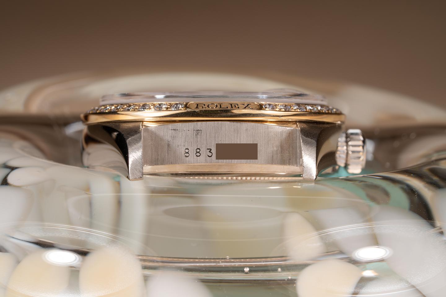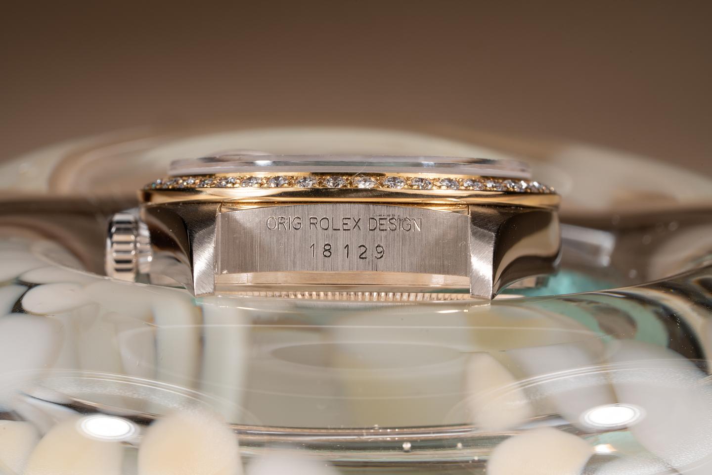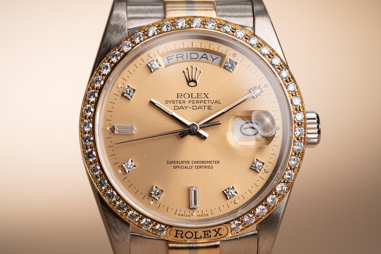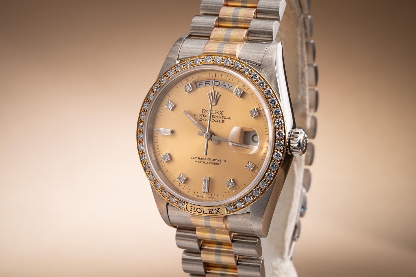Notes: An exceptional Tridor with a rare Rolex logo diamond bezel.