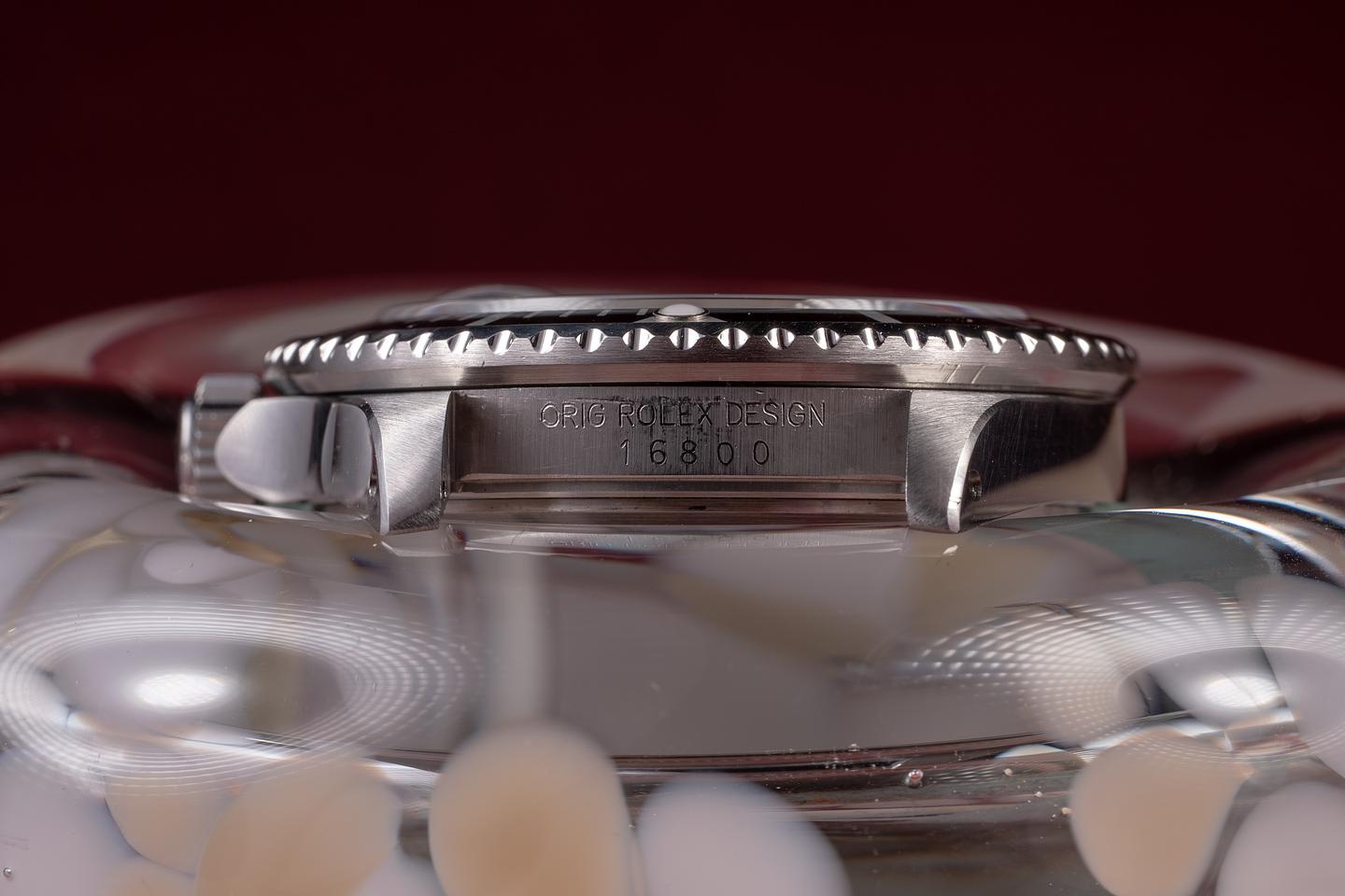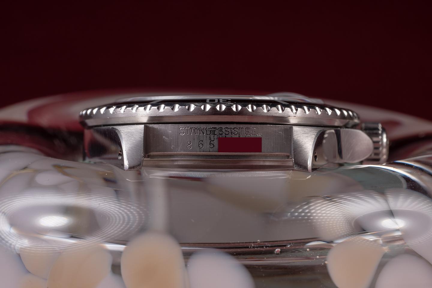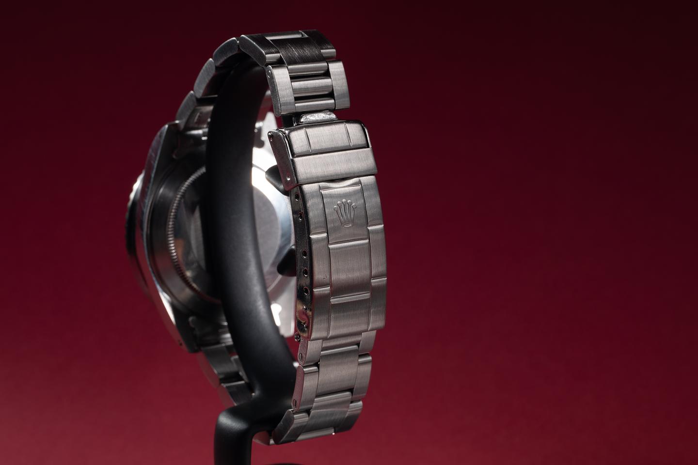 Case: The previously polished case is very good, showing sharp bevels and only very light wear from use. The black bezel insert is in excellent condition, showing only light wear from use.