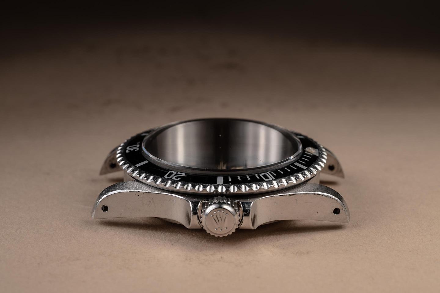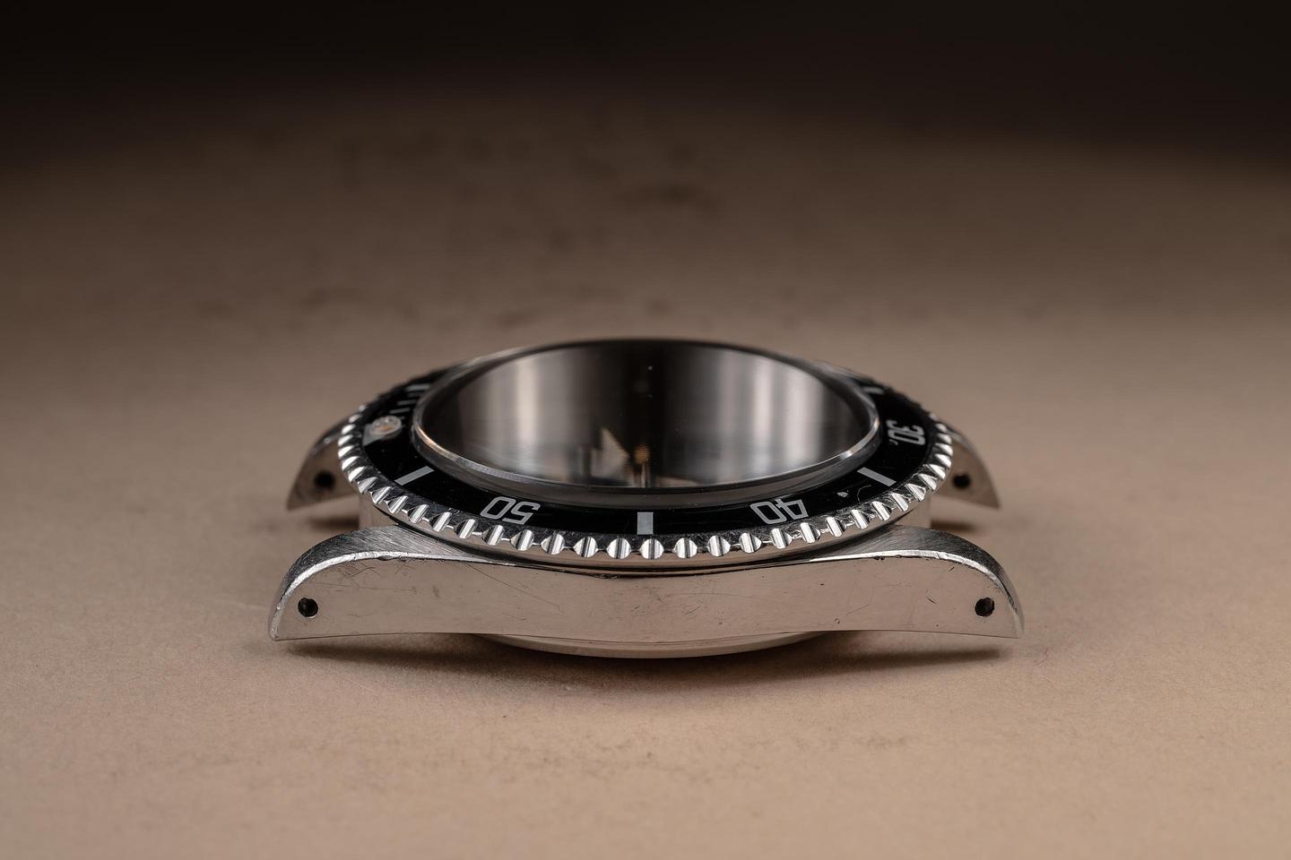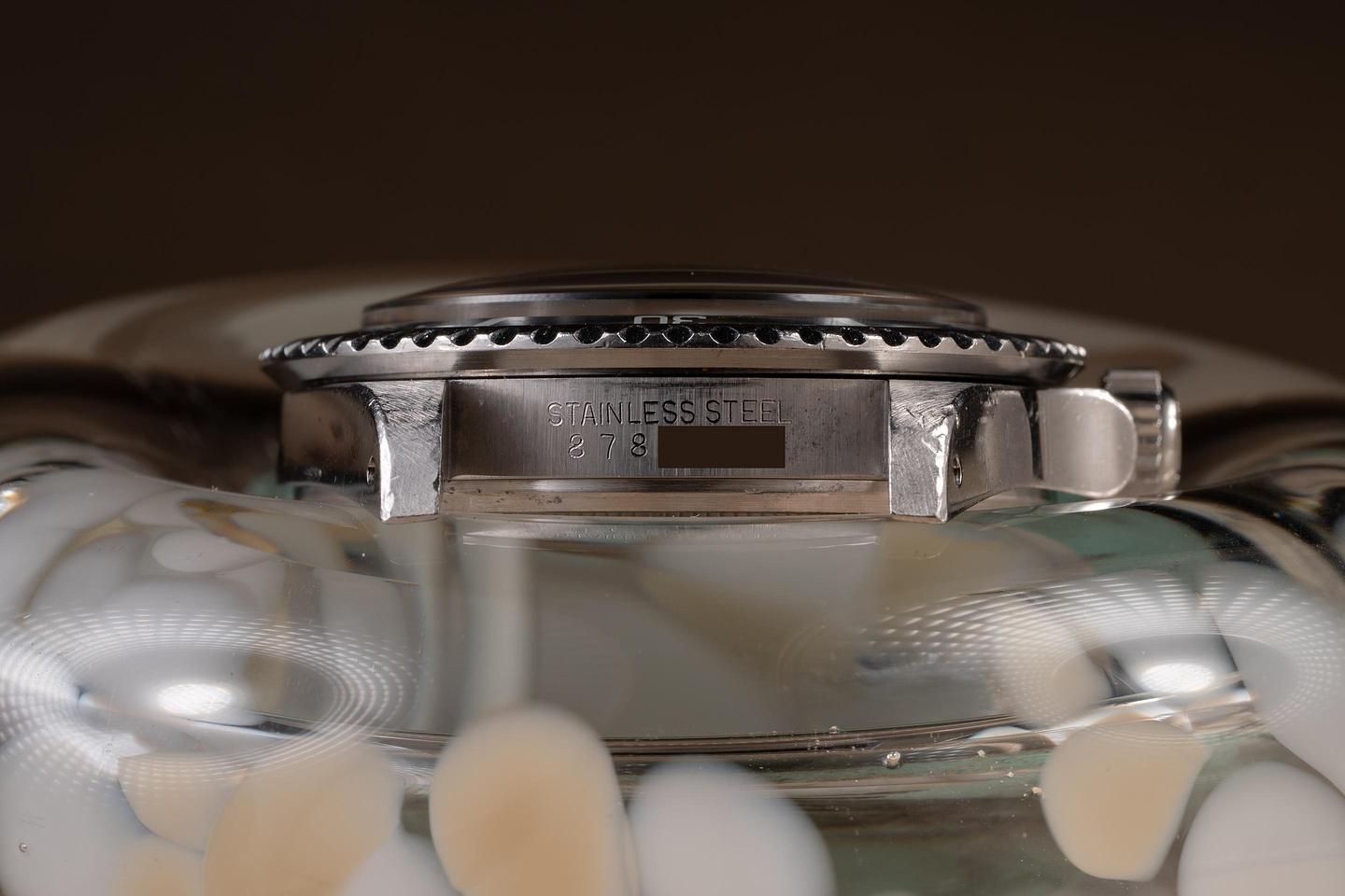 Case: The unpolished case is excellent, showing wide, sharp, prominent bevels, and light to average wear from use. The black bezel insert is also in excellent condition, showing only light wear from use.