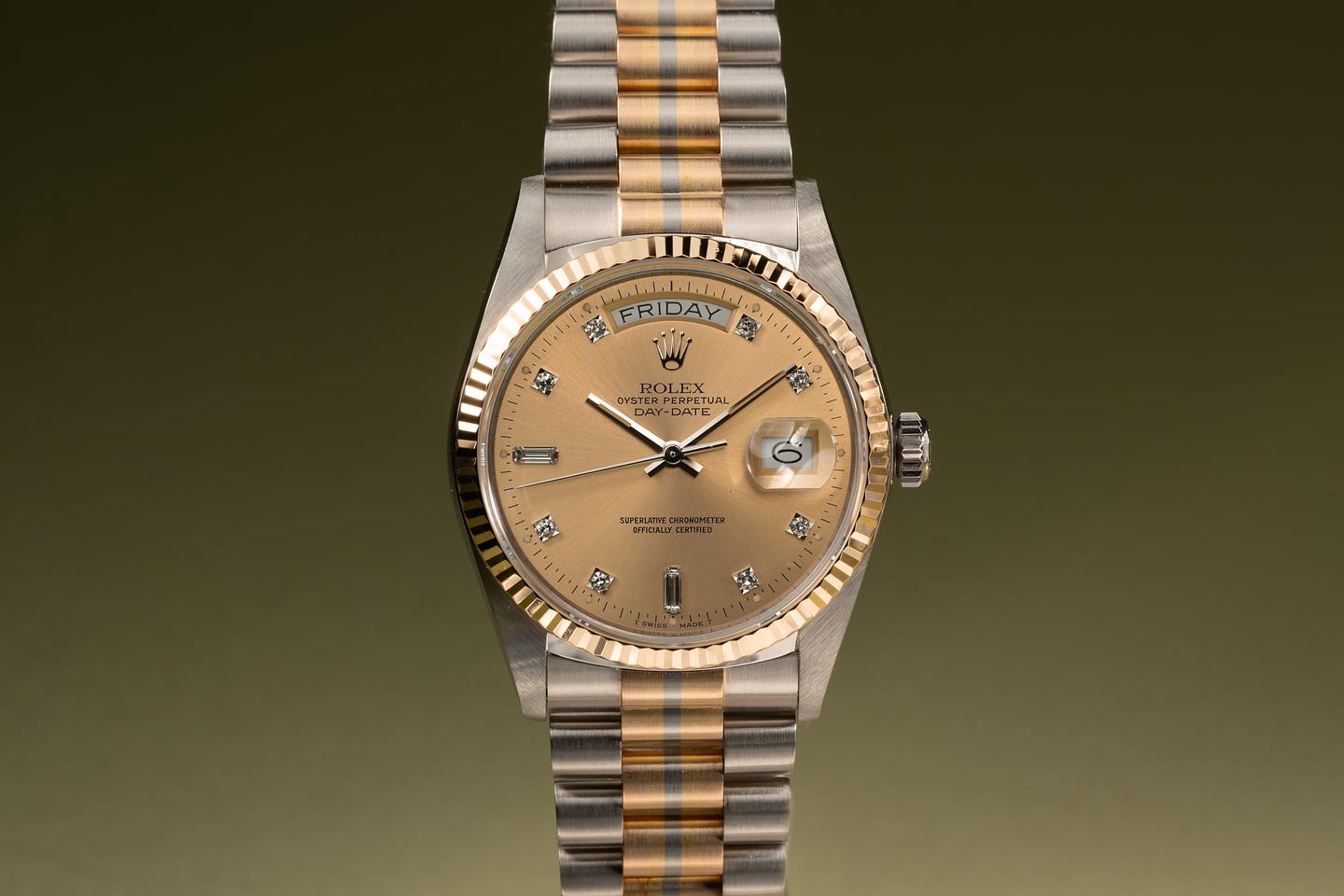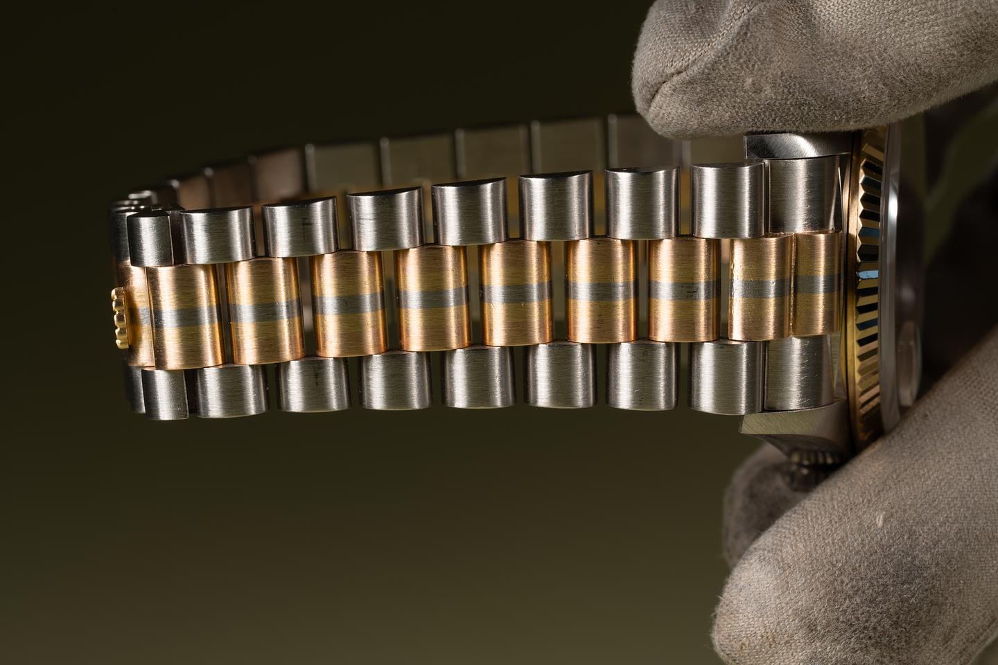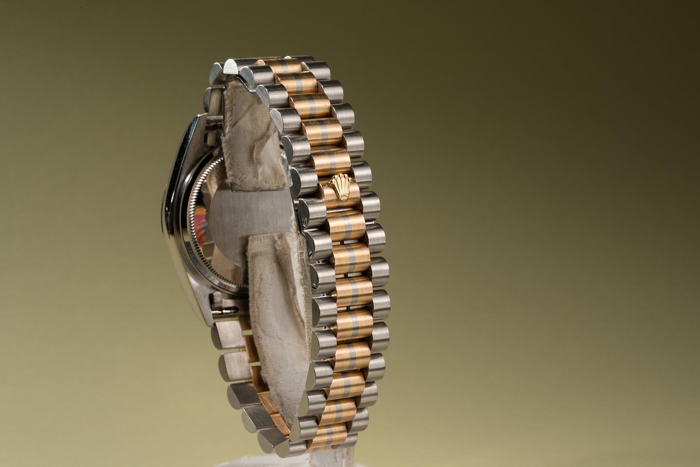 Bracelet: The 22 link 18K white, yellow, and rose gold Tridor President bracelet is excellent showing only very light stretch for its age. The clasp is stamped with a matching 1985 date code.