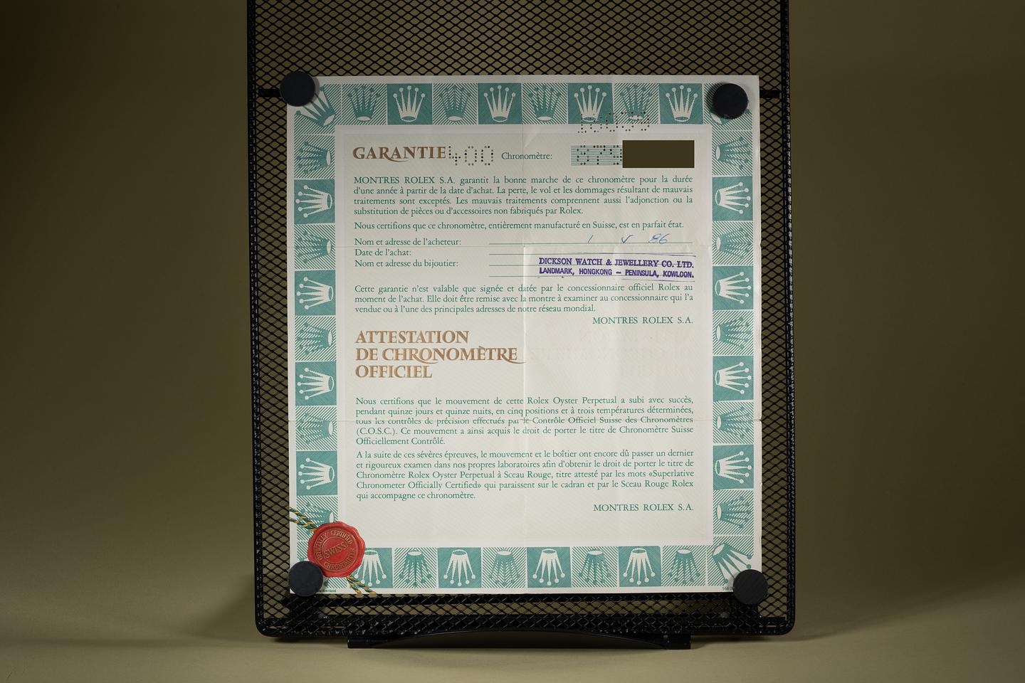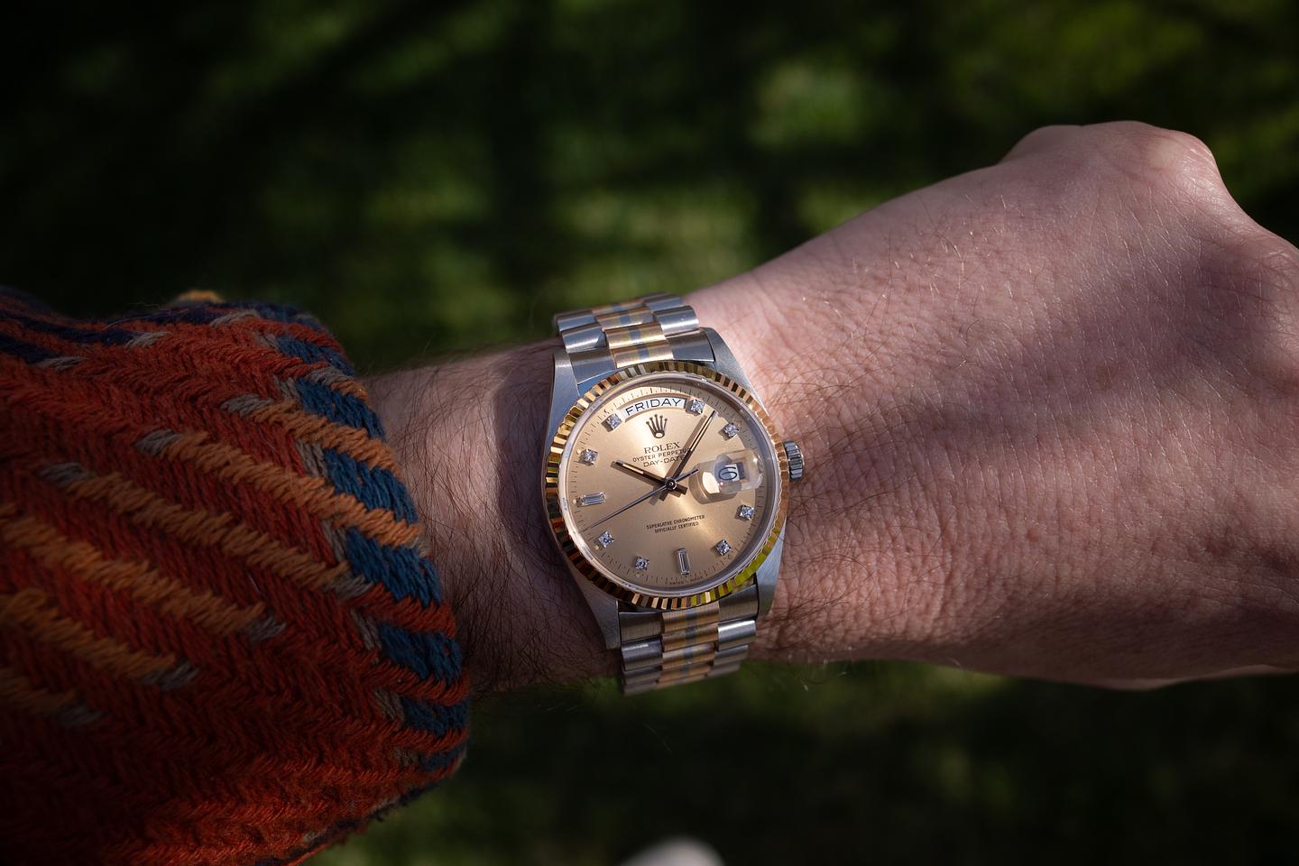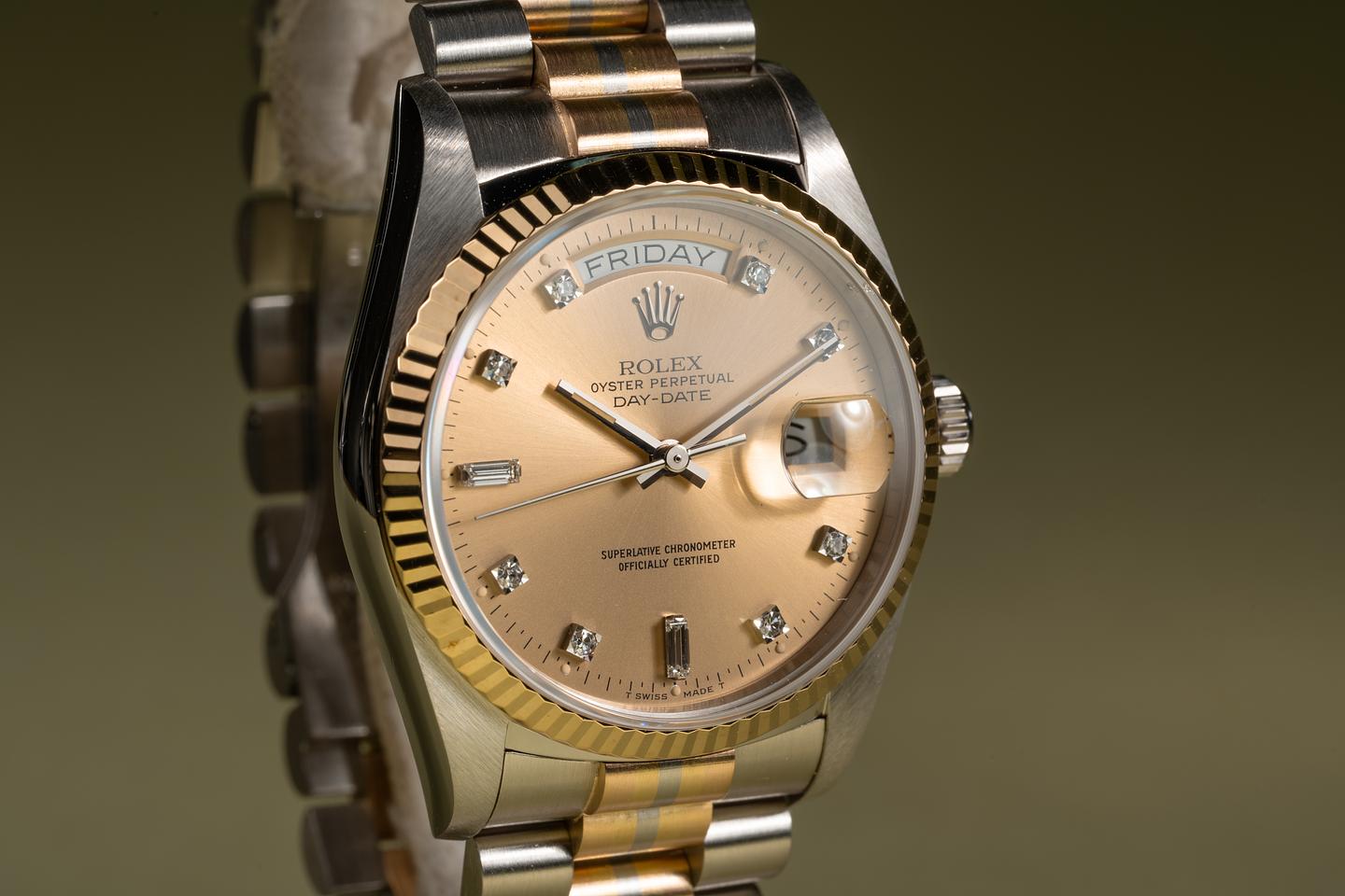 Bracelet: The 22 link 18K white, yellow, and rose gold Tridor President bracelet is excellent showing only very light stretch for its age. The clasp is stamped with a matching 1985 date code.