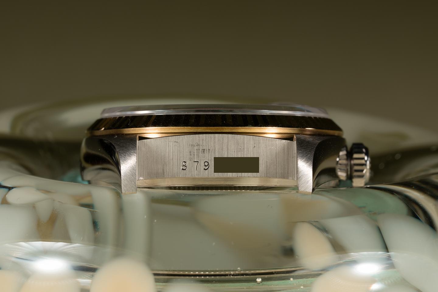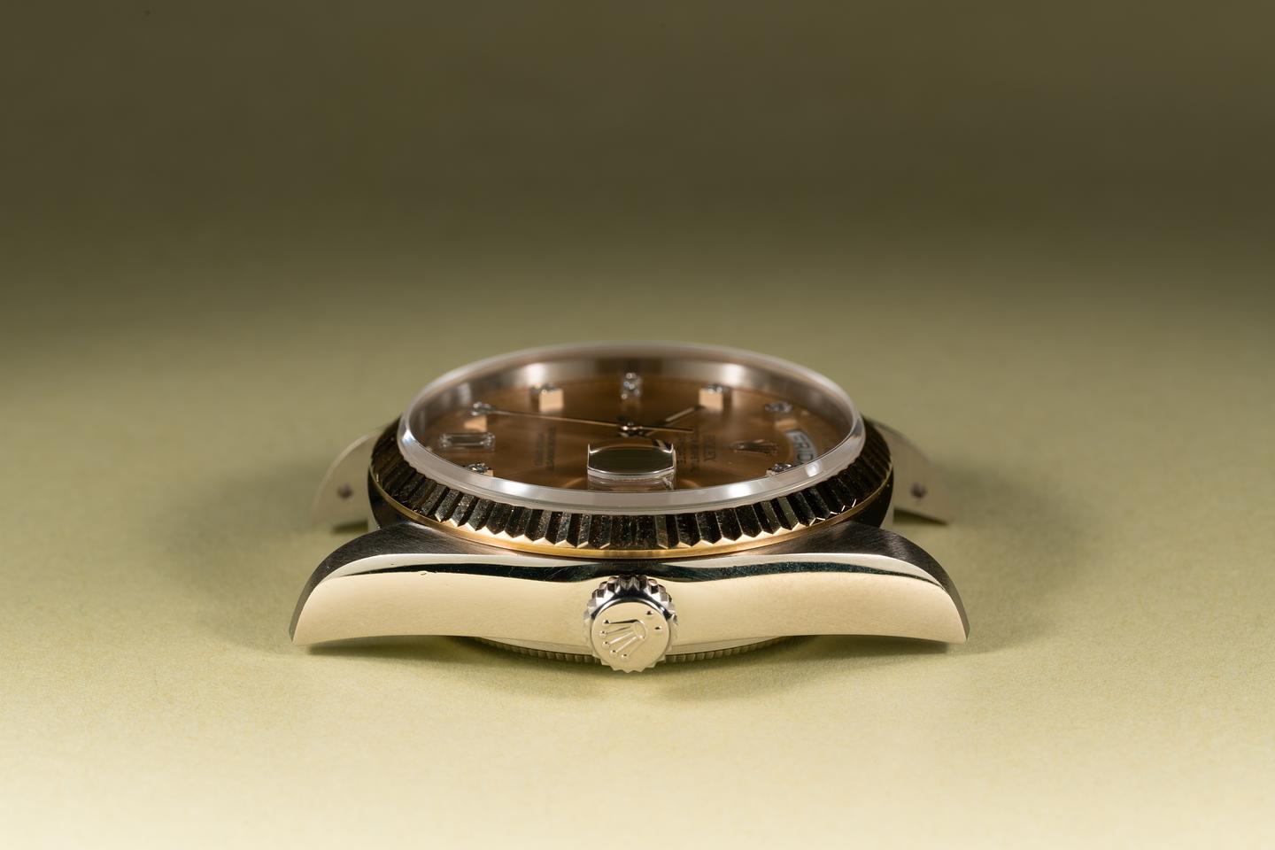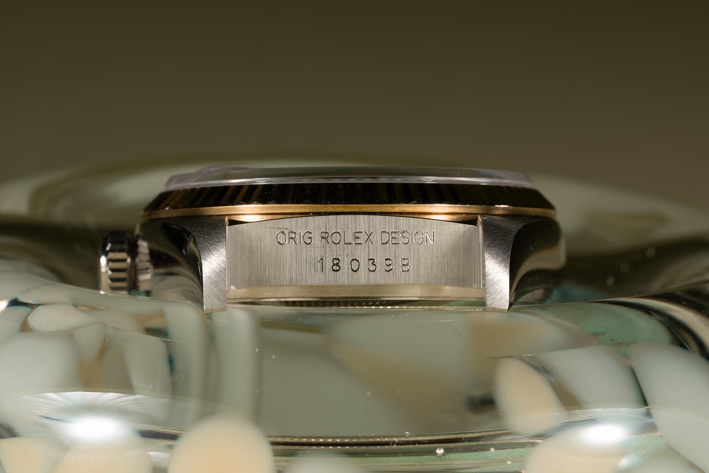 Case: The thick, sharp, and even 18k white gold case is excellent showing only very light wear from use. The sharp 18k yellow gold fluted bezel is also in excellent condition showing only ver light wear from use.