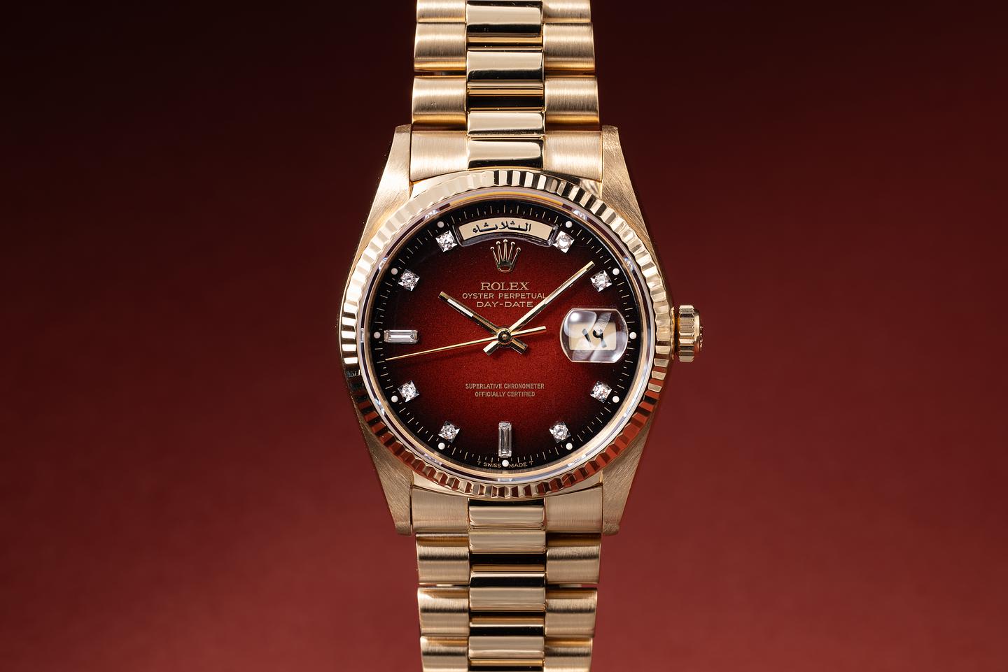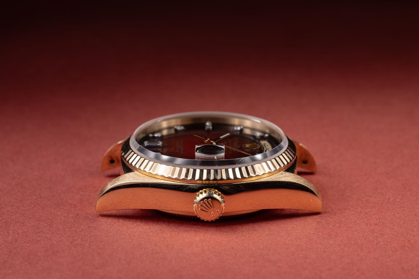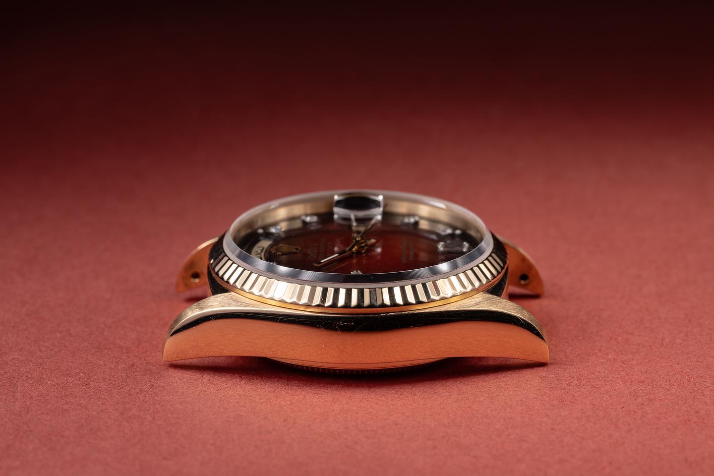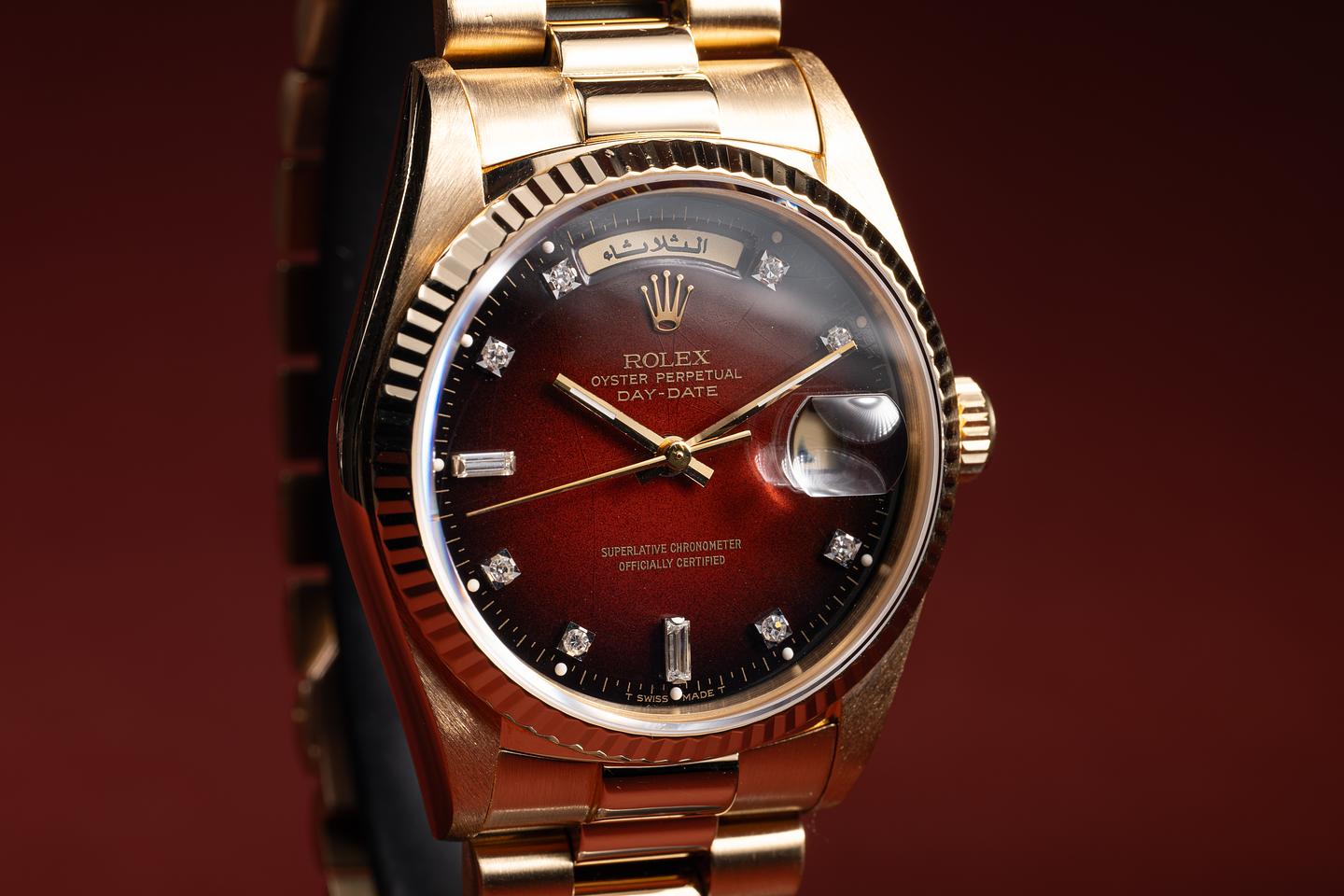Dial: The burgundy vignette diamond dial is excellent, showing some subtle spider-cracking across its surface. The lume has aged to a clean, creamy hue, and the hands match perfectly. The factory date disk is printed in Arabic