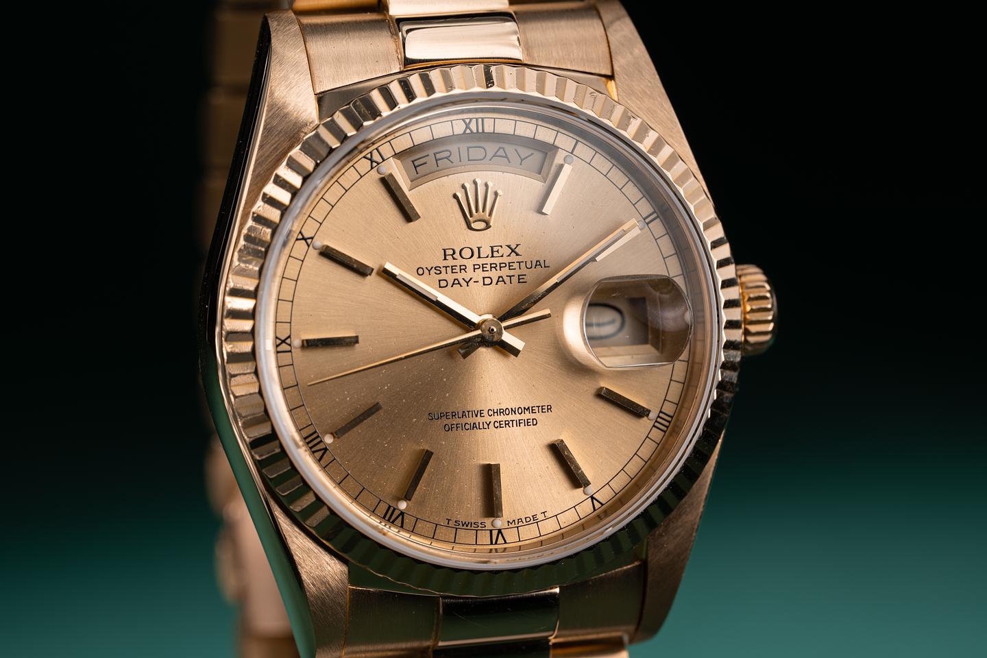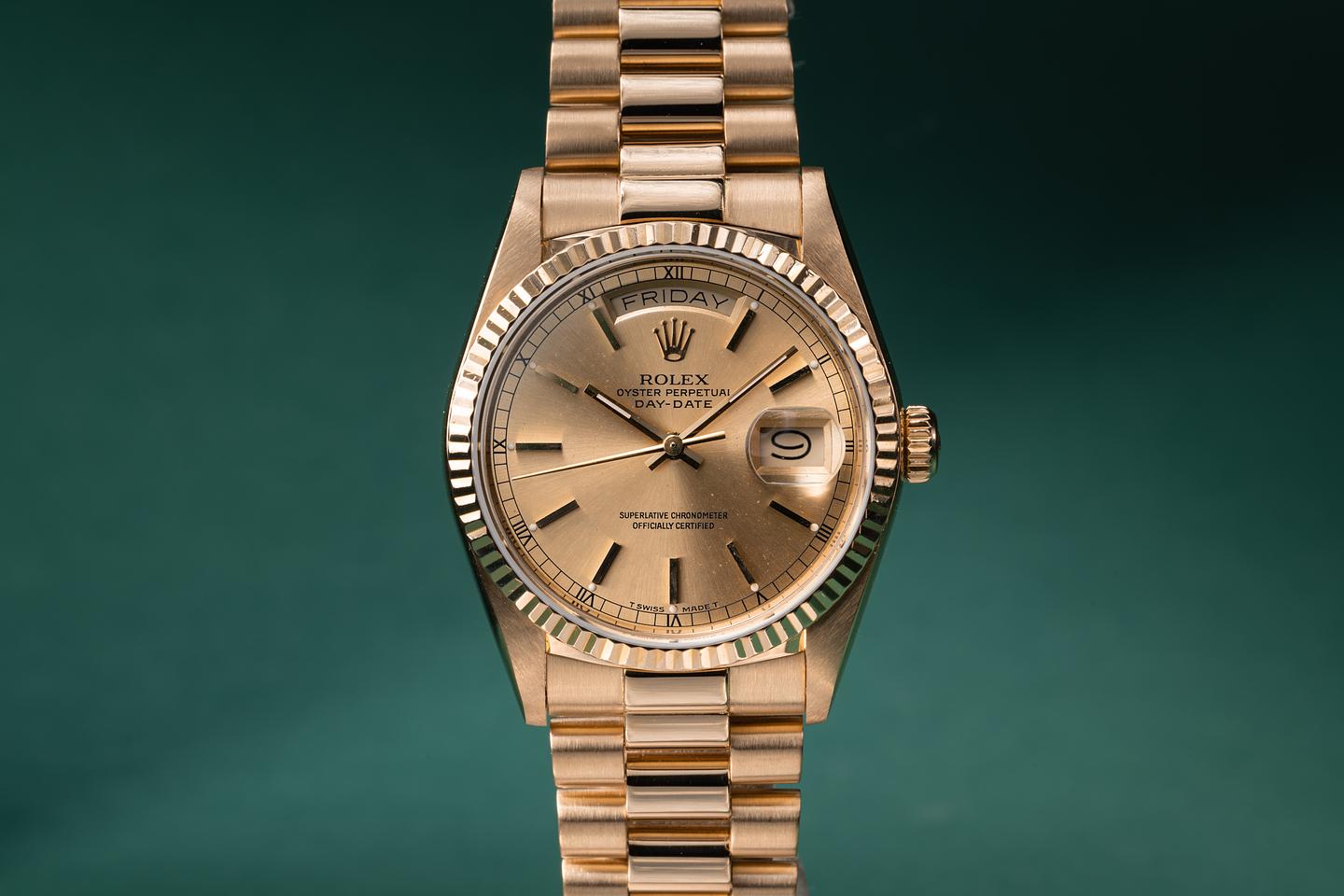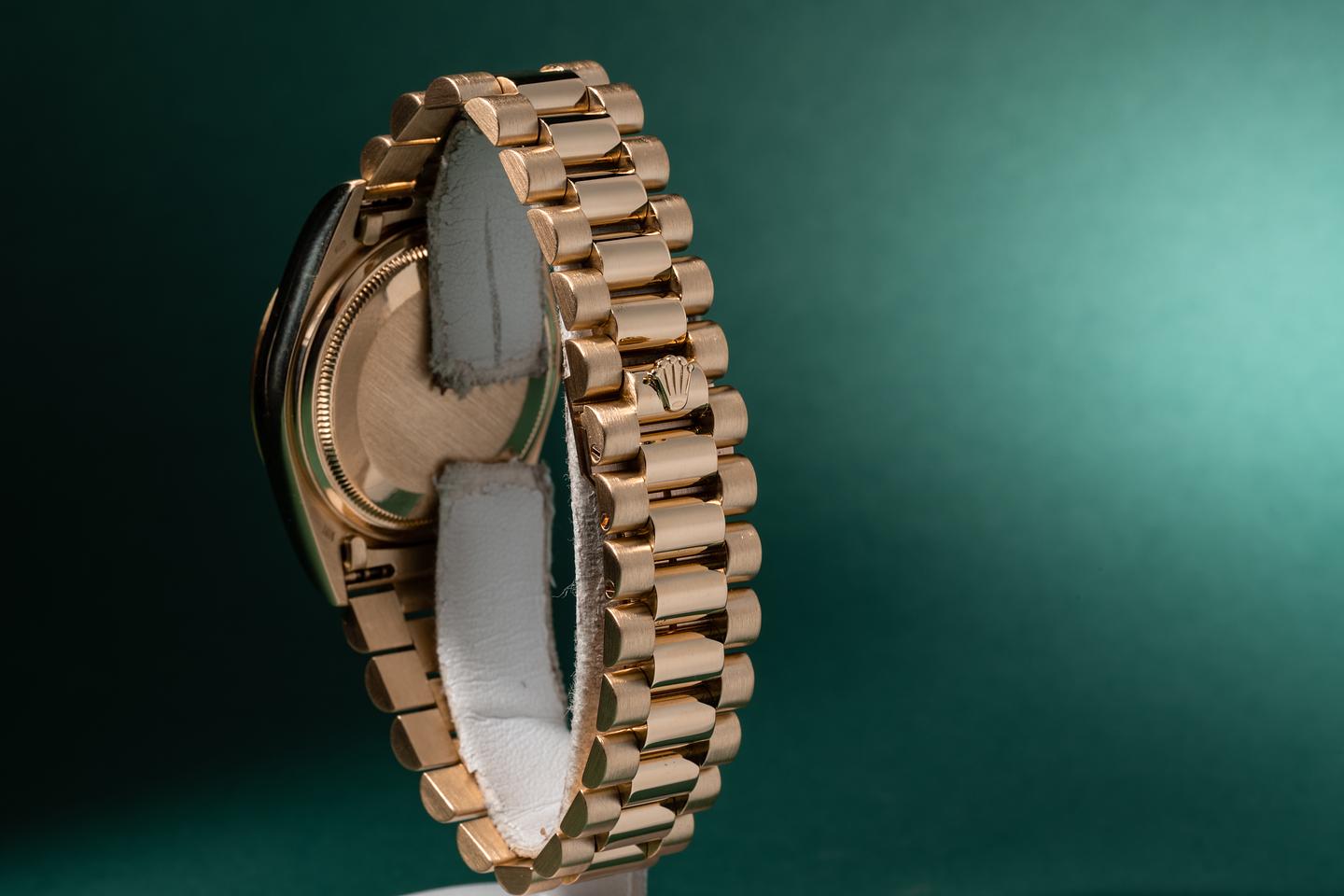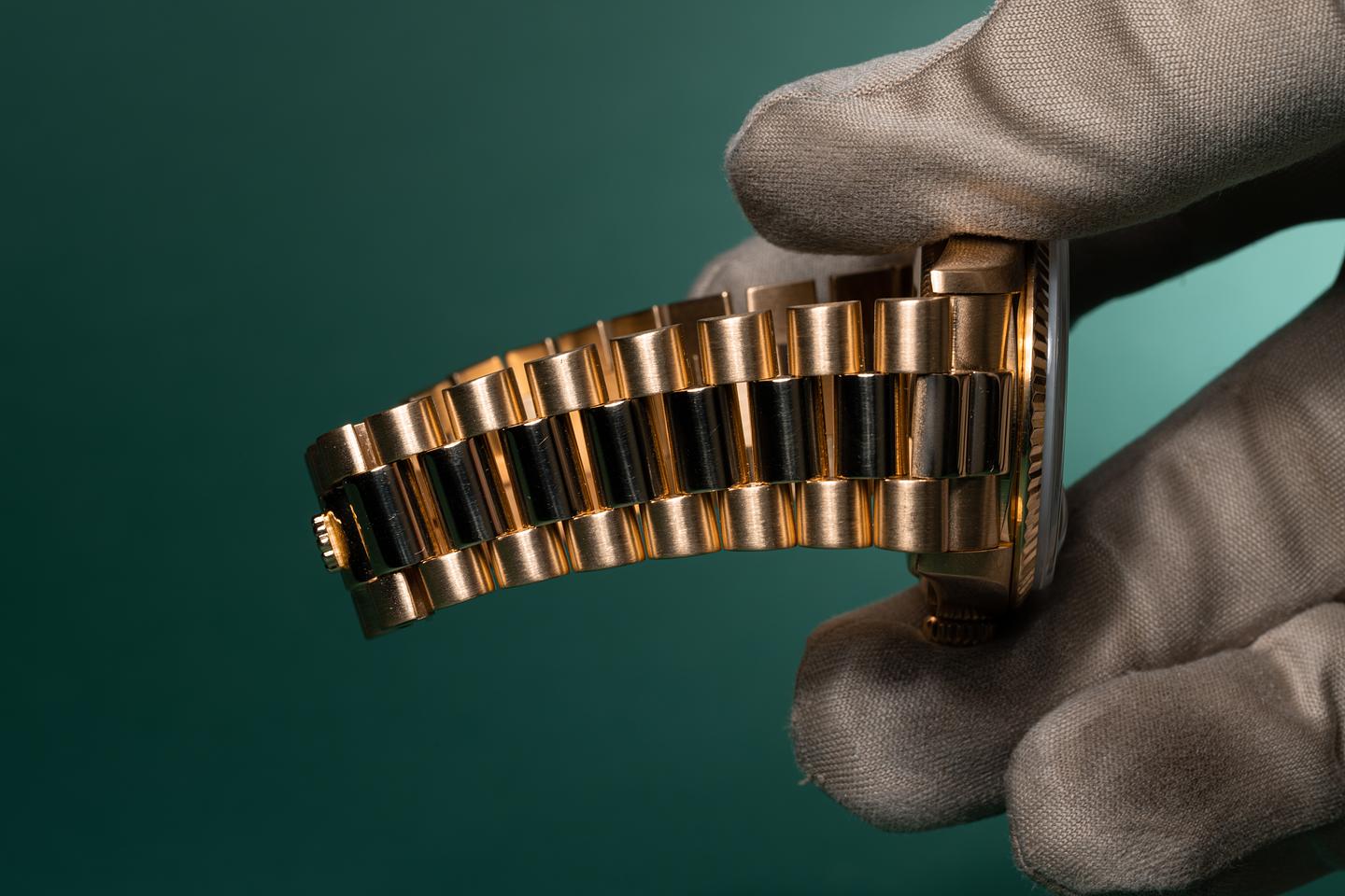 Bracelet: The 22 link 18k yellow gold president bracelet is excellent showing only light stretch for its age. The clasp is stamped with a matching 1986 date code.