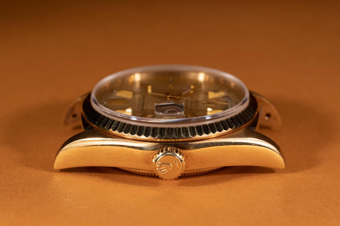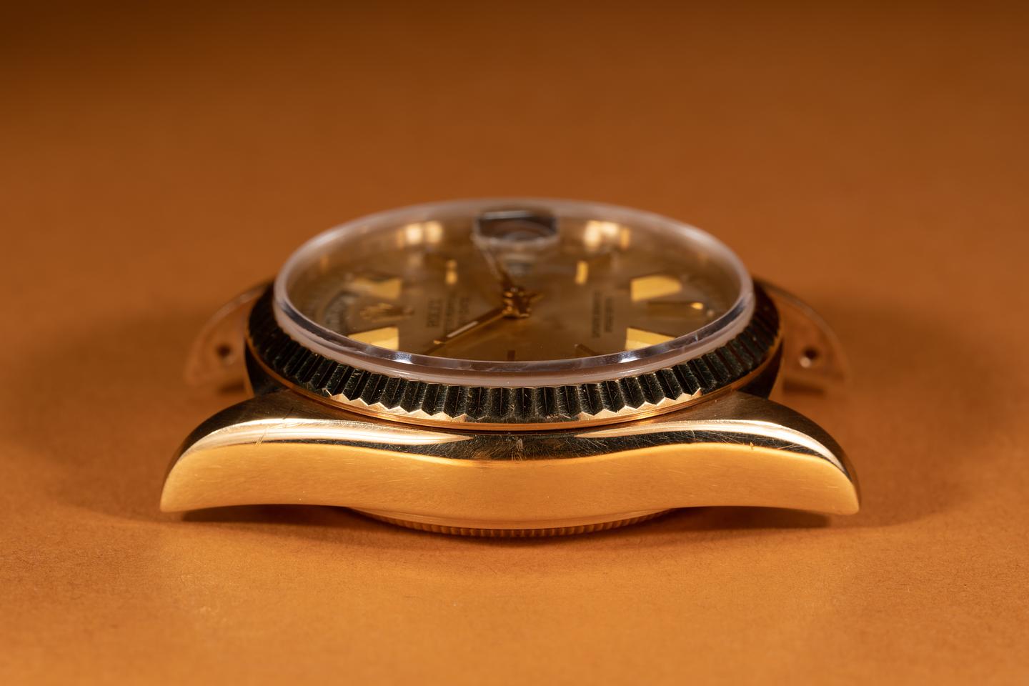 Case: The previously polished 18k yellow gold case is excellent showing only light wear from use. The sharp 18k yellow gold fluted bezel is also in excellent condition showing only light wear from use.