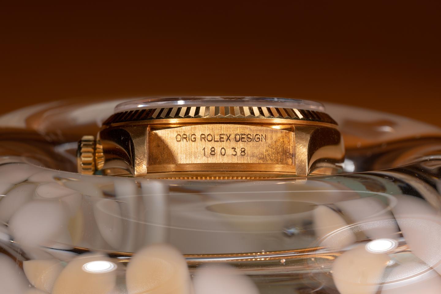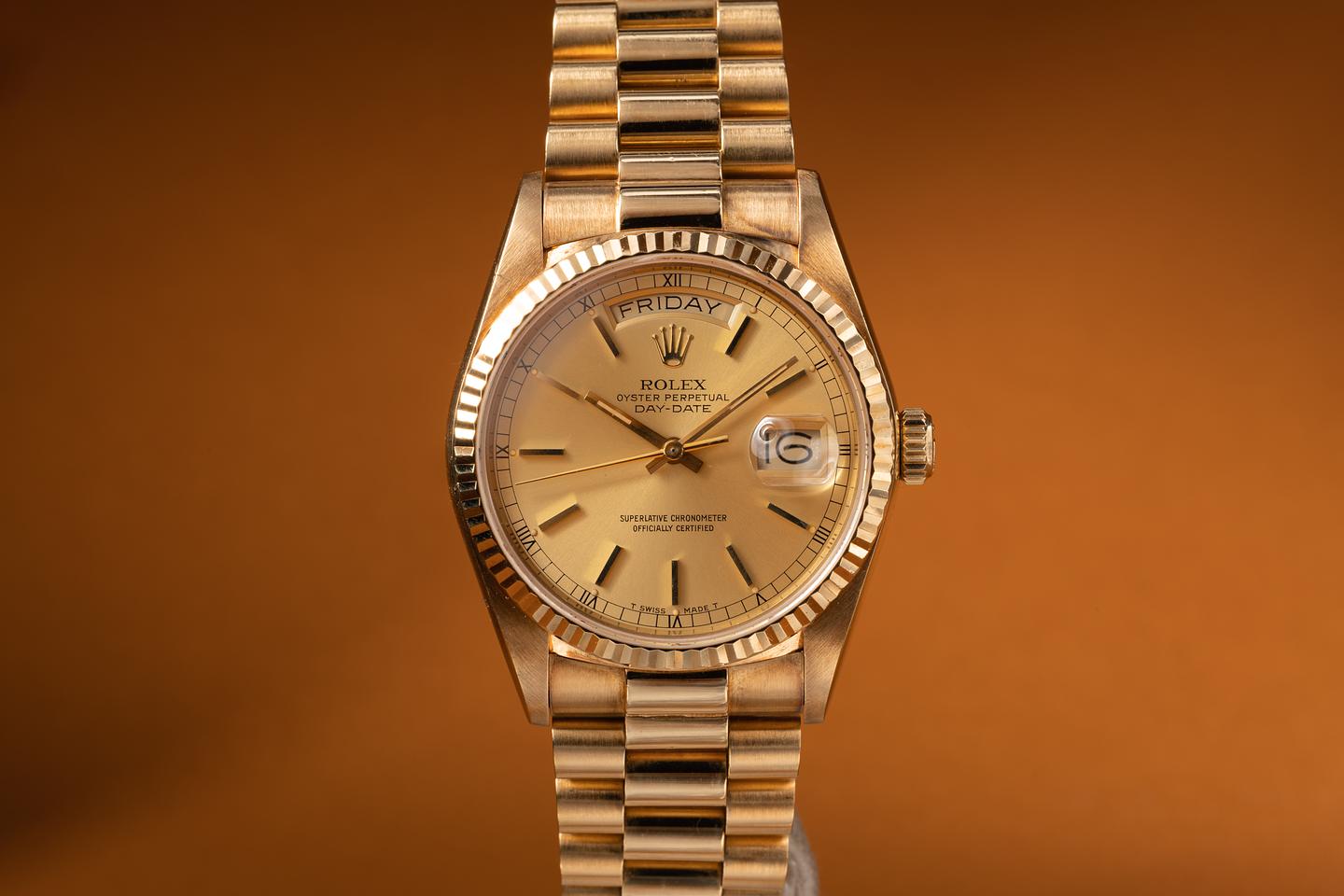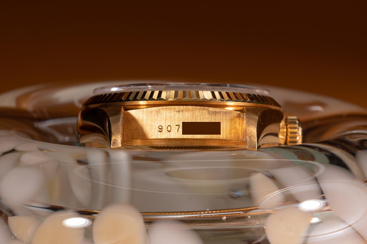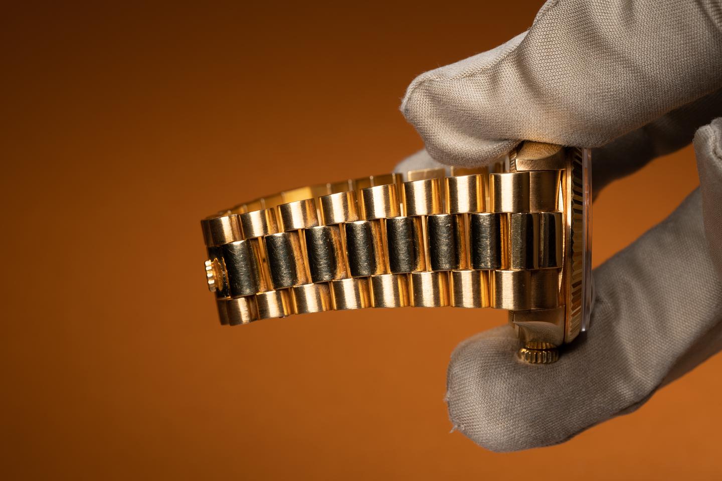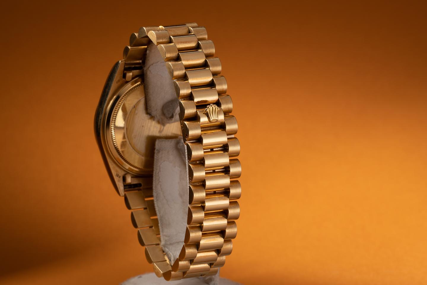 Bracelet: The 22 link 18K yellow gold President is excellent showing only very light stretch for its age. The clasp is stamped with a 1985 date code.
