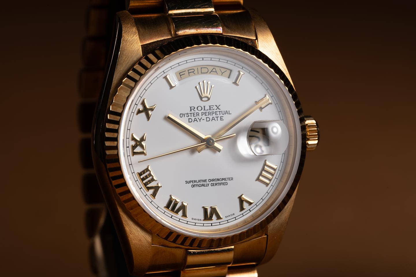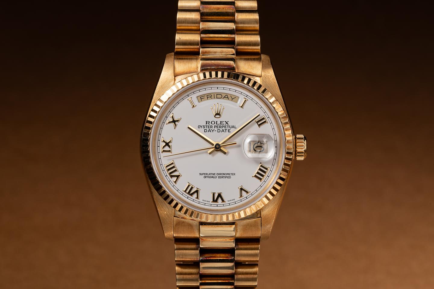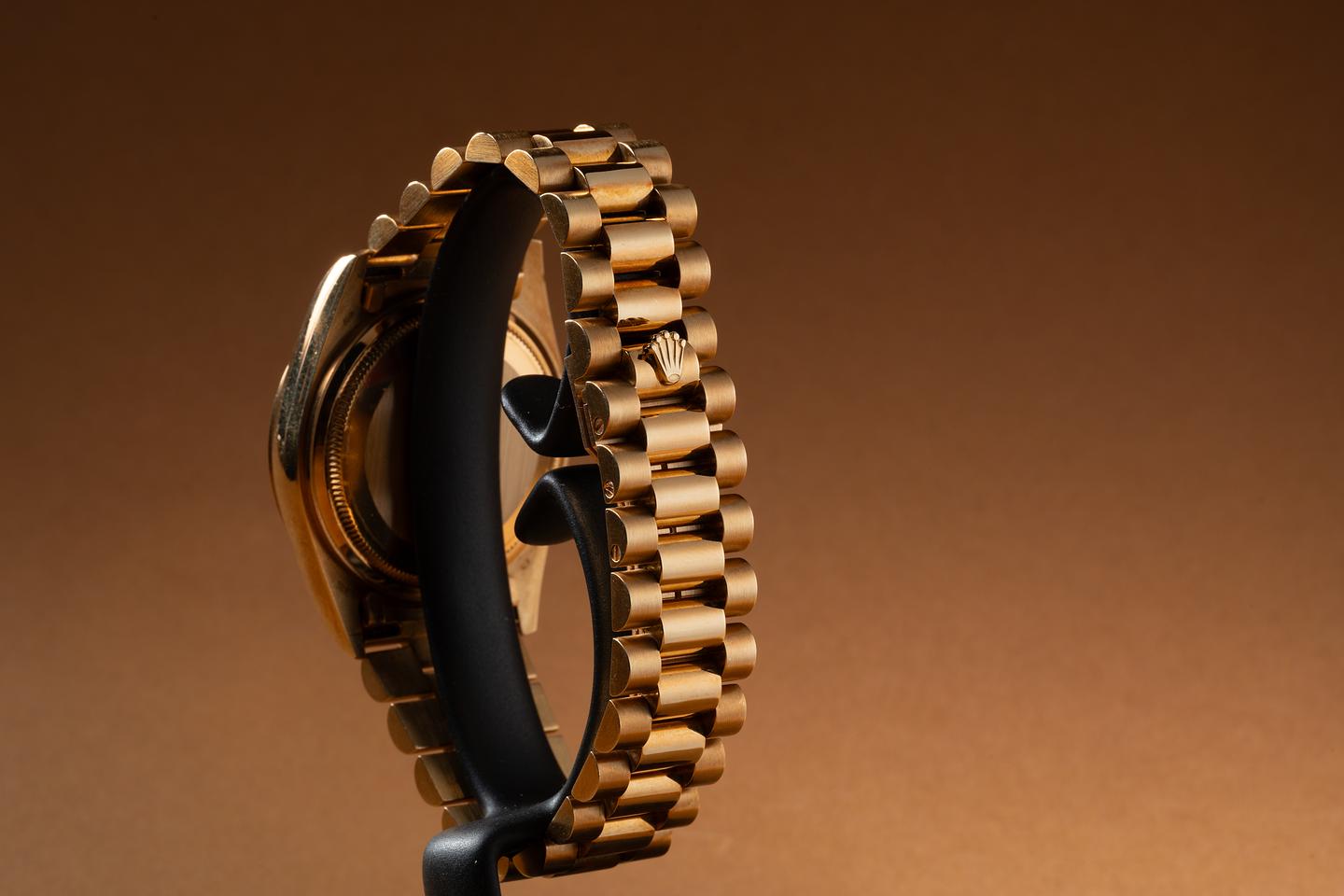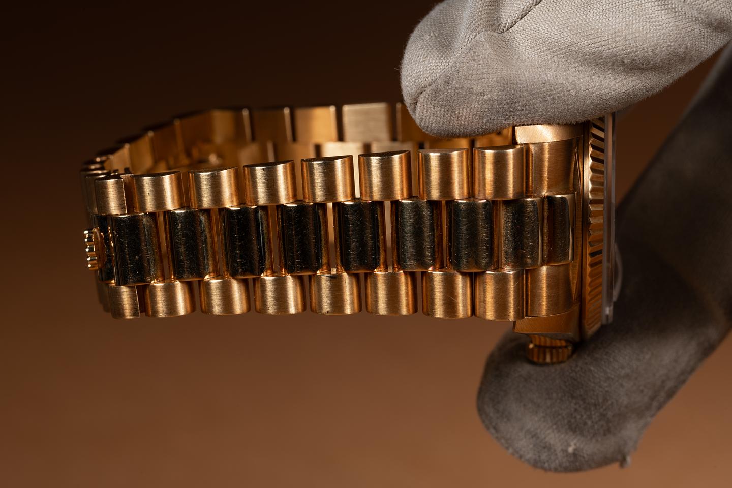 Bracelet: The 22 link 18K patinaed yellow gold President bracelet is excellent showing only very light stretch for its age. The clasp is stamped with a matching 1986 date code.