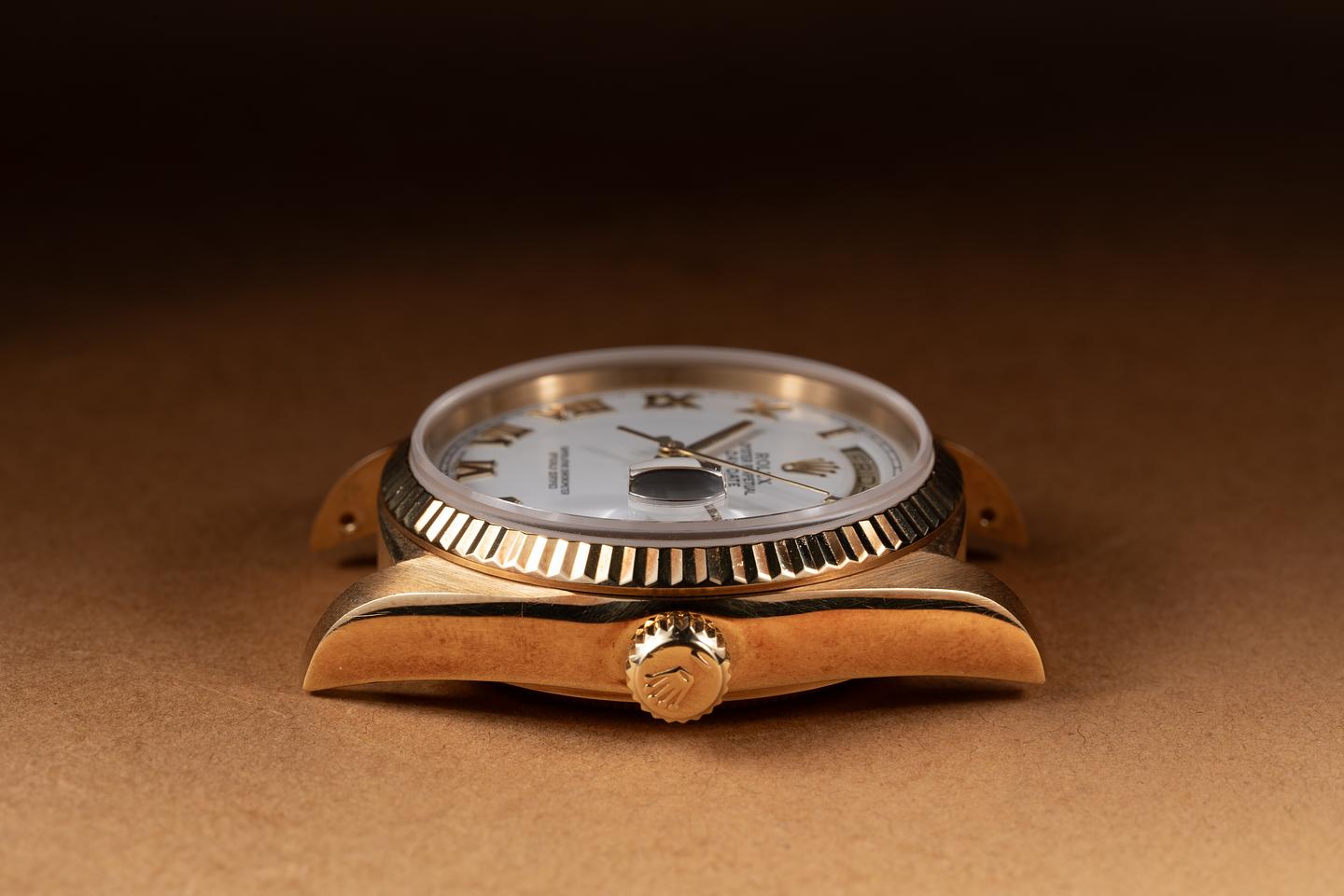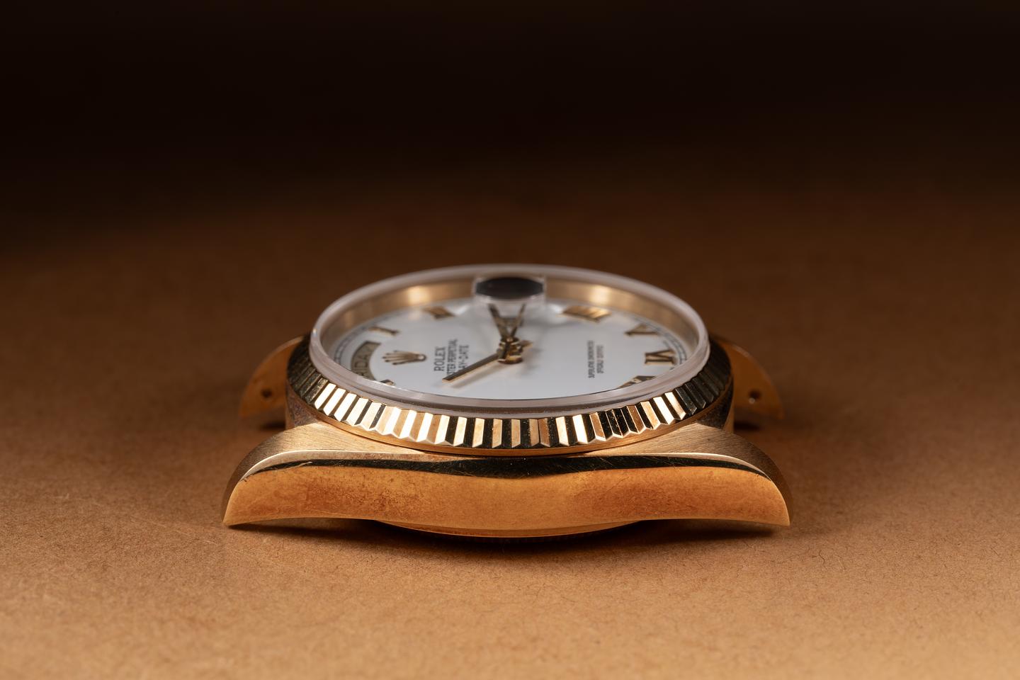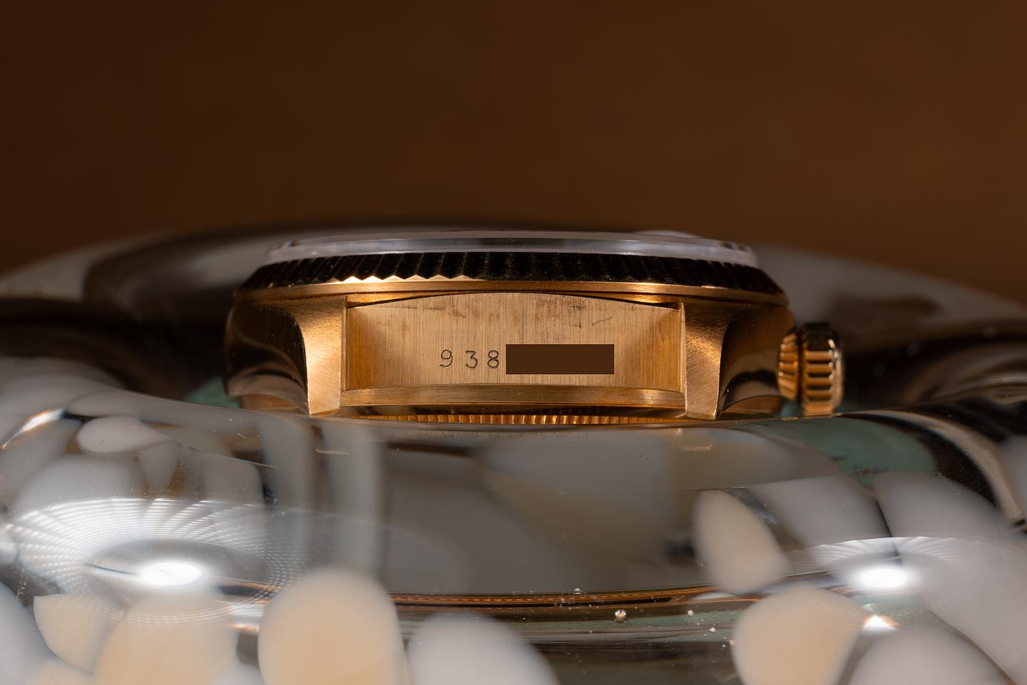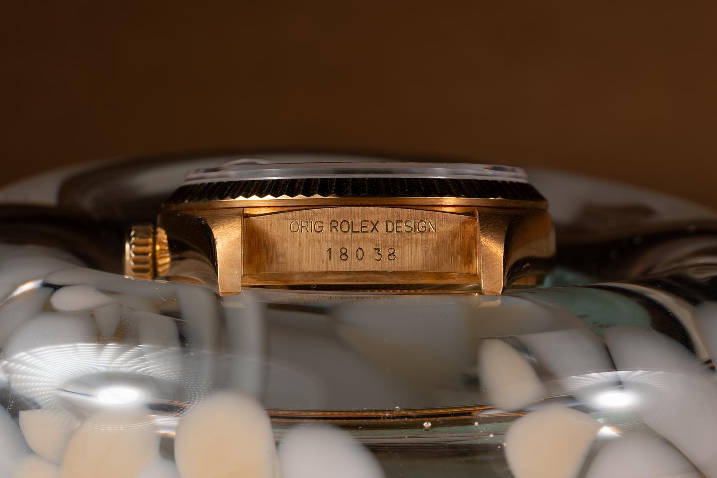 Case: The thick, sharp, and even 18k yellow gold case appears to be unpolished showing a warm rosy patina and only very light wear. The sharp 18k yellow gold fluted bezel is also in excellent condition showing a warm rosy patina that matches the case and only very light wear.