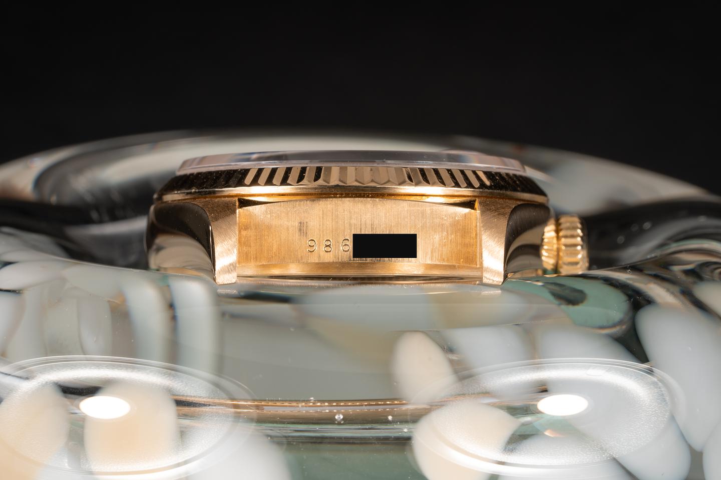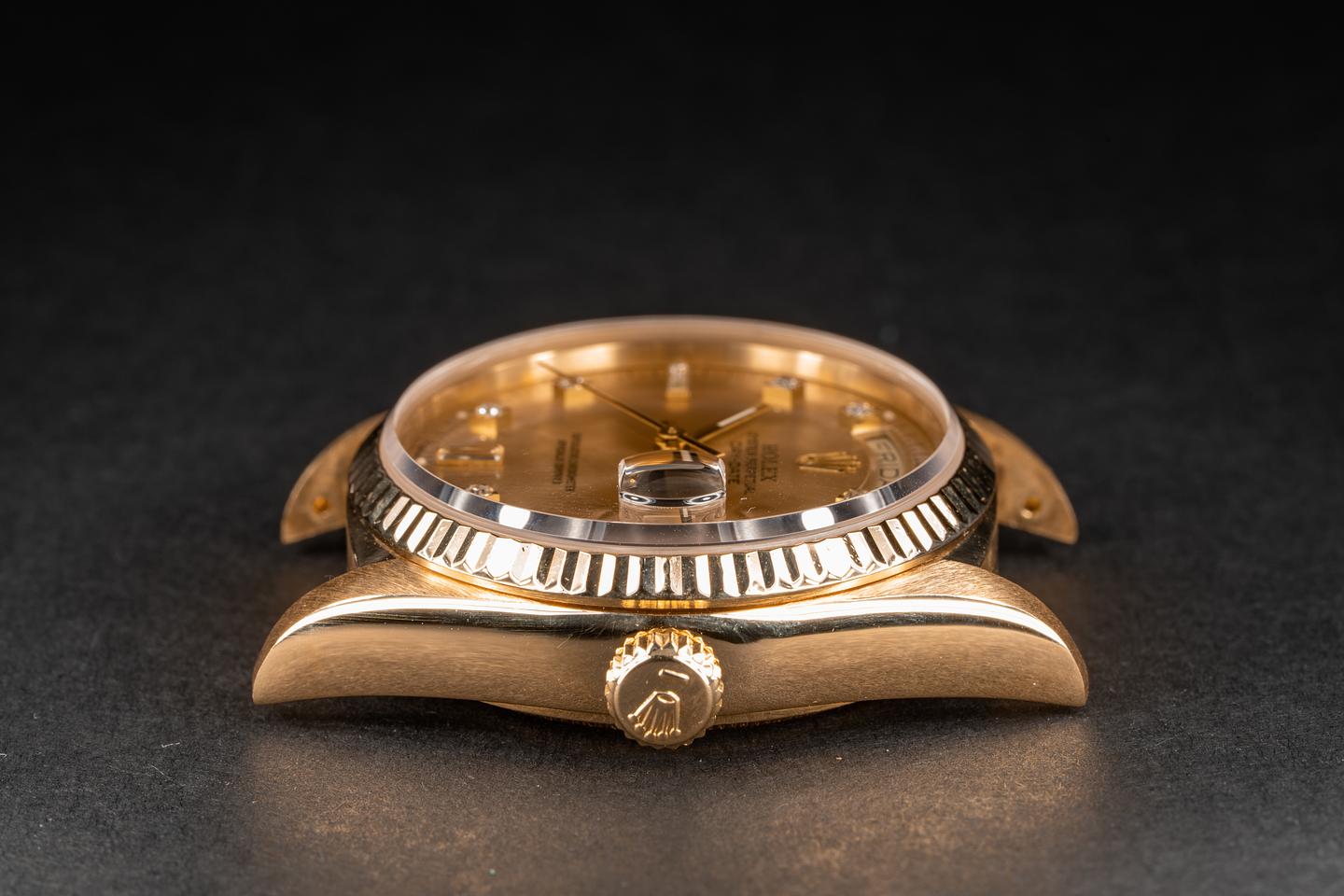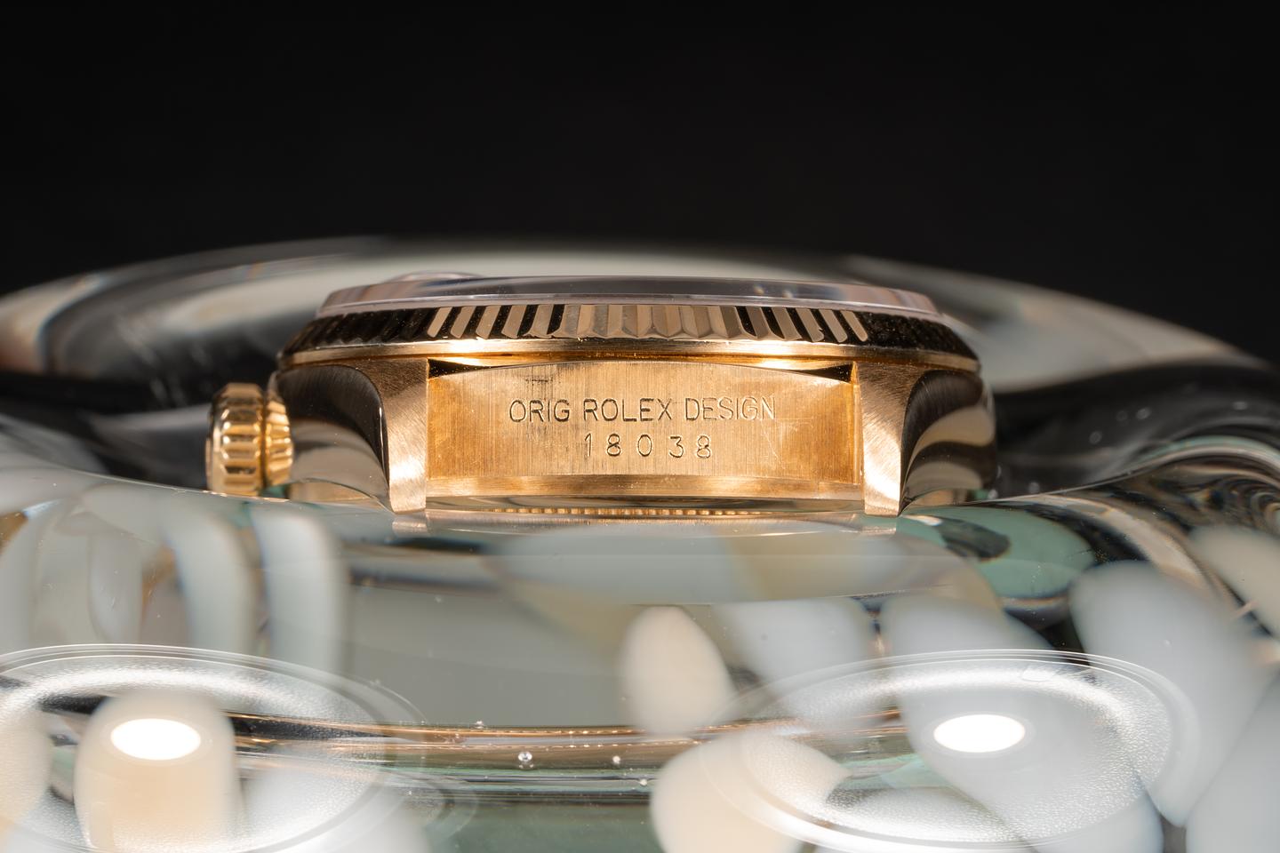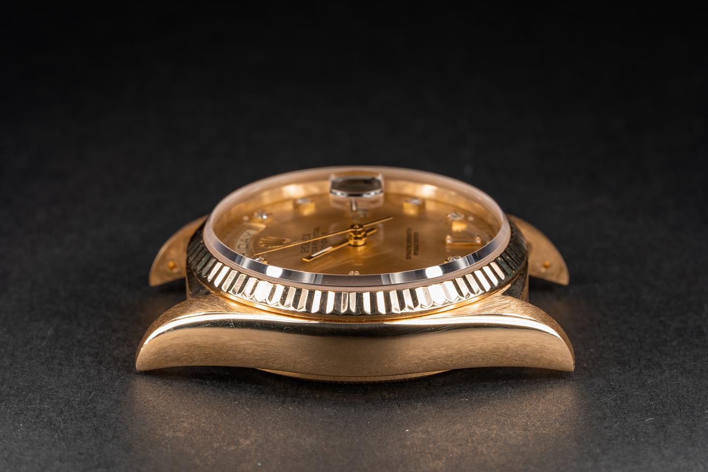 Case: The 18k yellow gold case is excellent and shows only very light wear for its age. The 18k fluted bezel is sharp and shows very light wear.