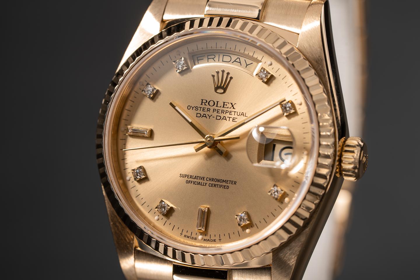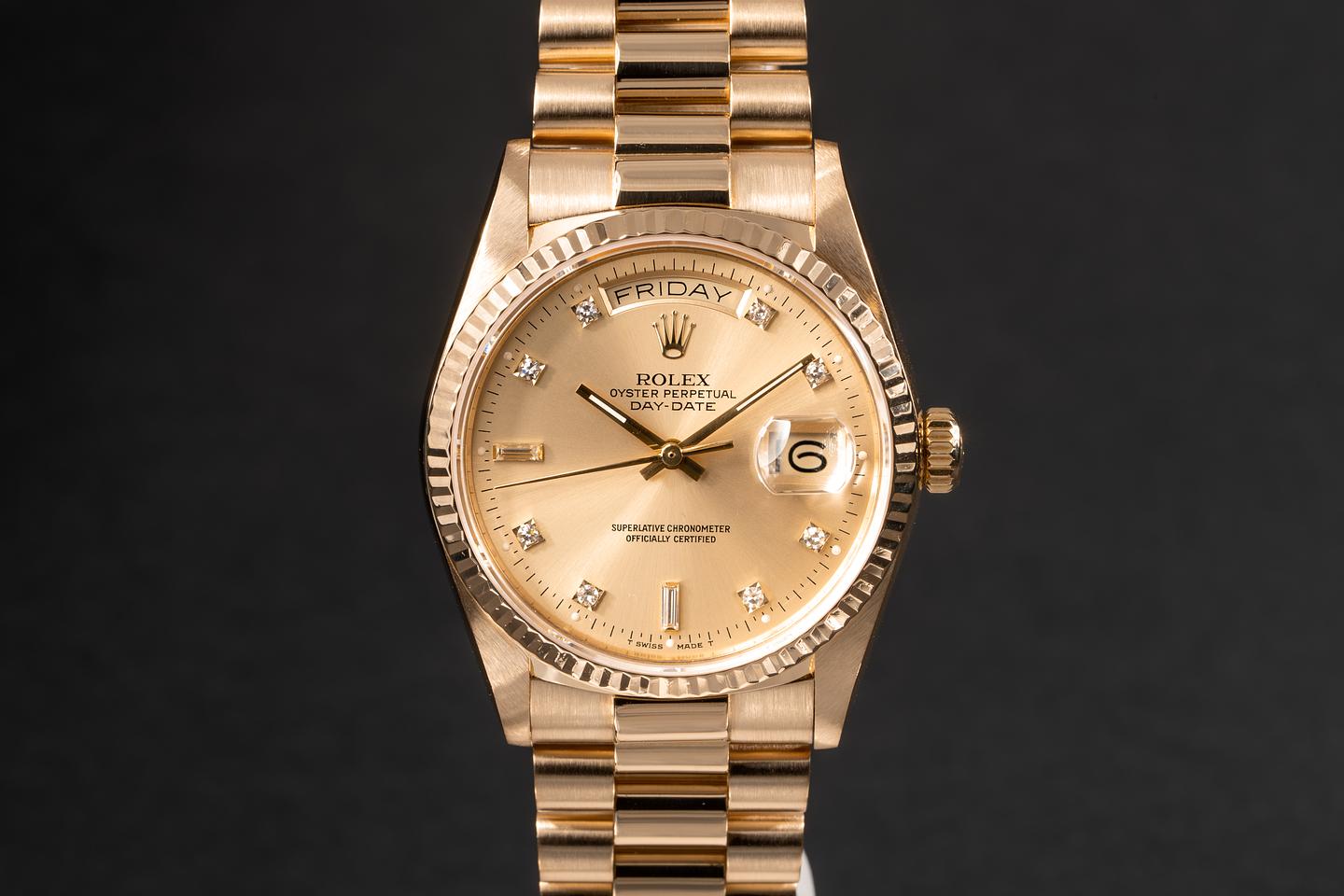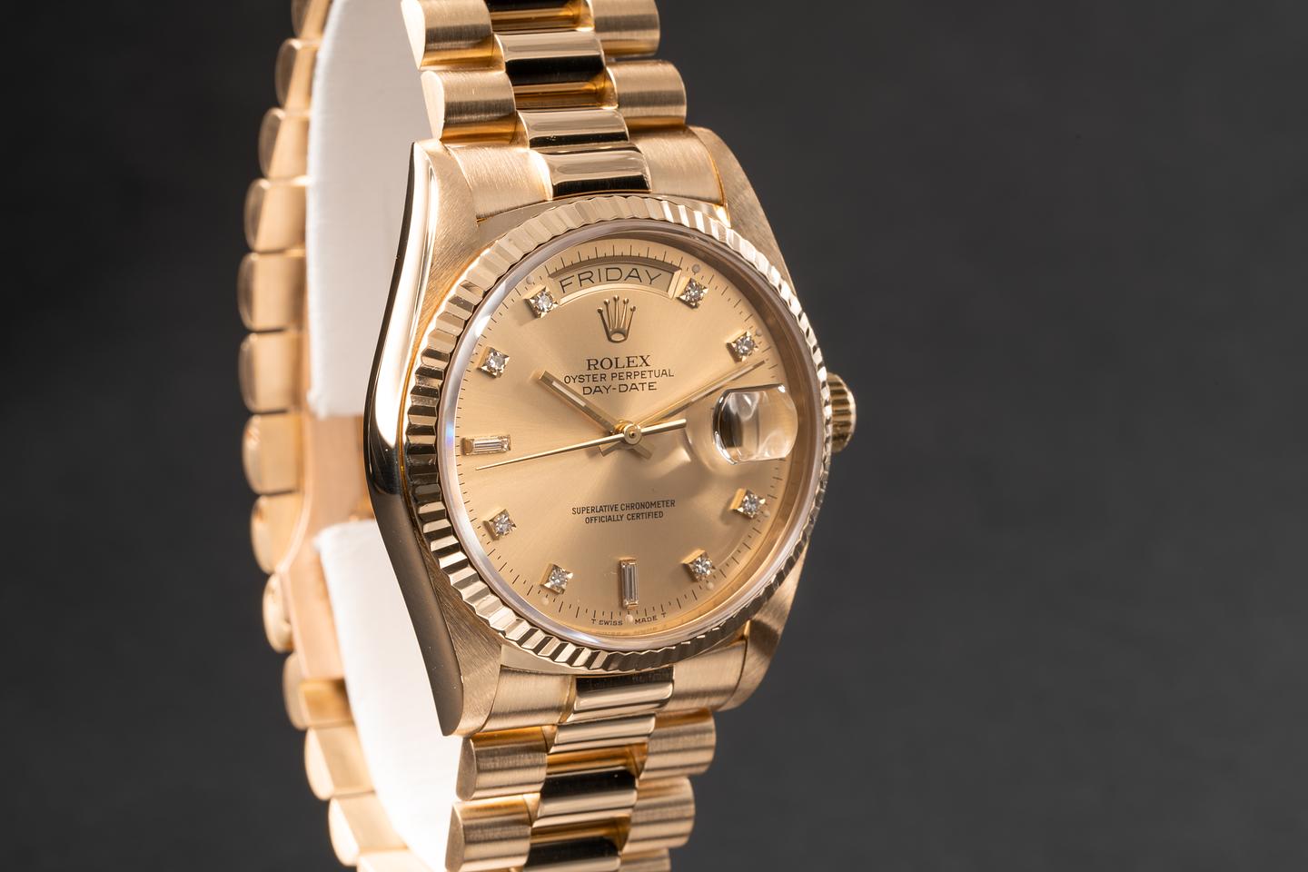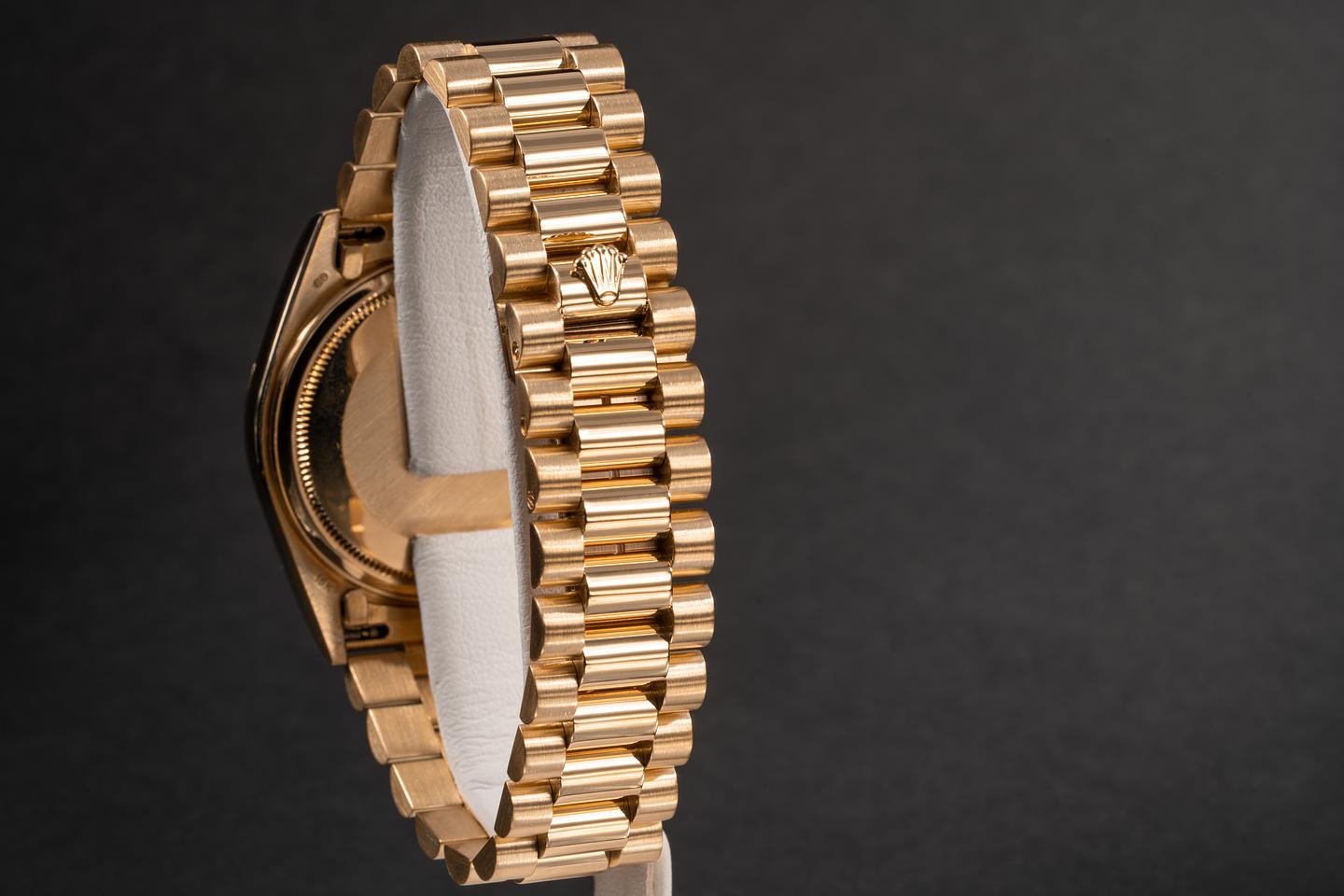 Bracelet: The 21 link 18k yellow gold president bracelet is excellent and shows only light stretch for its gae.