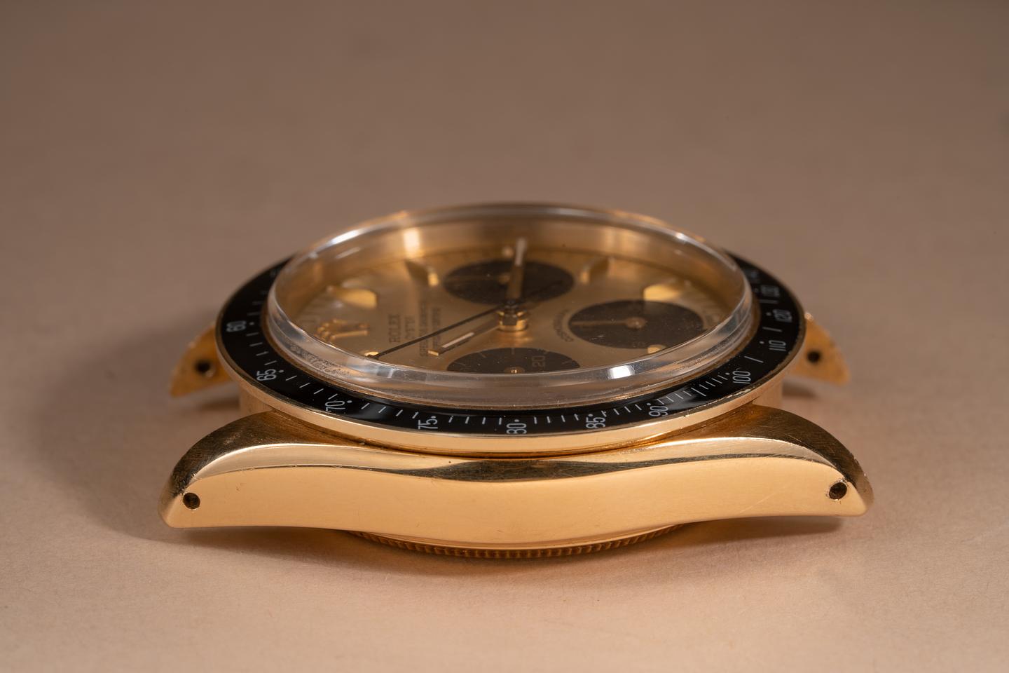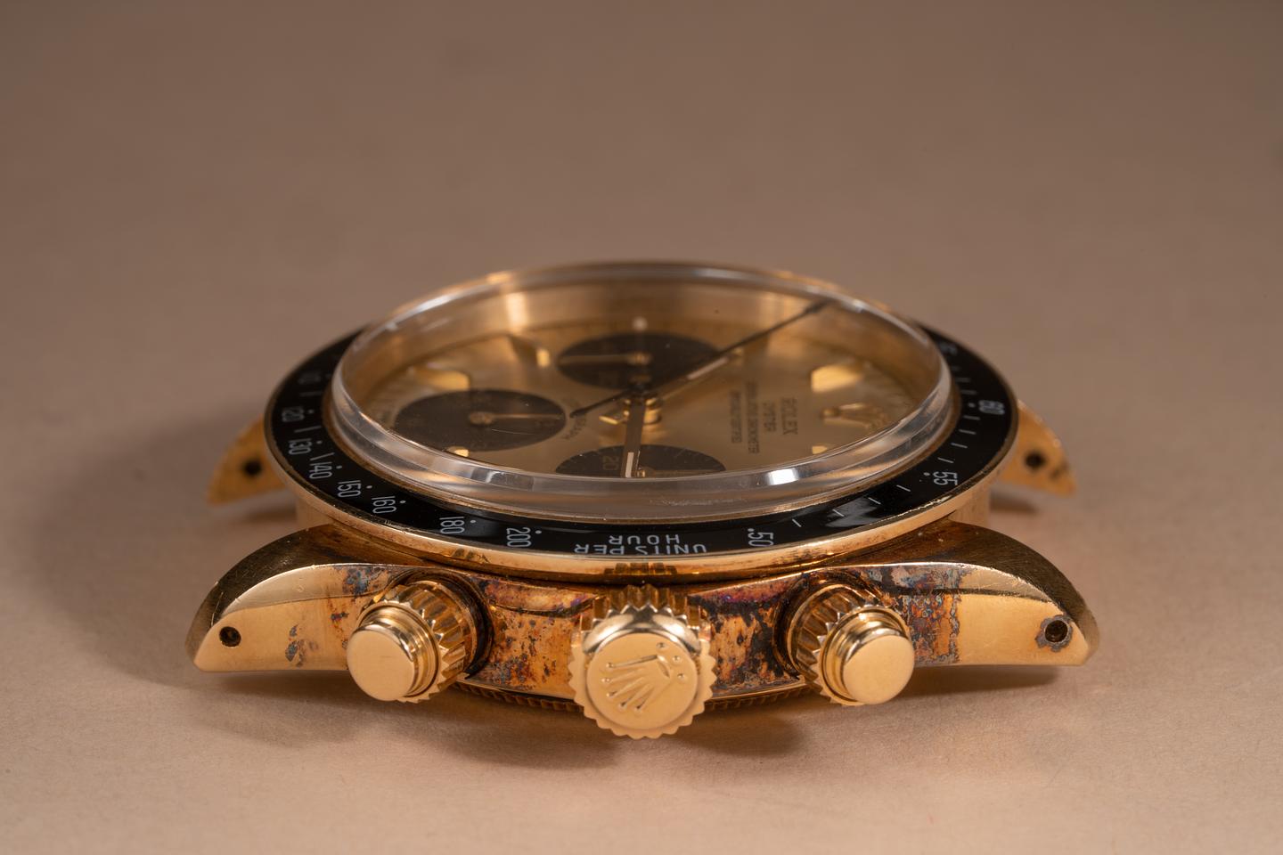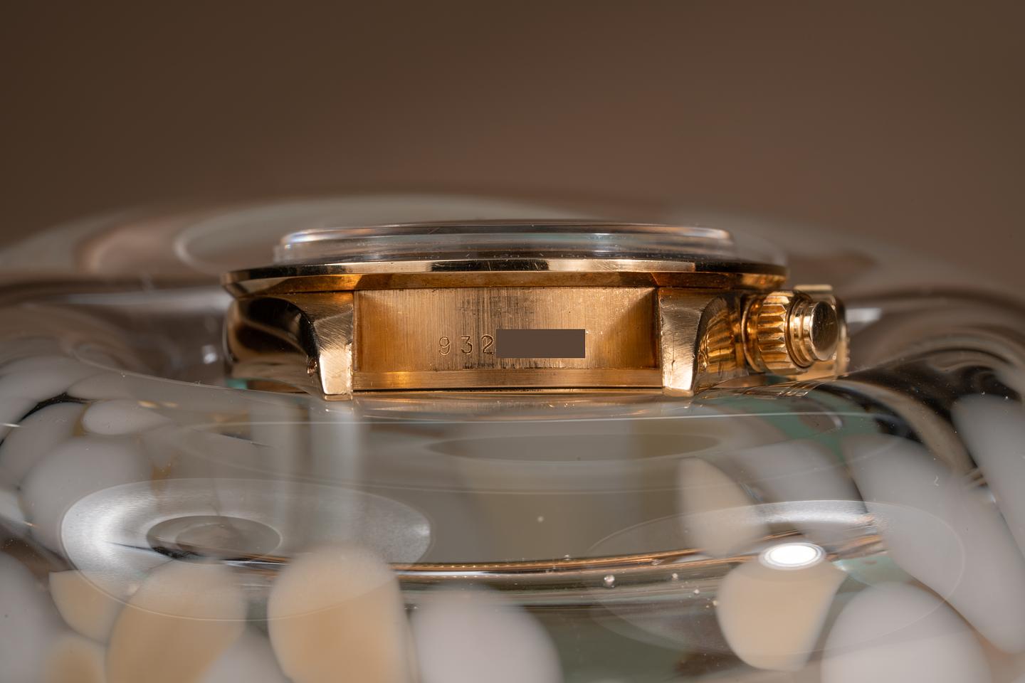 Case: The thick and even 18k yellow gold case is excellent showing light wear and a rosy rainbow patina on the crown side of the case. The black bezel insert is also in excellent condition showing only light wear from use.