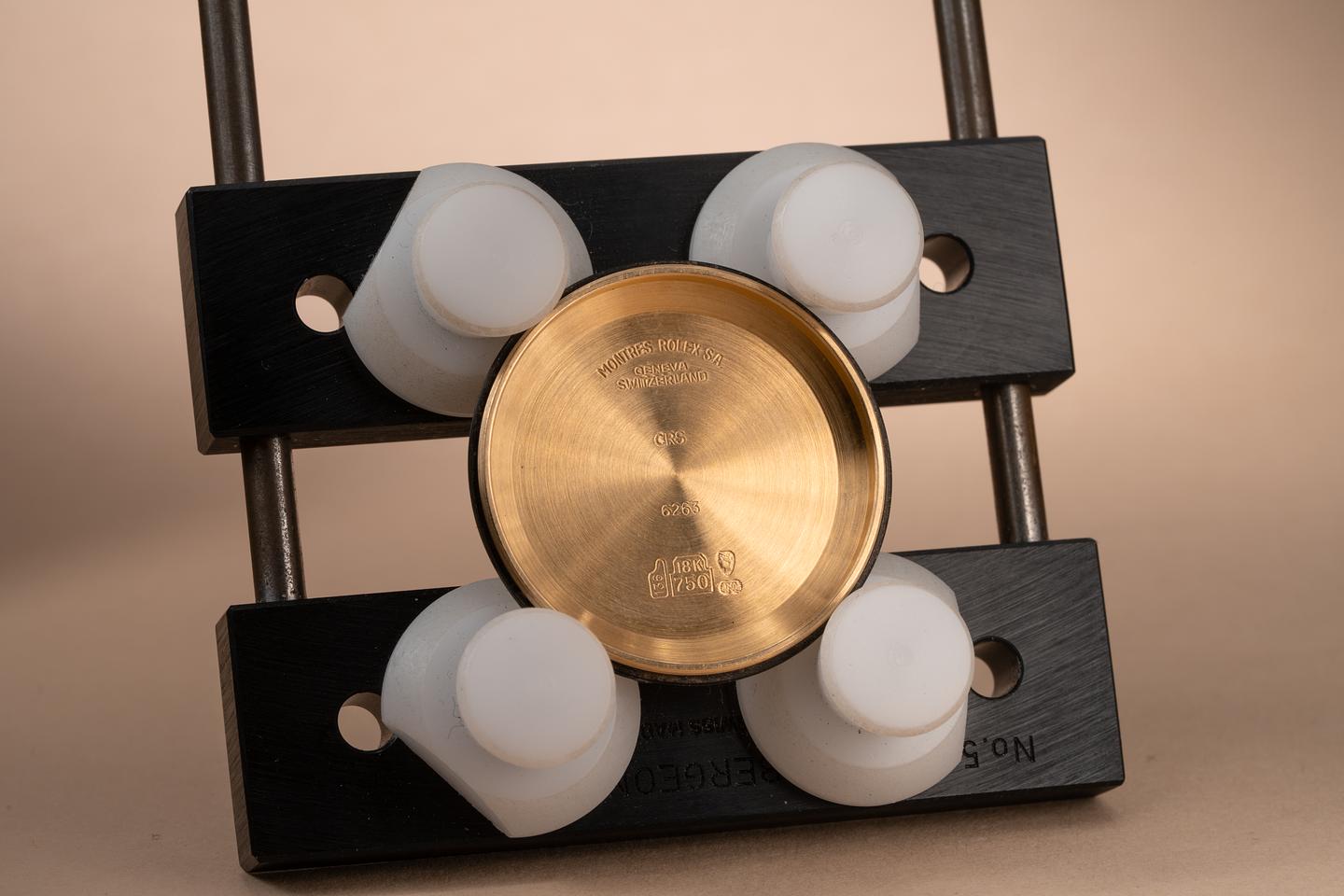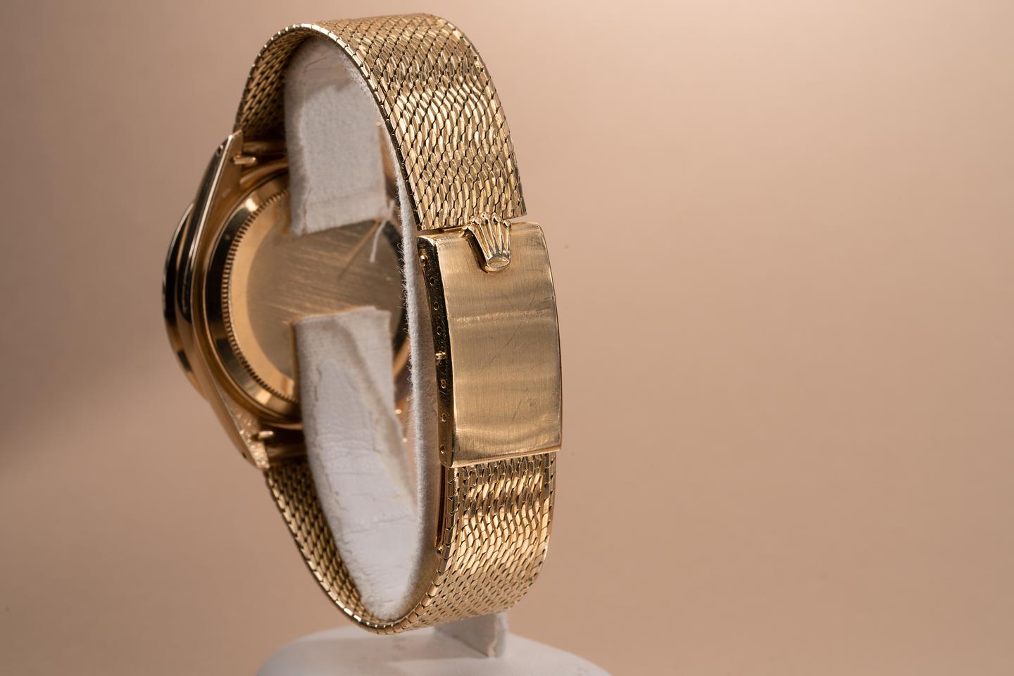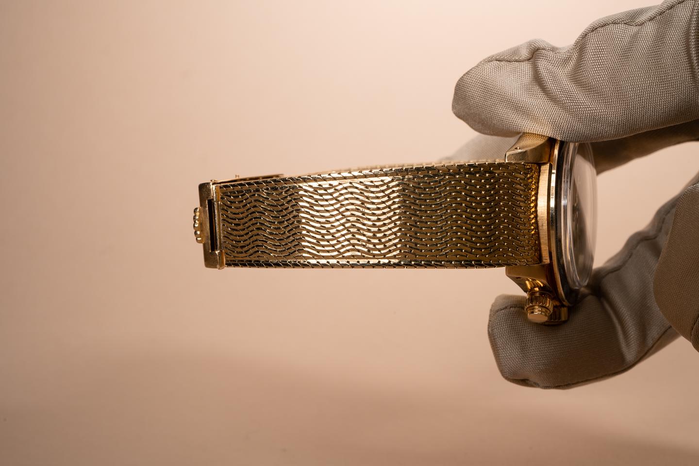 Bracelet: The Rolex 18k yellow gold mesh wave bracelet is excellent showing no perceivable stretch. The bracelet will fit between a 6.5 and a 7.5 inch wrist. The clasp is stamped with a 1961 date code. The band was purchased separately form the watch and worn together by the last client that had the watch.