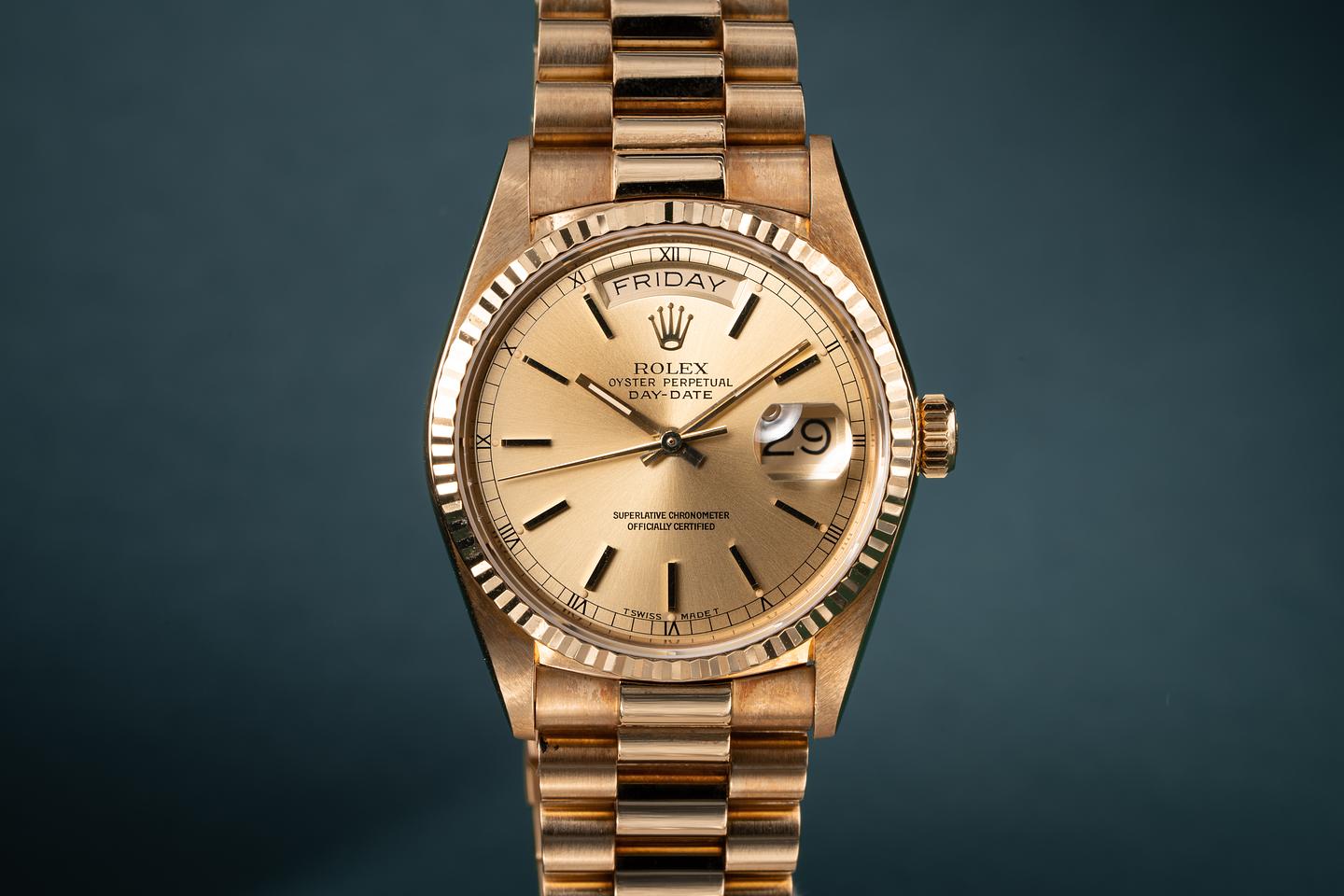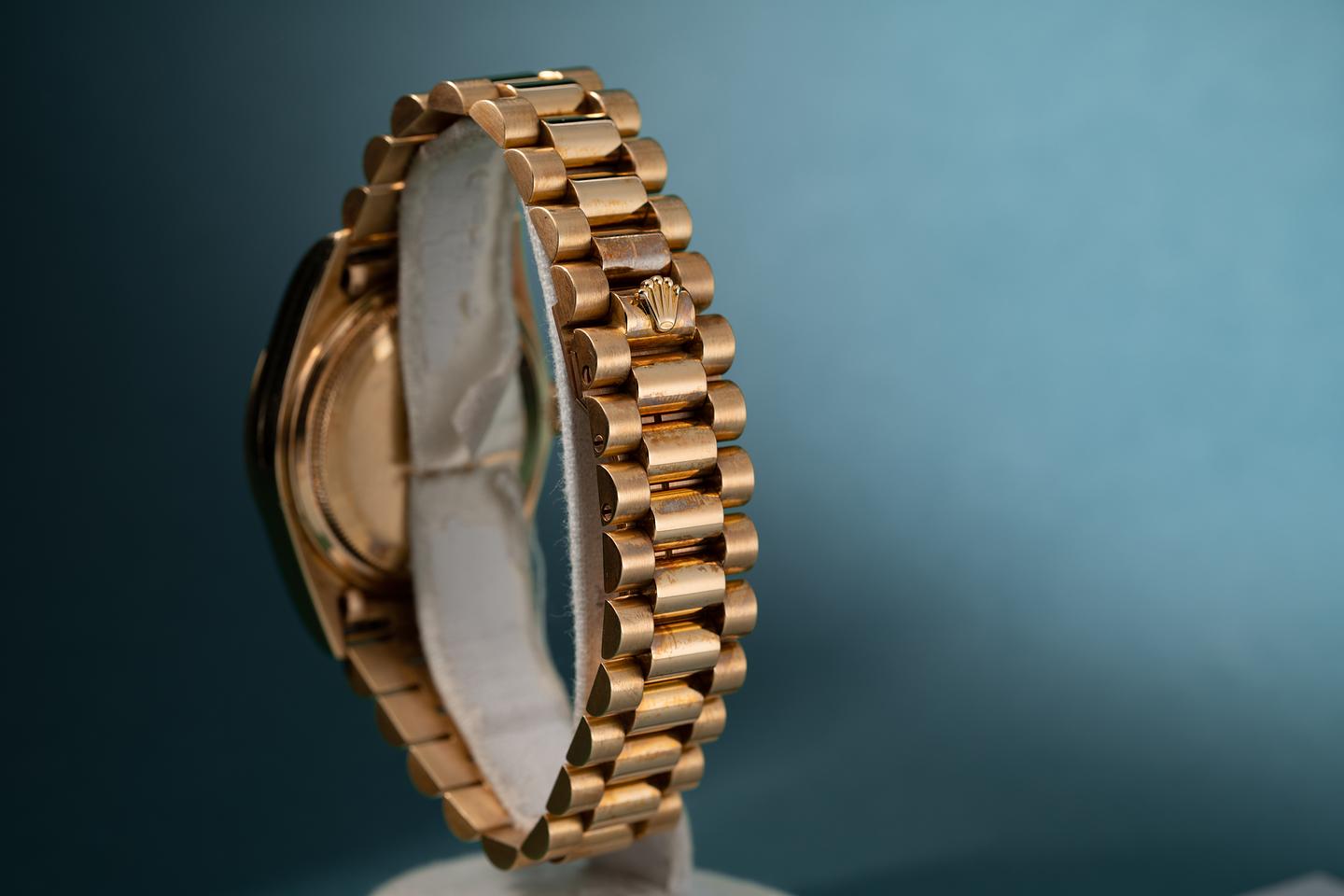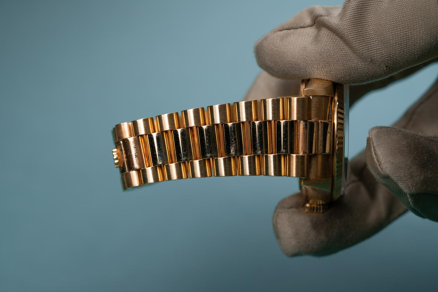 Bracelet: The 22 link 18k yellow gold president bracelet is excellent showing only very light stretch for its age.