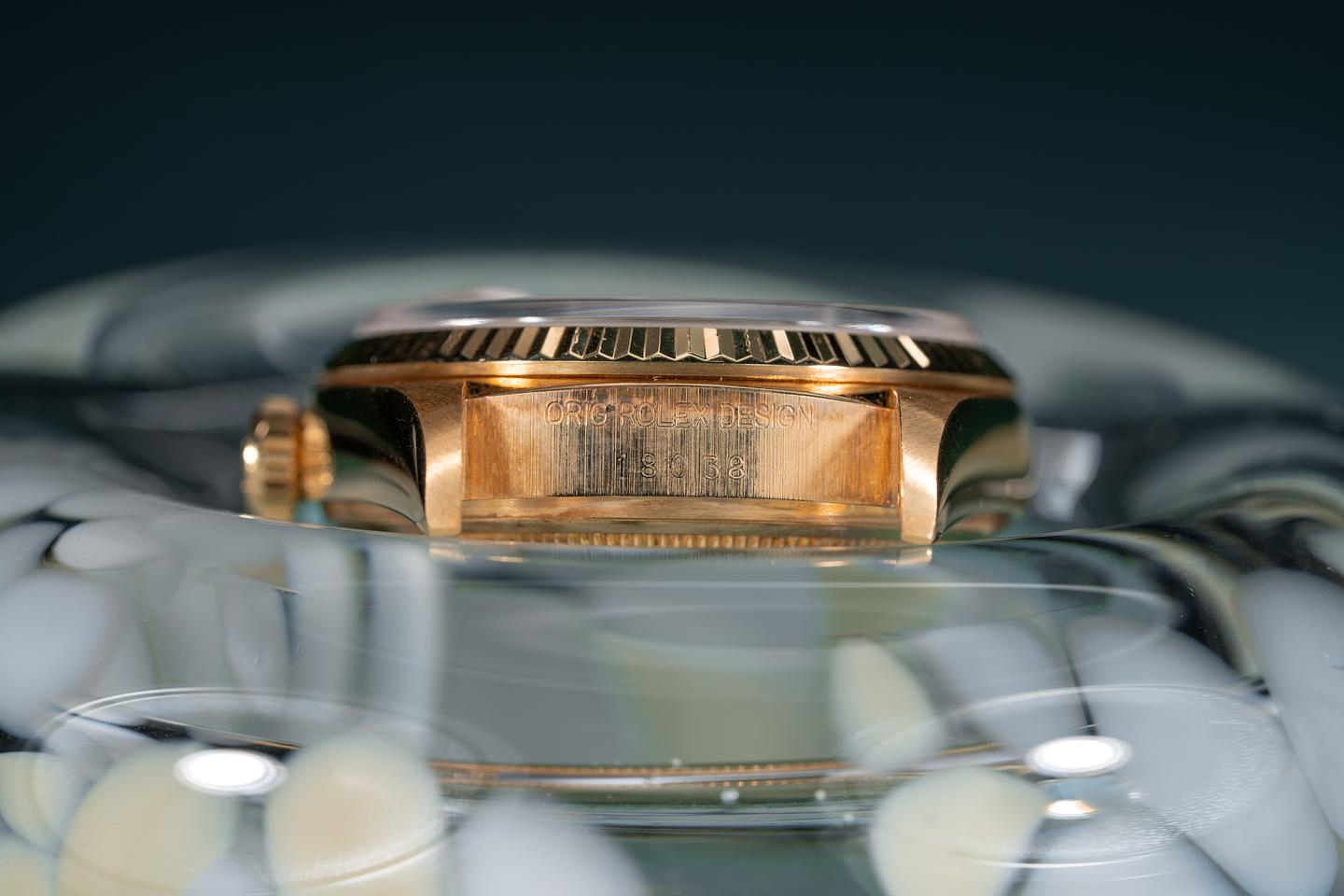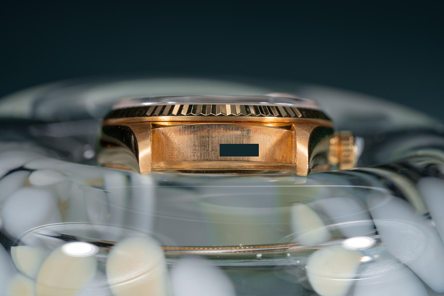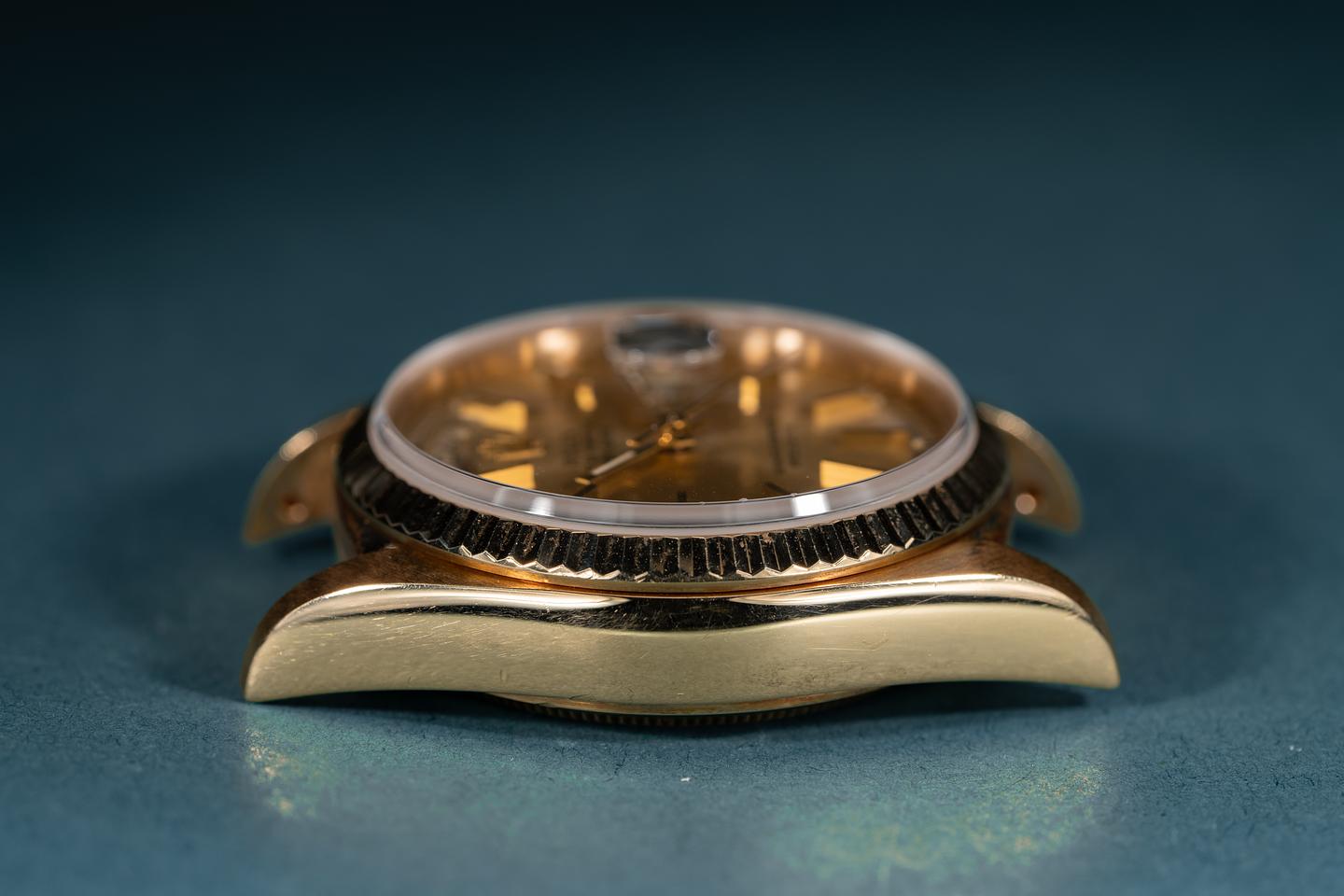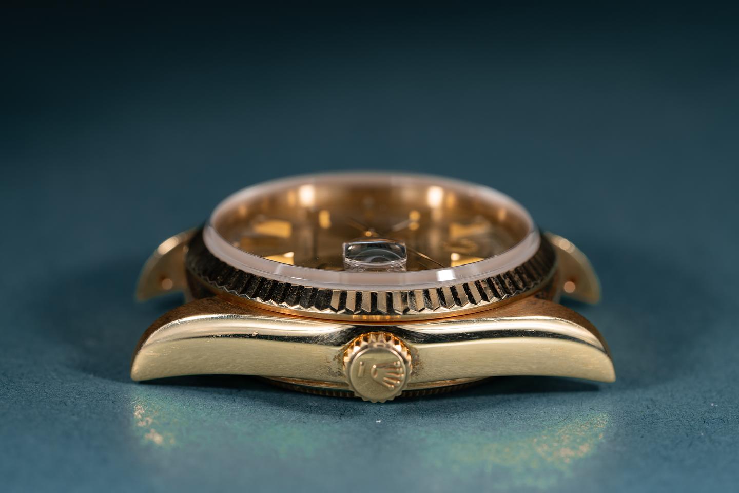 Case: The 18k yellow gold case is excellent showing only light wear from use. The 18k yellow gold fluted bezel is also in excellent condition showing only light wear from use.