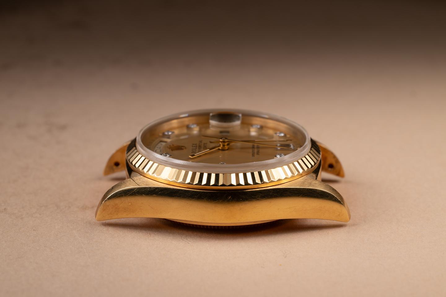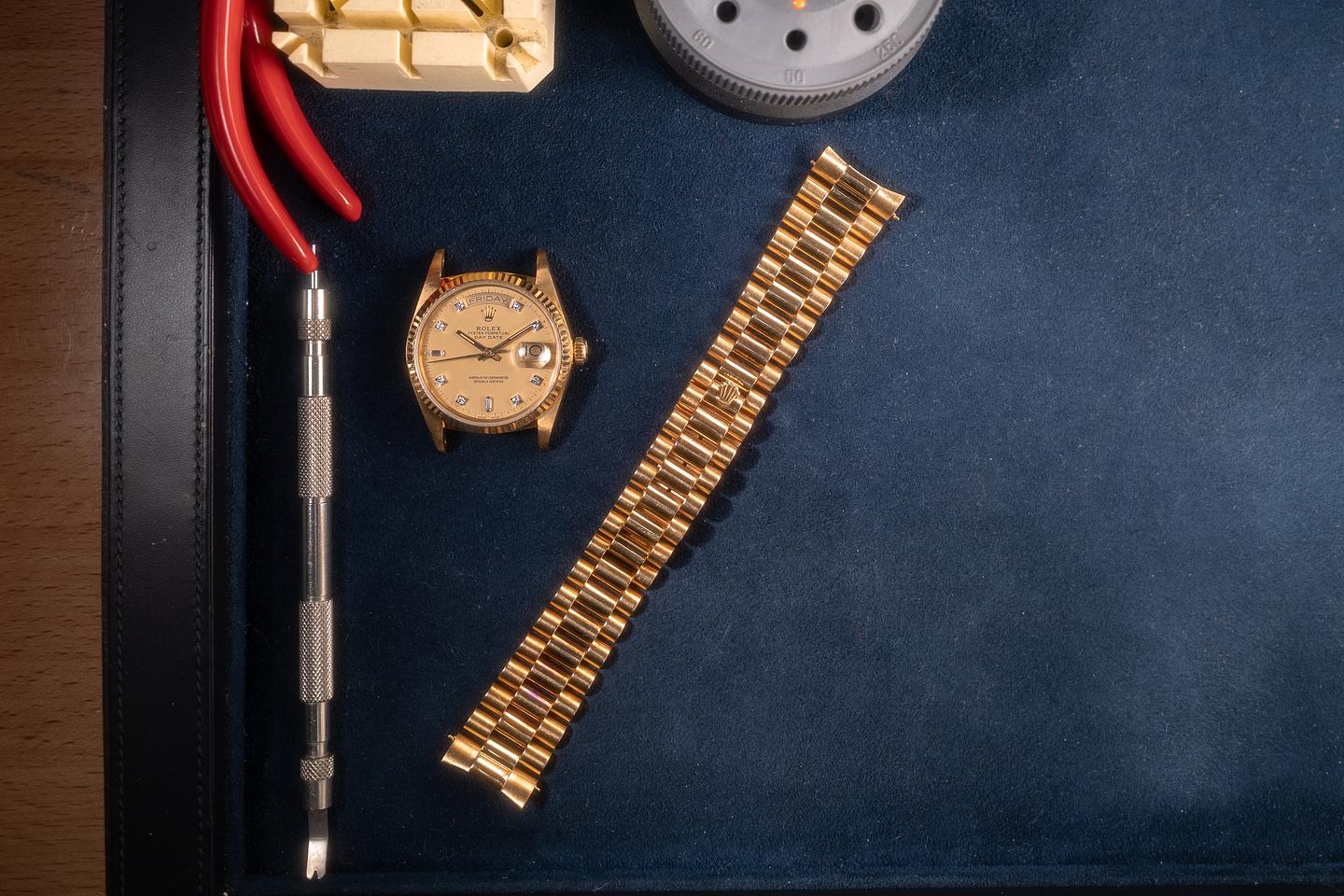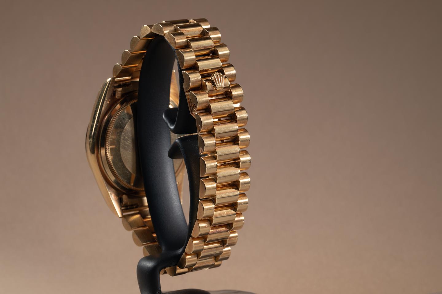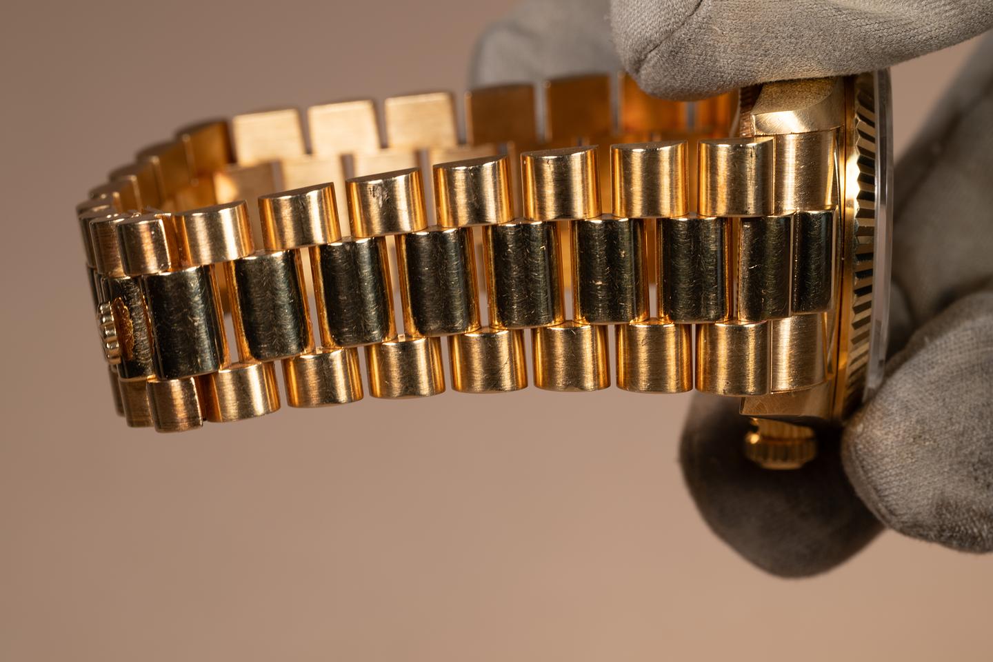 Bracelet: The 18K yellow gold President bracelet is excellent, showing only very light stretch for its age.