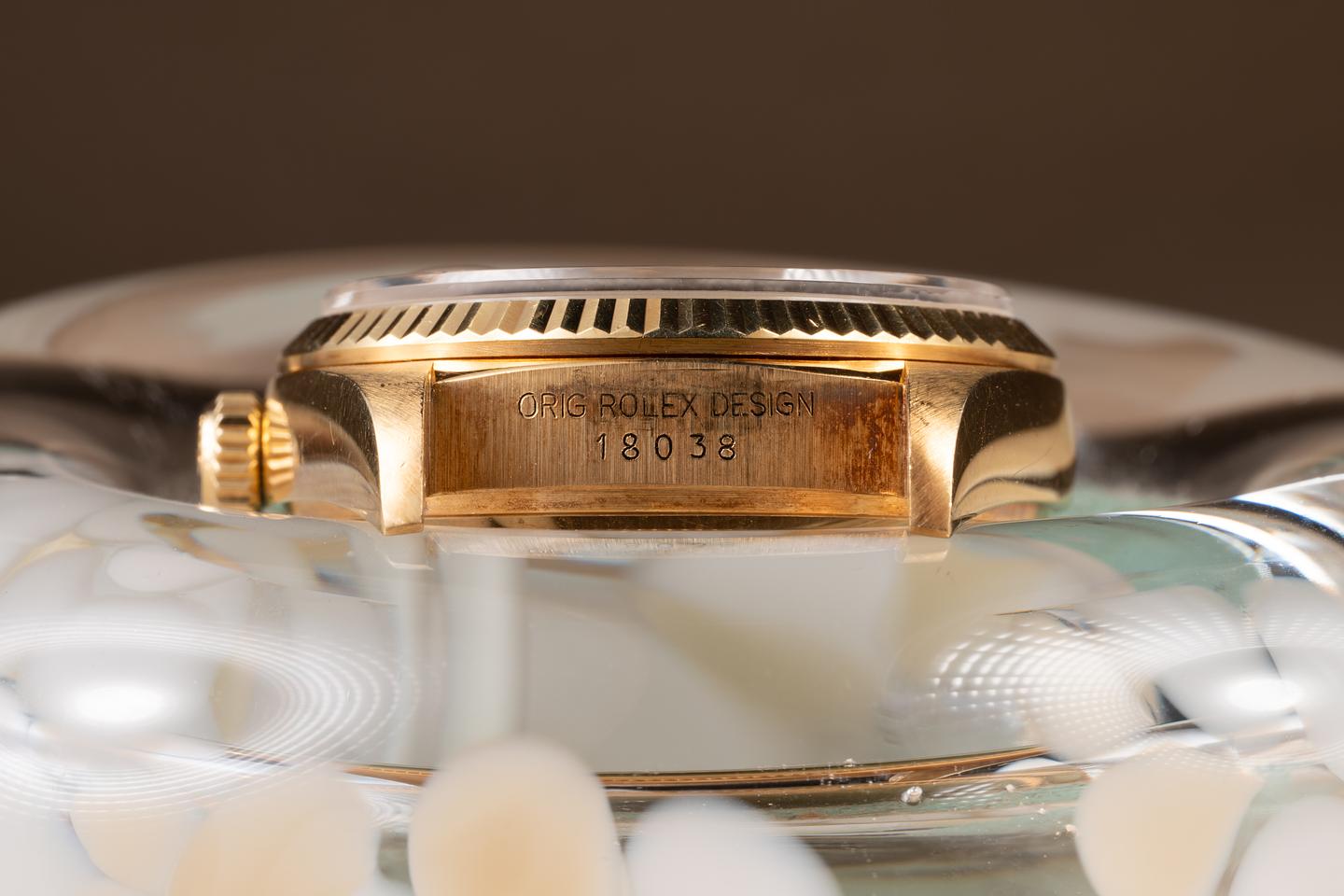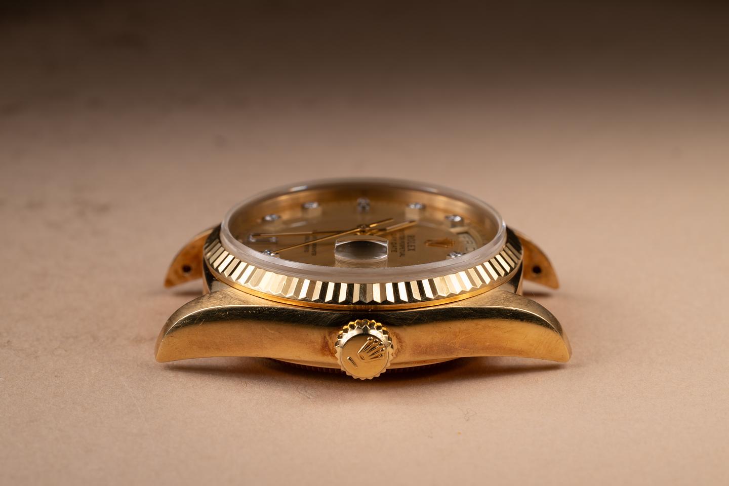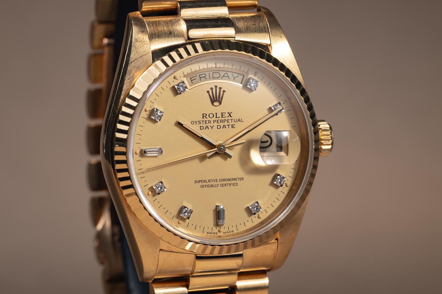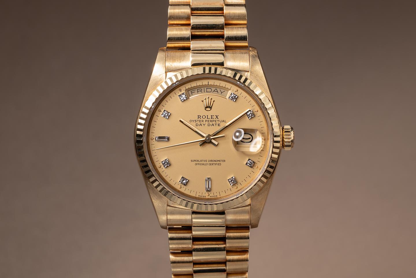 Bracelet: The 18K yellow gold President bracelet is excellent, showing only very light stretch for its age.