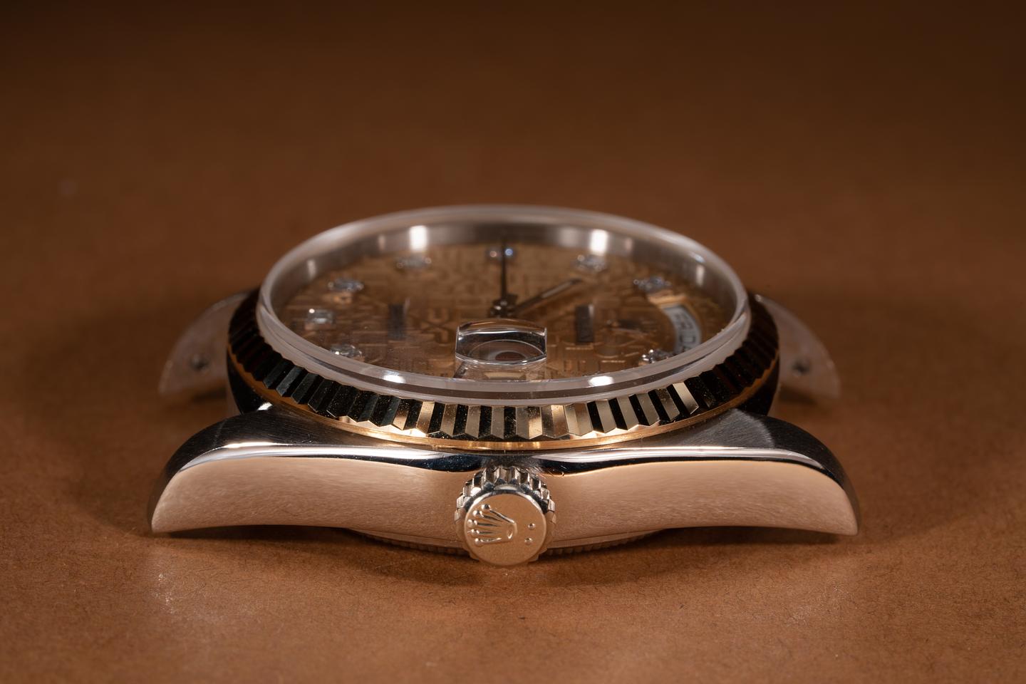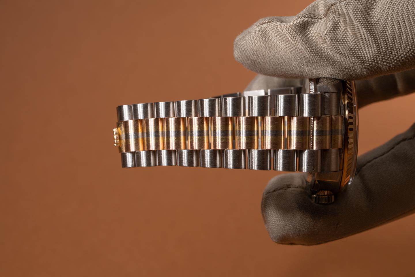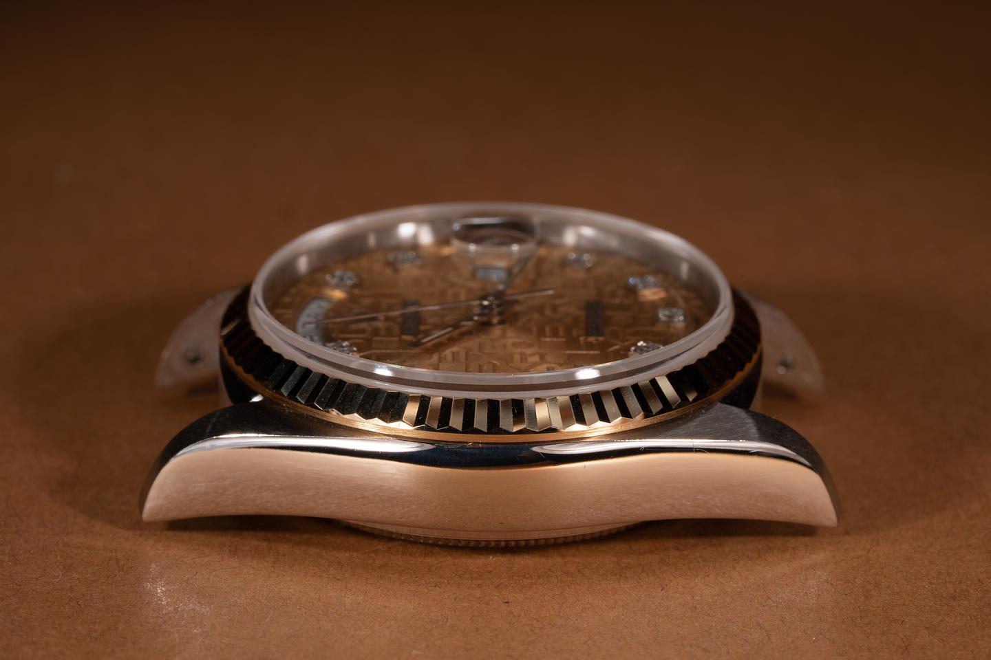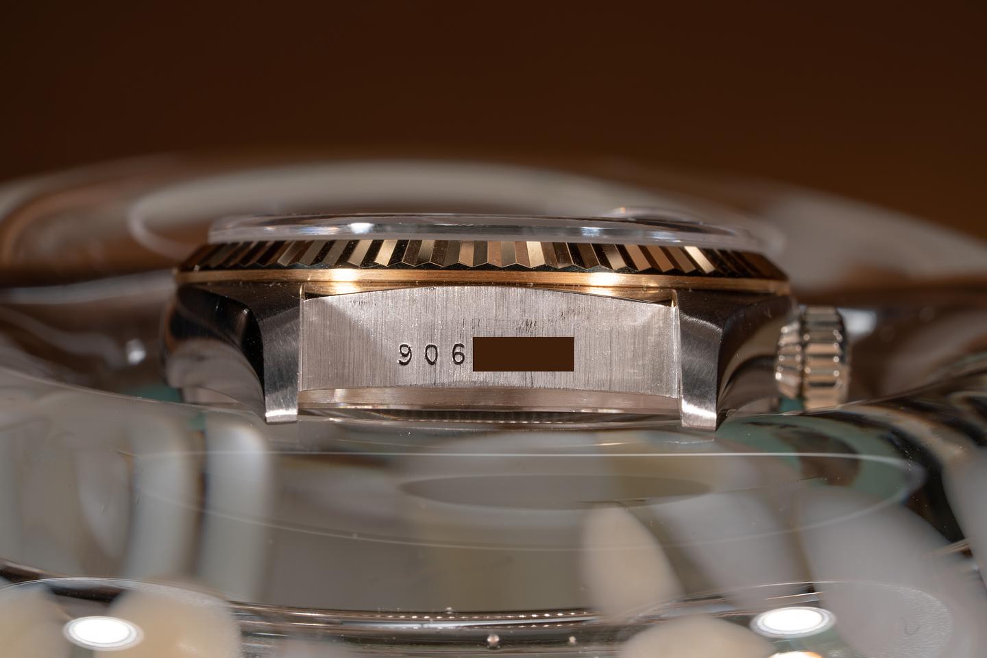 Case: The thick and even 18k white gold case is excellent showing only very light wear from use. The excellent 18k yellow gold fluted bezel is sharp showing only light wear from use.