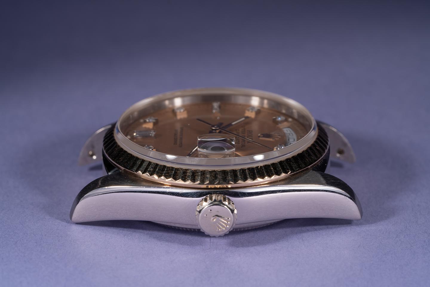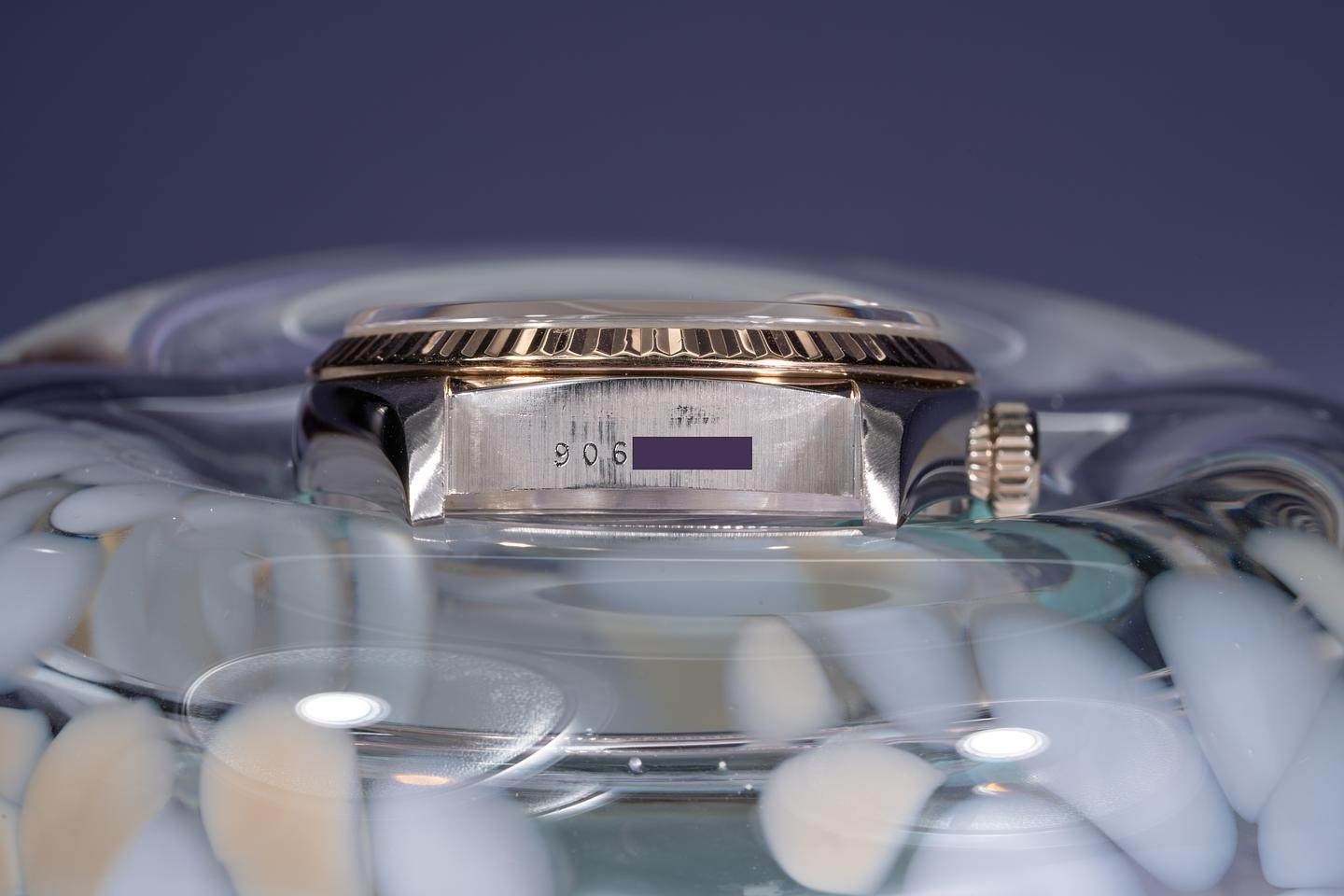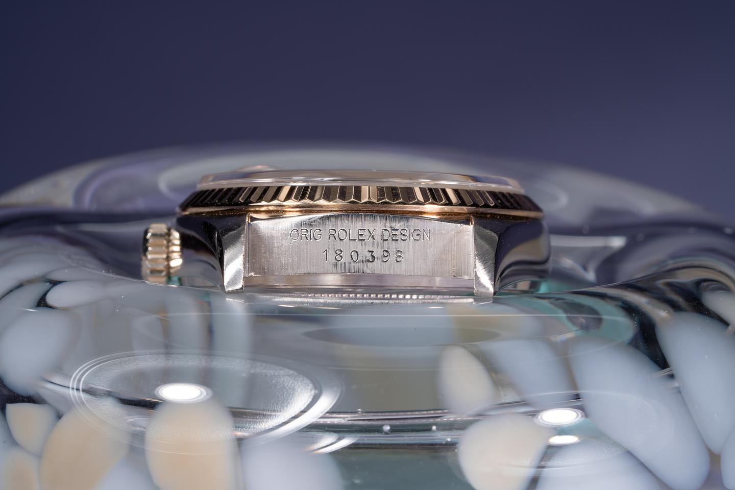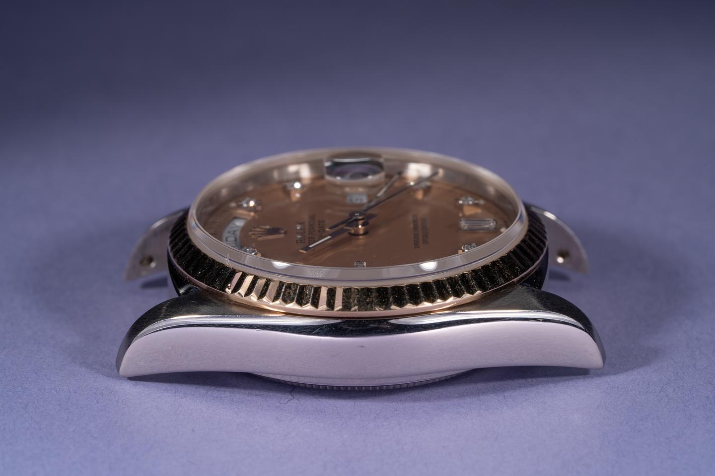 Case: The 18k white gold case is excellent showing only very light wear from use. The 18k yellow gold fluted bezel is also excellent showing only light wear from use.
