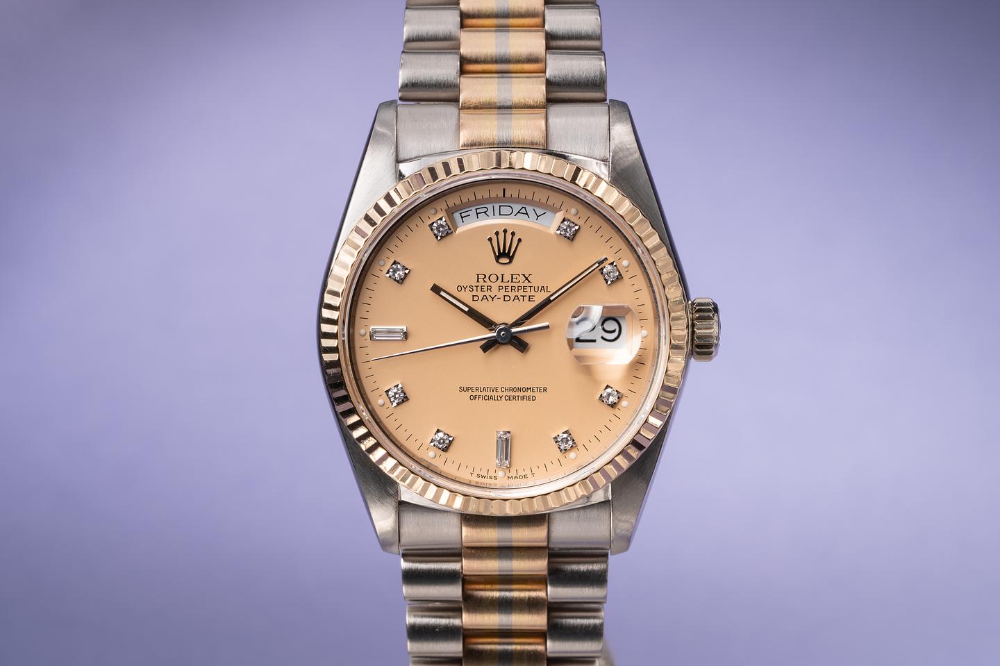 Dial: The satin champagne dial is excellent showing no visible wear with bright clean diamond markers. The lume plots have aged to a warm creamy hue and the hands match perfectly.