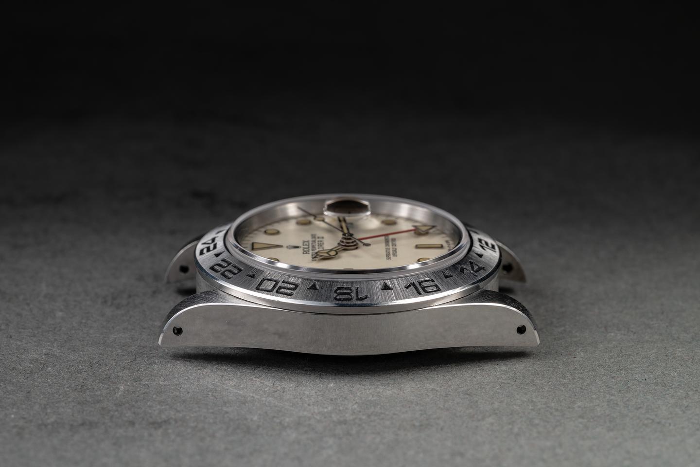 Case: The recently polished case is excellent, showing sharp, prominent bevels and only very light wear. The stainless bezel is also in excellent condition, showing only very light wear.