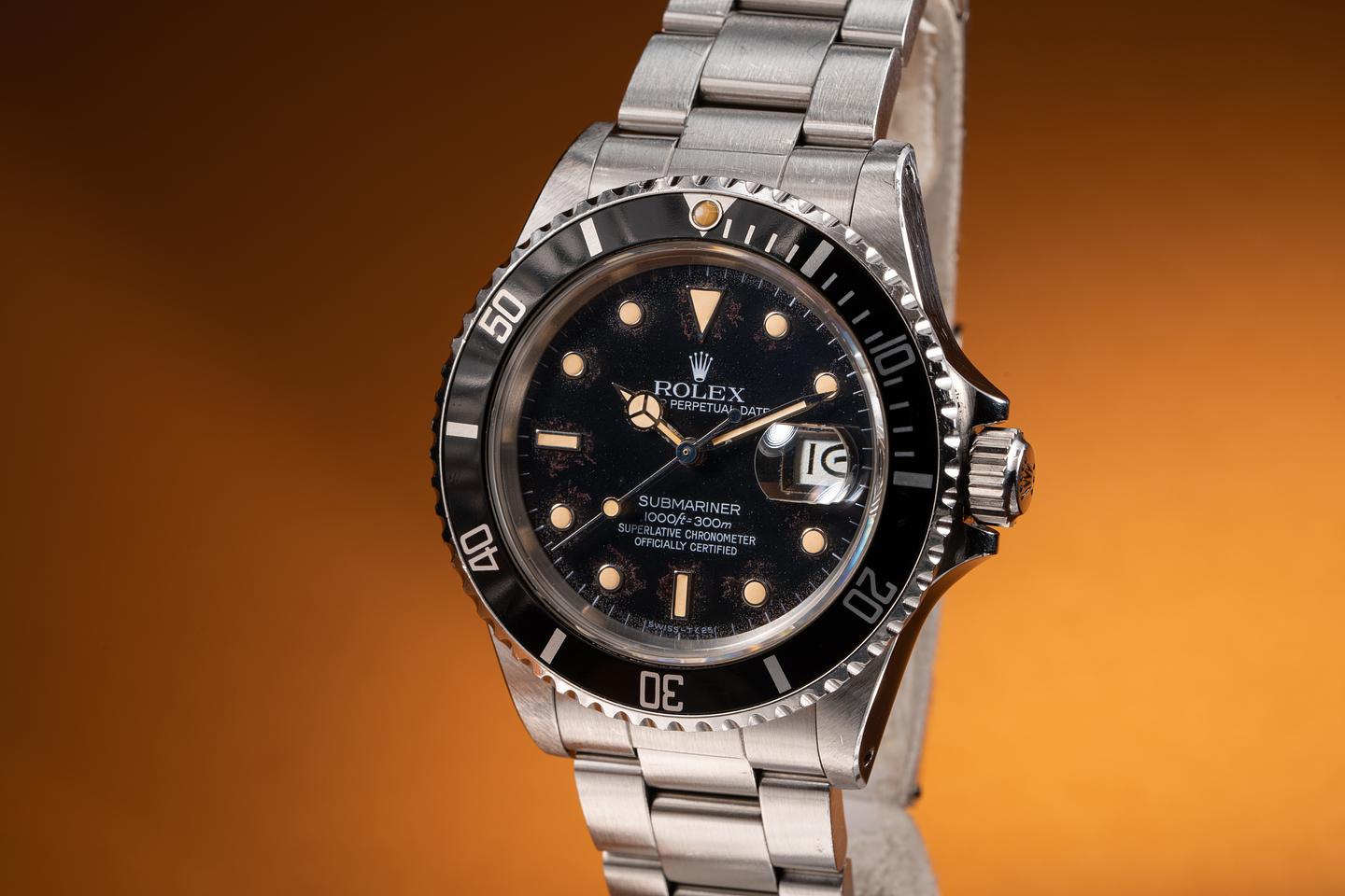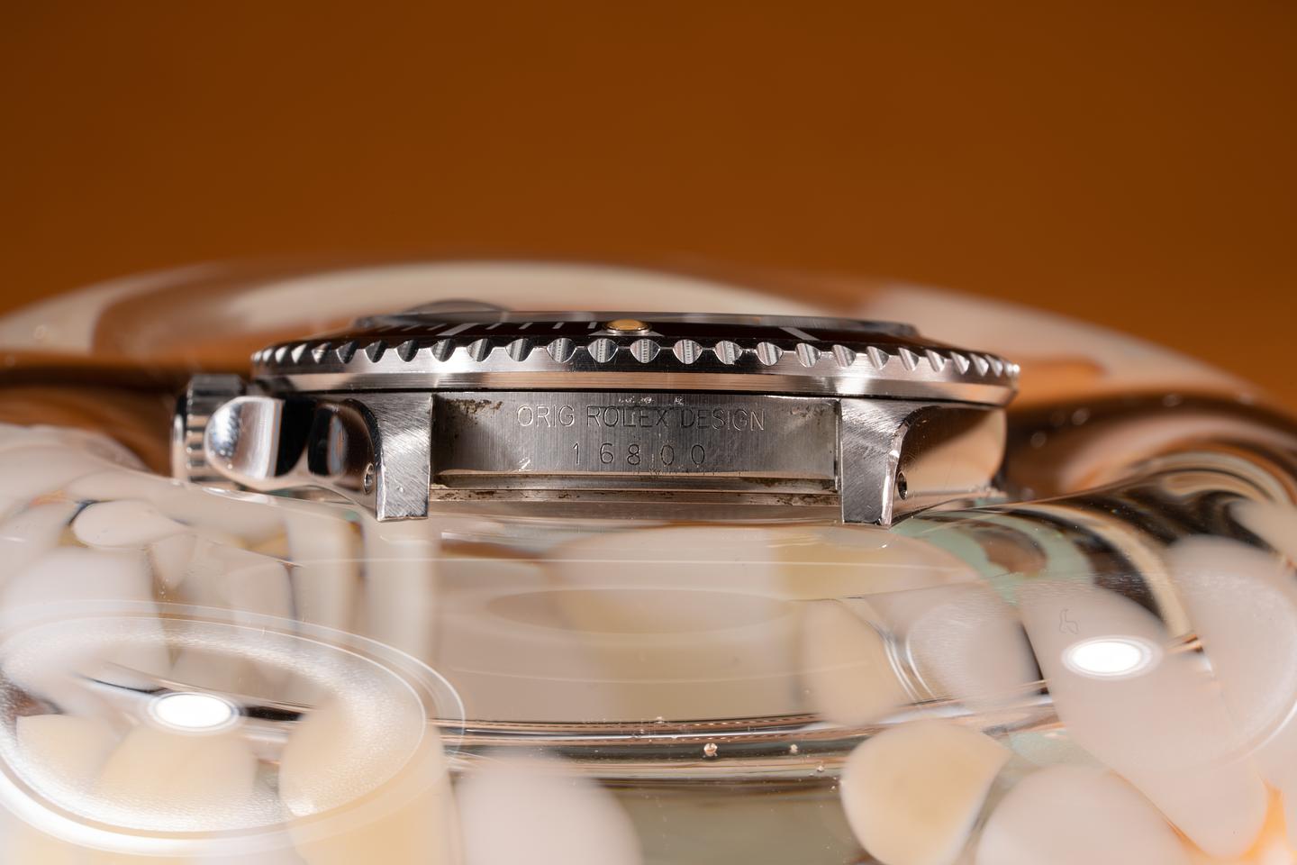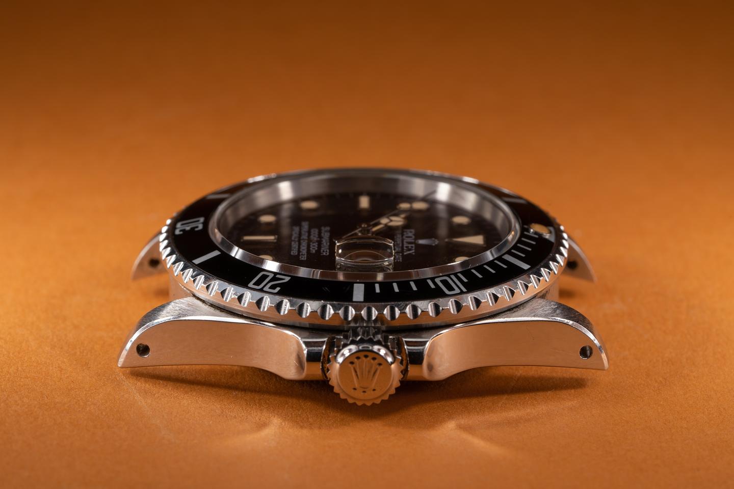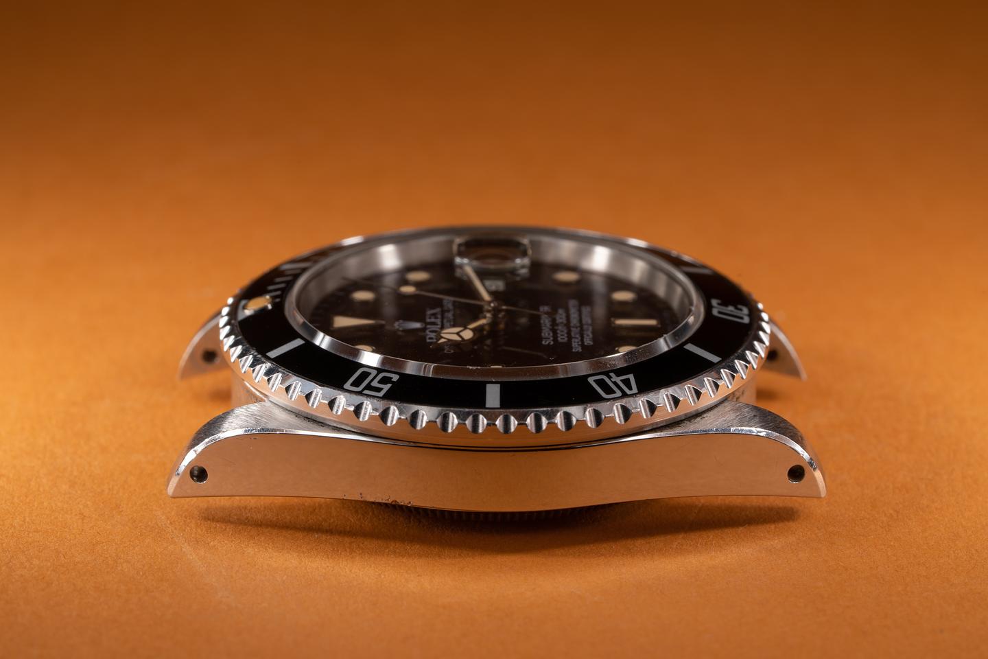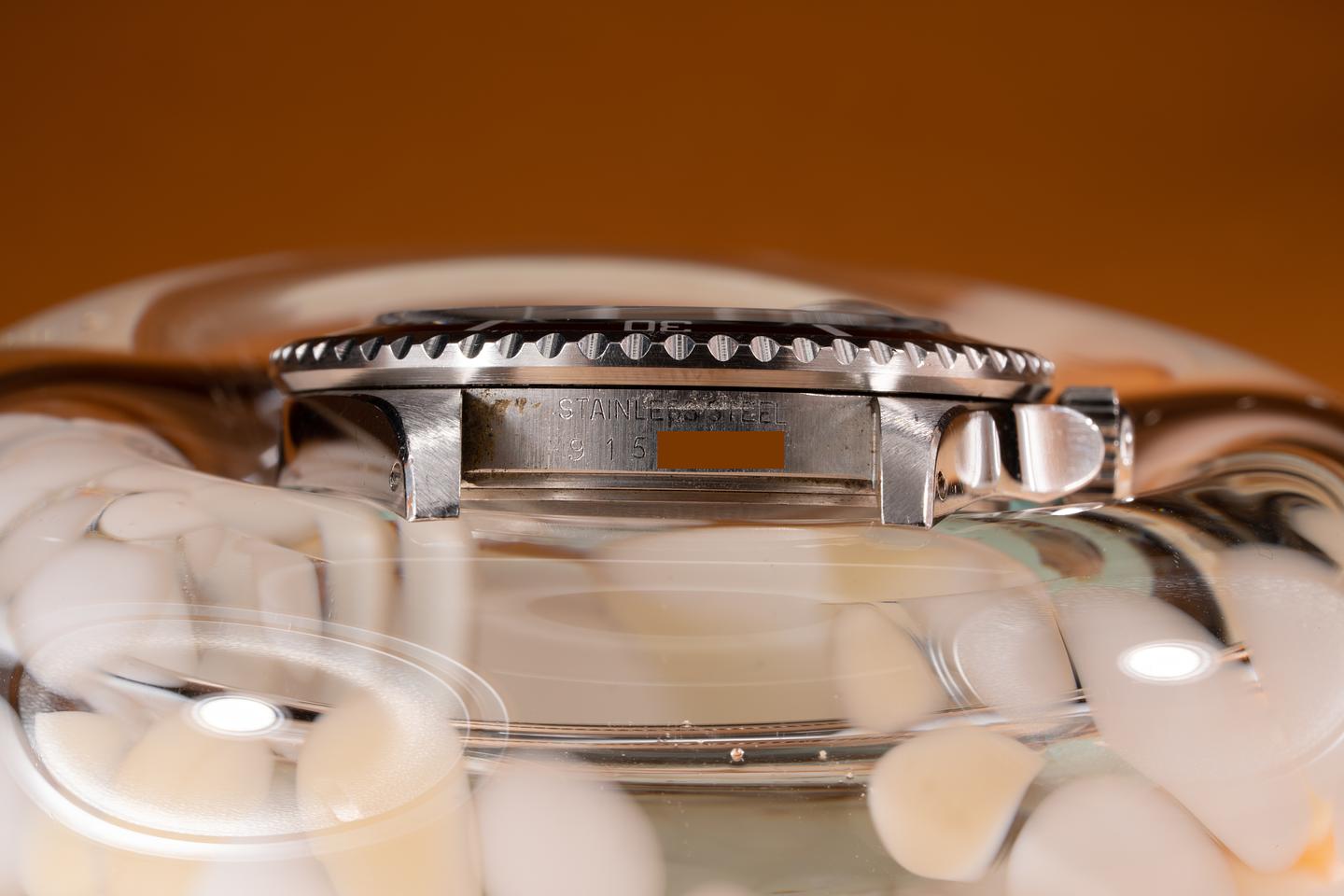 Case: The thick and even case appears to be unpolished showing sharp prominent factory bevels and some wear from use. The black bezel insert is also in excellent condition showing some light wear from use.