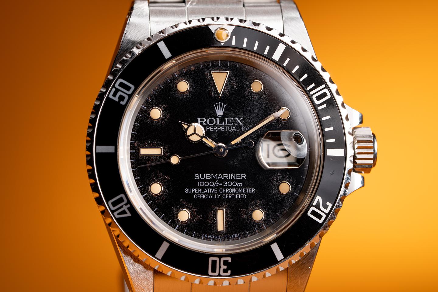 Dial: The glossy black white gold surround dial shows a speckled tropical patina beginning to form on the surface of the dial with more concentration around the markers. The lume has aged to a vibrant creamy hue and the hands match perfectly.