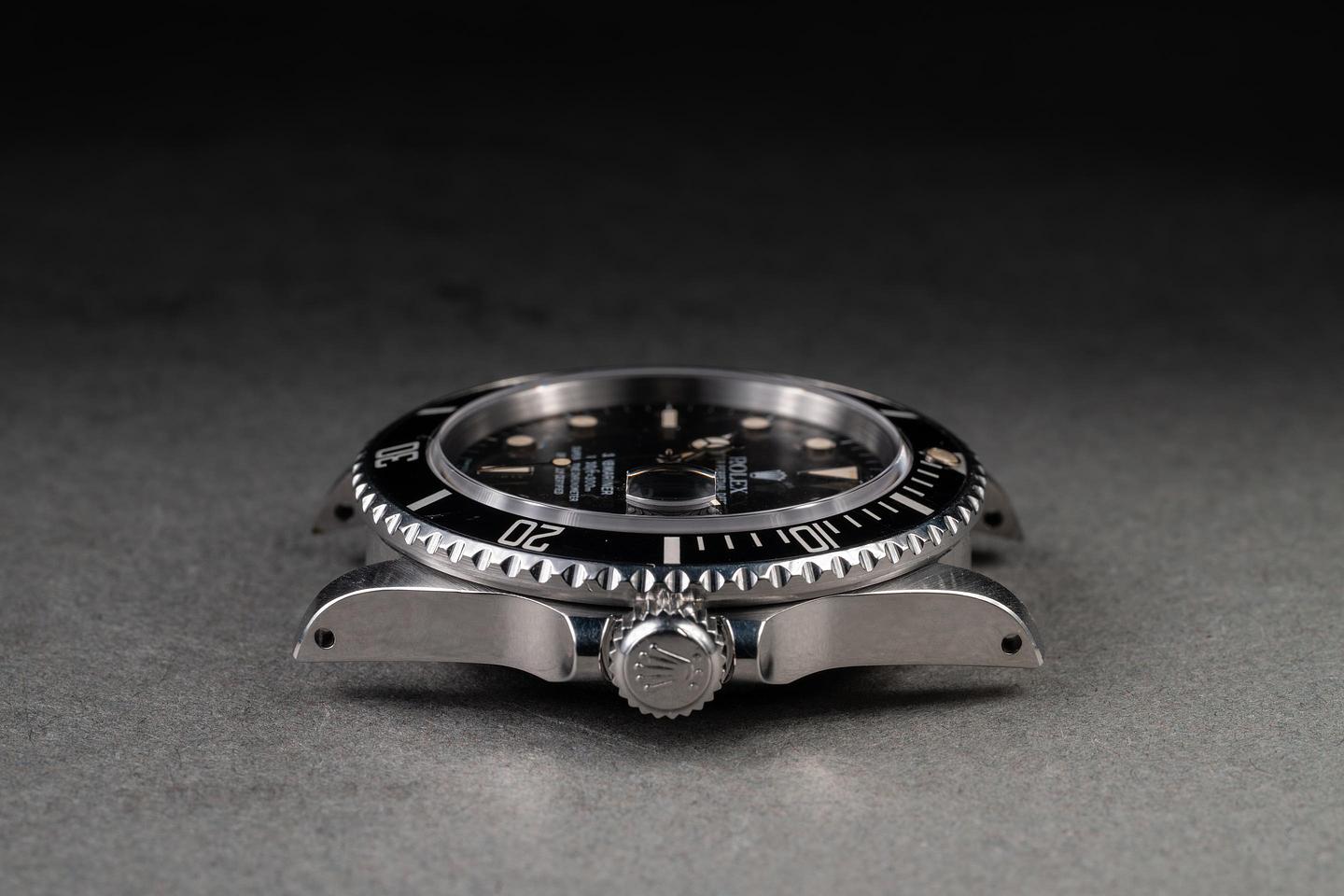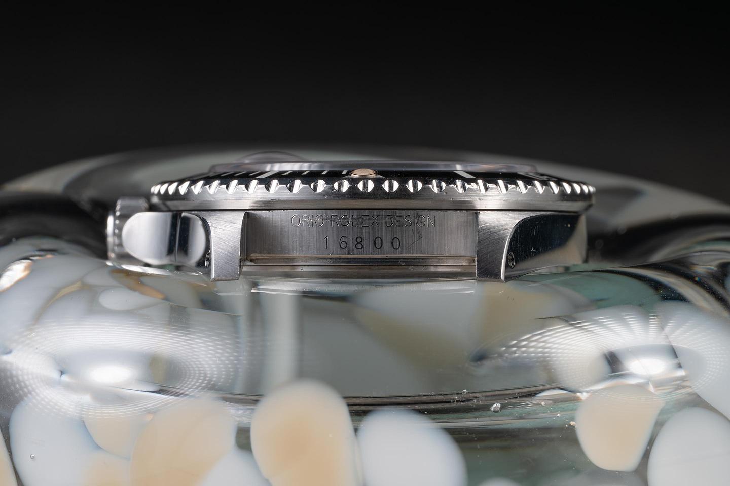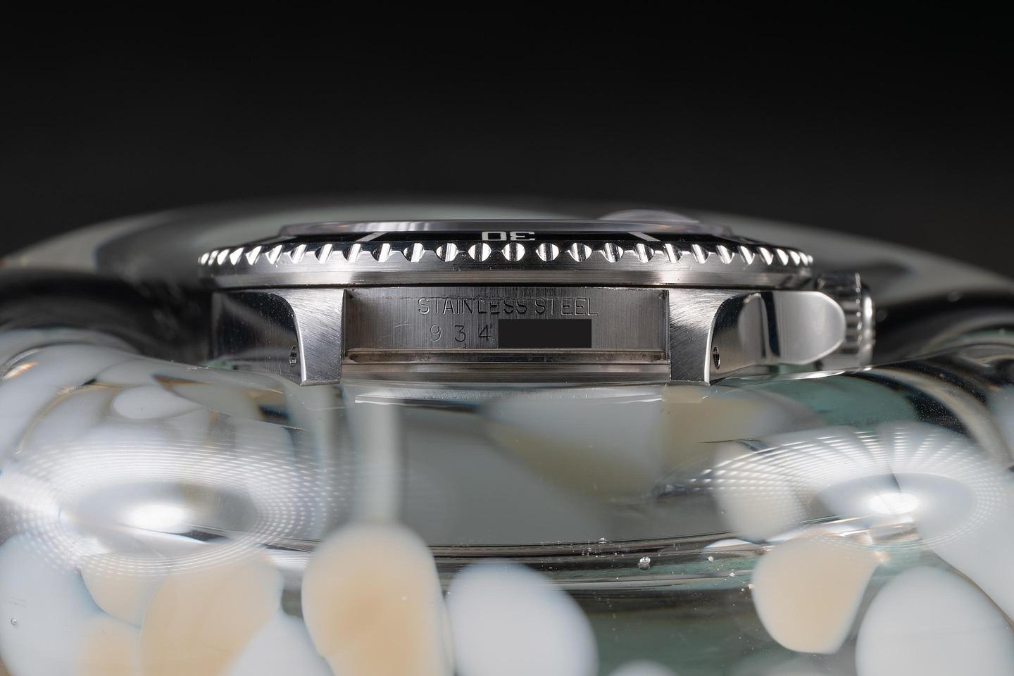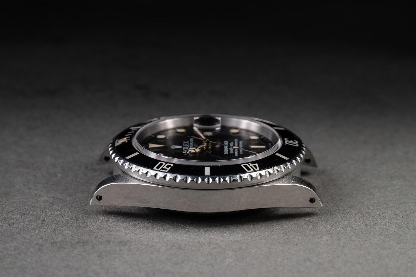 Case: The thick and even case is excellent, showing sharp, prominent bevels and only very light wear. The black bezel insert is also in excellent condition, showing some light wear from use.