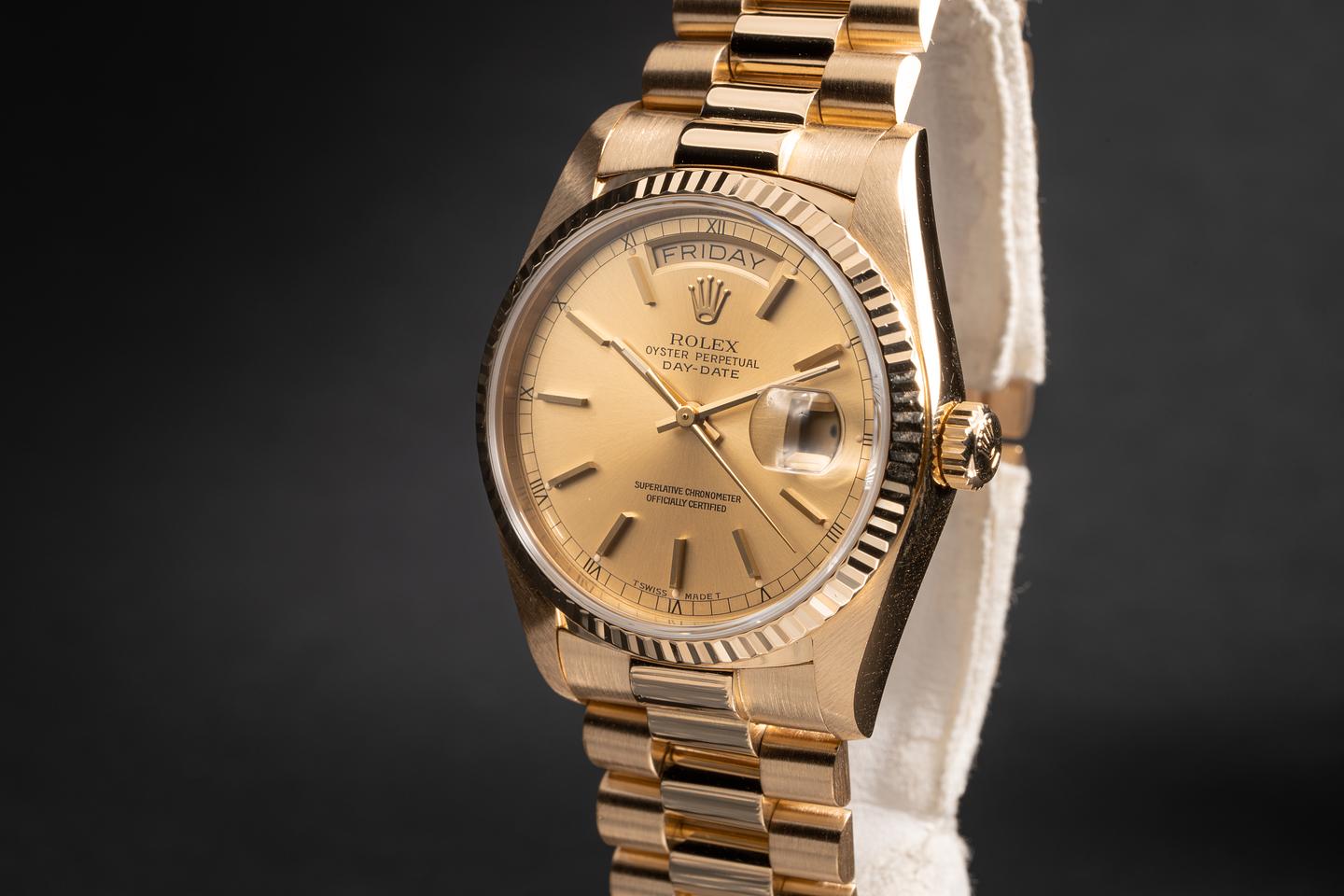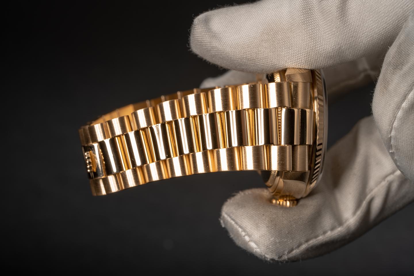 Bracelet: The 21 link 18k yellow gold president bracelet is excellent showing only light stretch for its age.